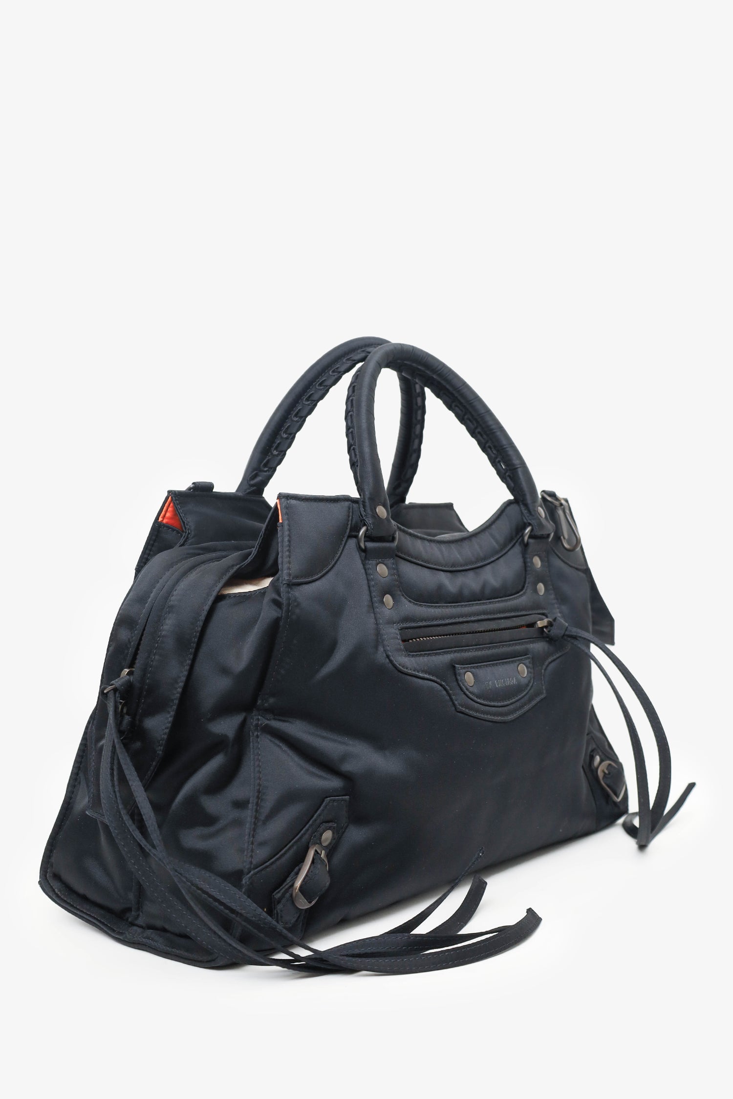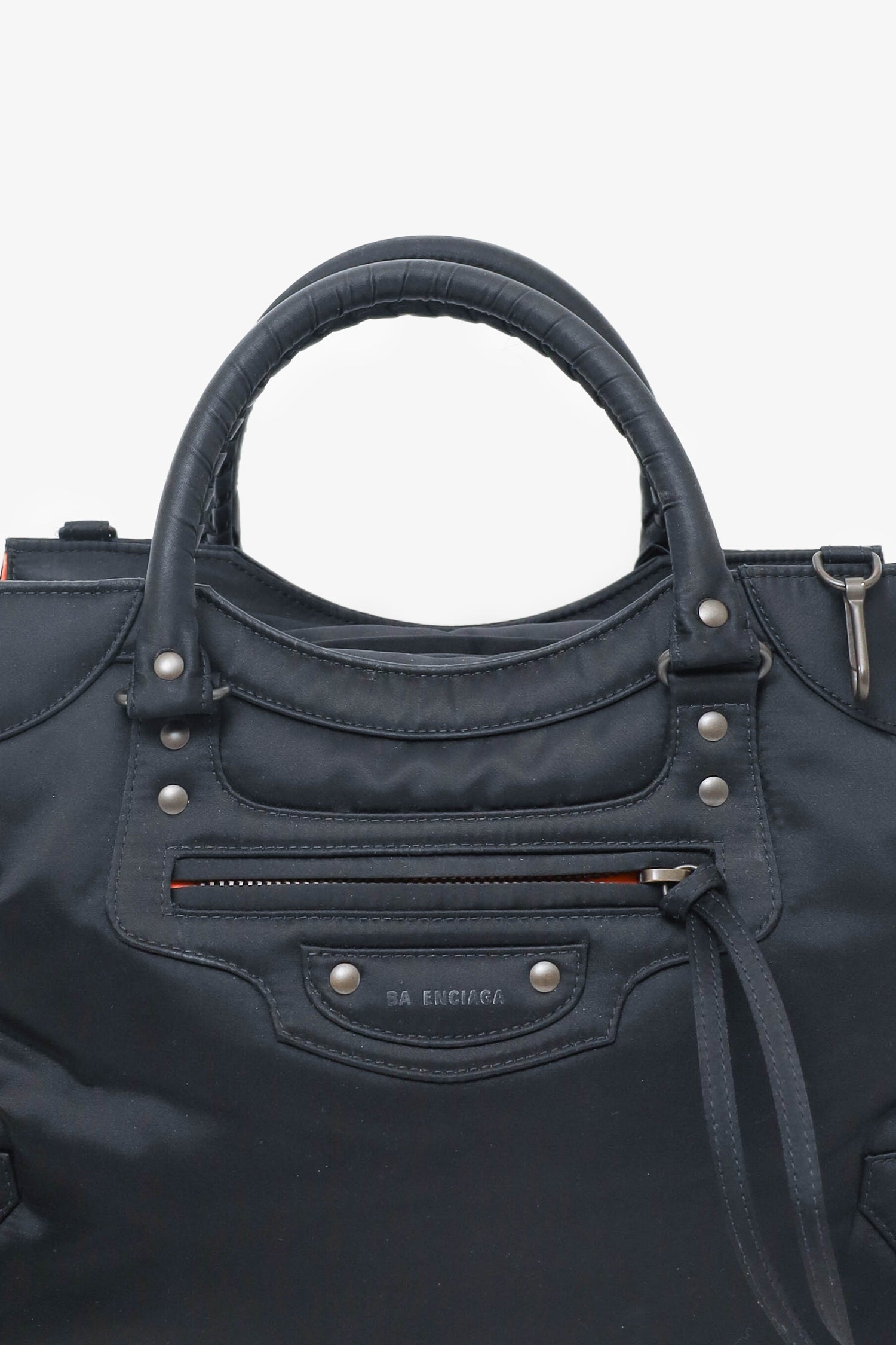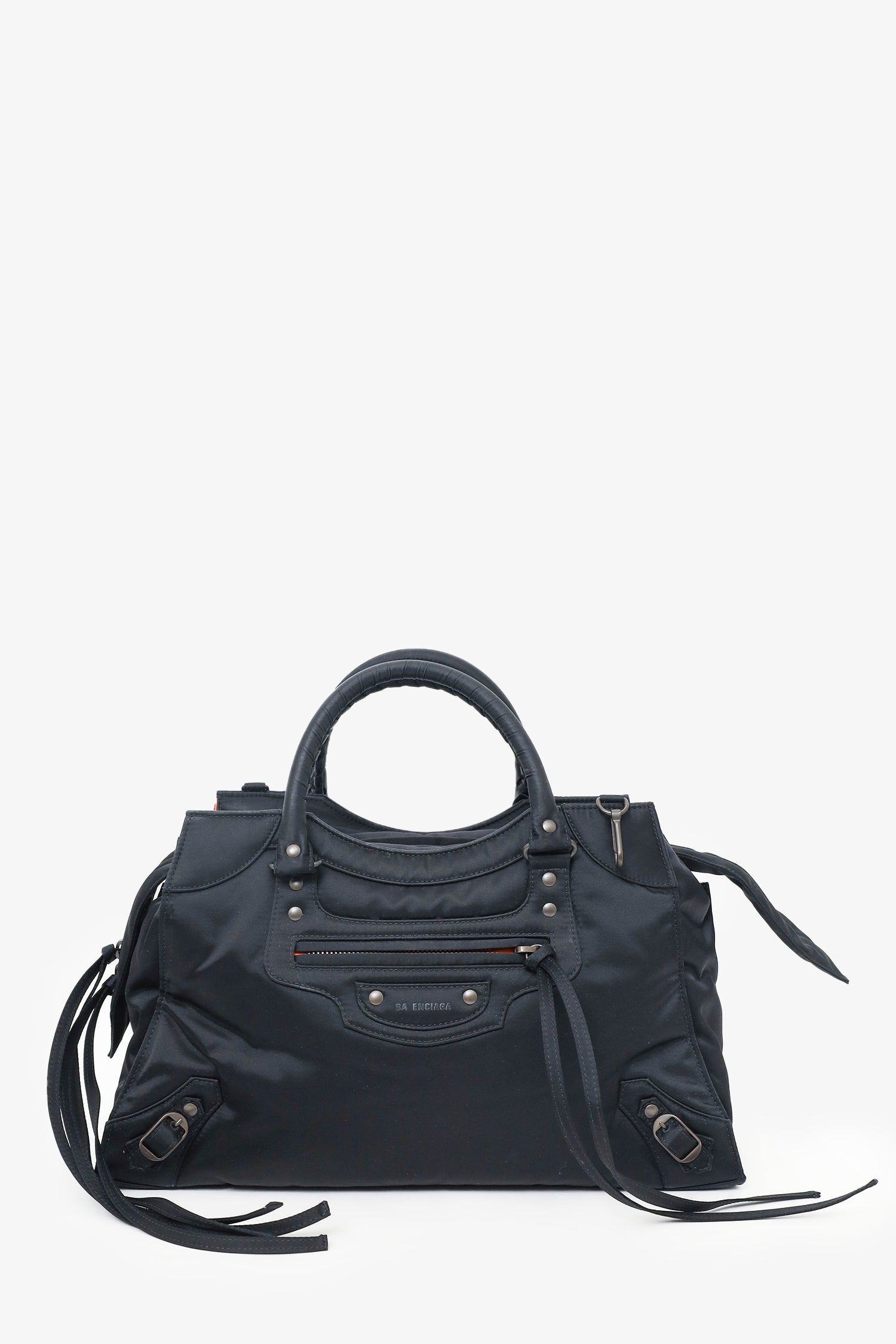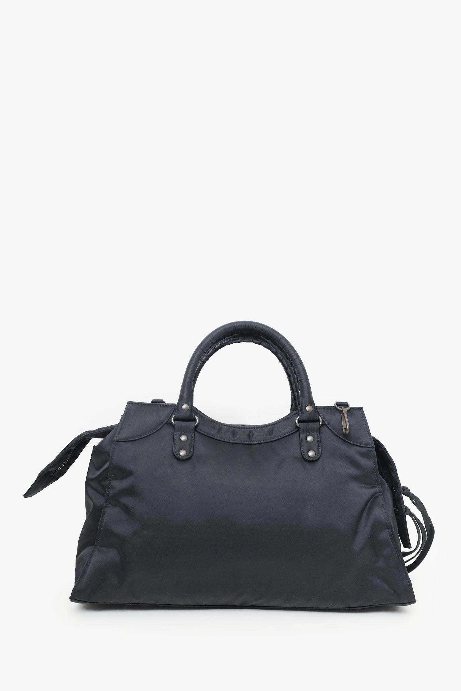 Balenciaga Black Nylon Neo Classic Medium Shoulder Bag. Dual top handles. Top zip closure. Open interior with 1 rear slip pocket. Front exterior pocket with zip closure. 2 exterior d-rings. Dark-metal tone hardware. Tonal stitching. Inclusions: removable/adjustable crossbody strap.