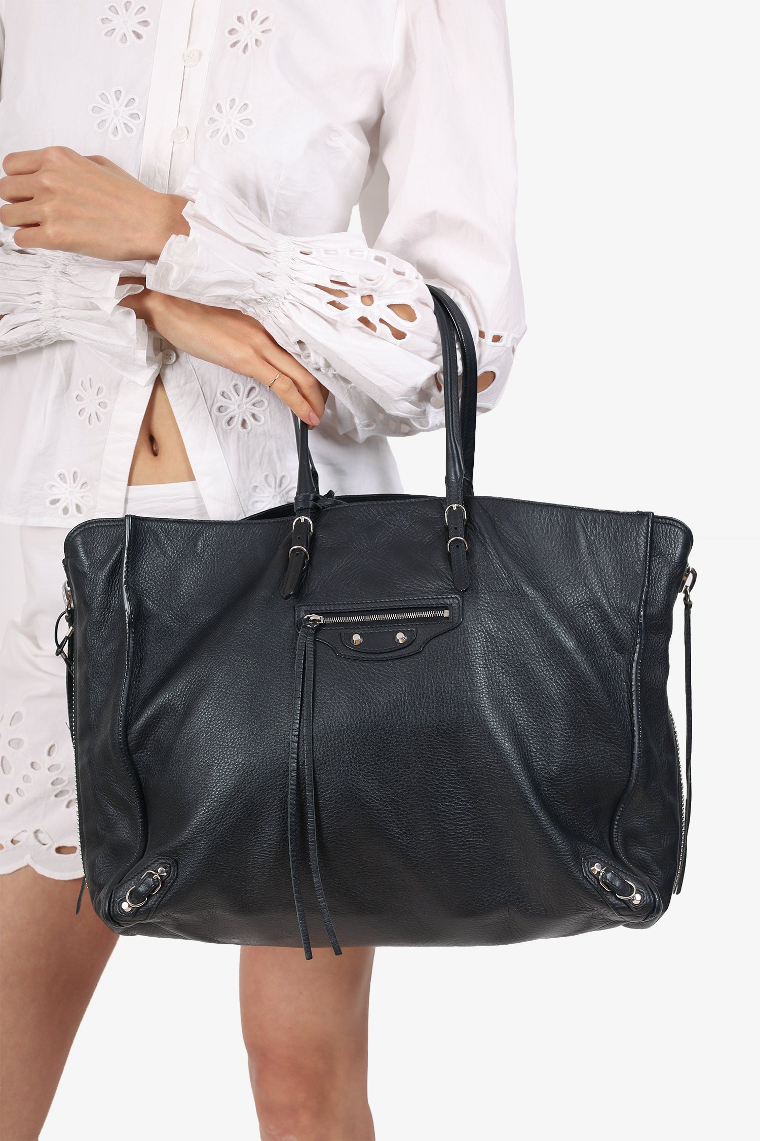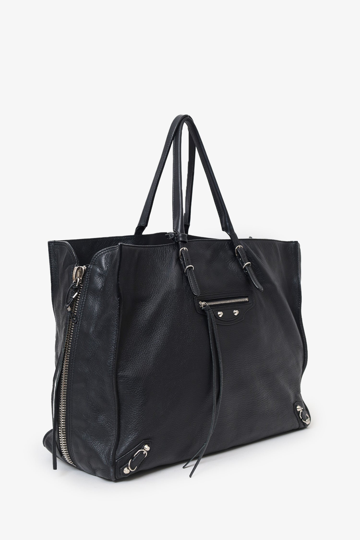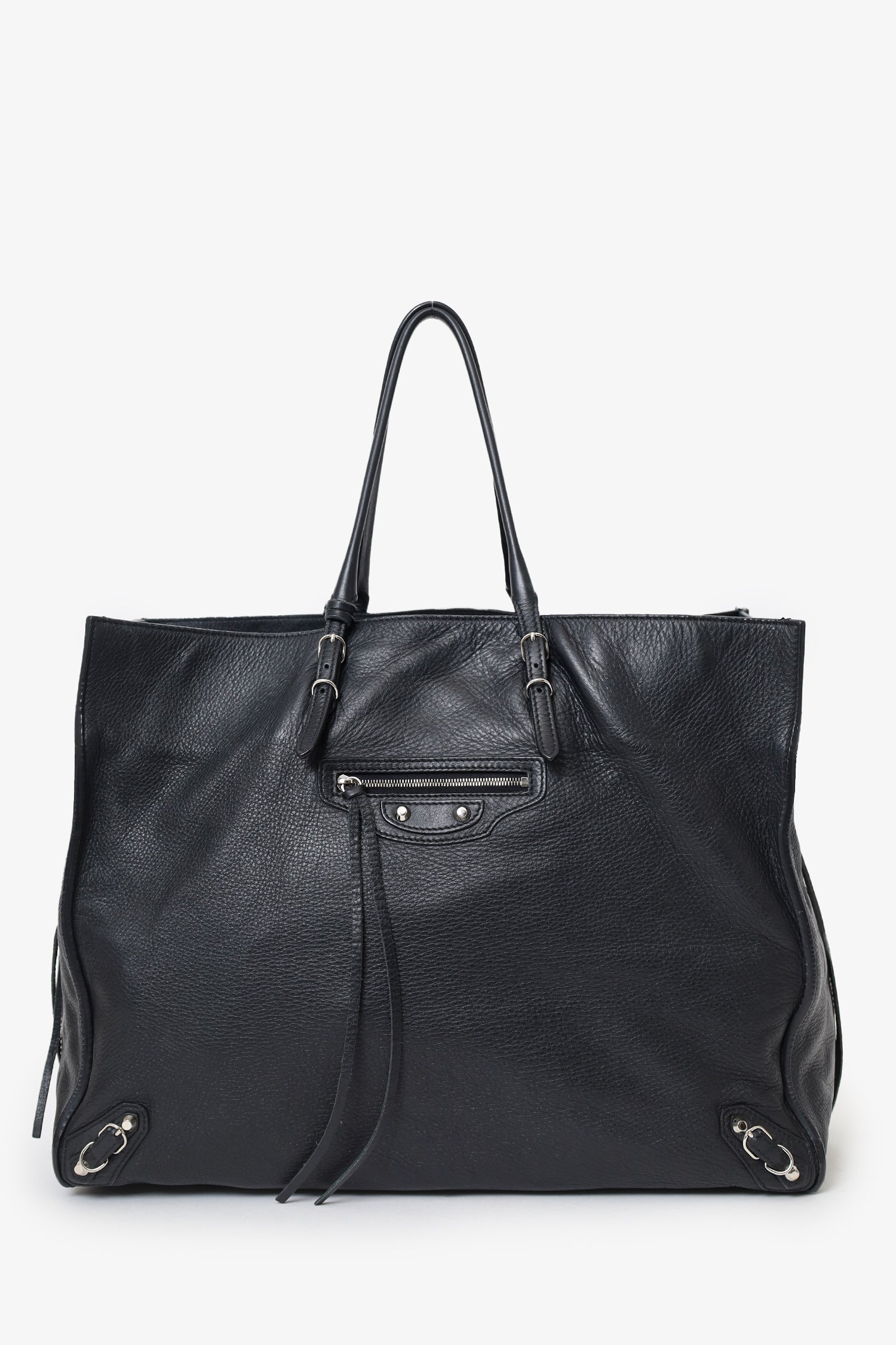 Refresh availabilityBalenciaga Black 'Papier' Medium Tote Bag. Top open. Adjustable twin top handle with buckle closure. Single exterior zip pocket. Exterior expandable side zip closure. Lined interior. 2 rear interior slip pockets. Removable bag tag with mirror. Silver-tone hardware. Tonal stitching.