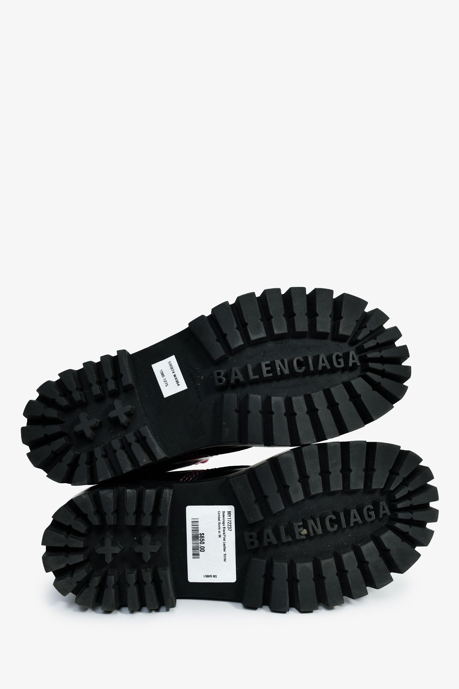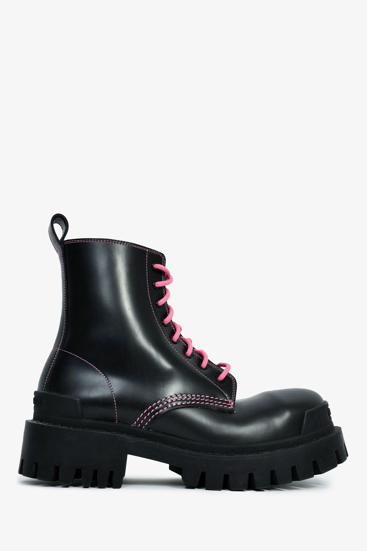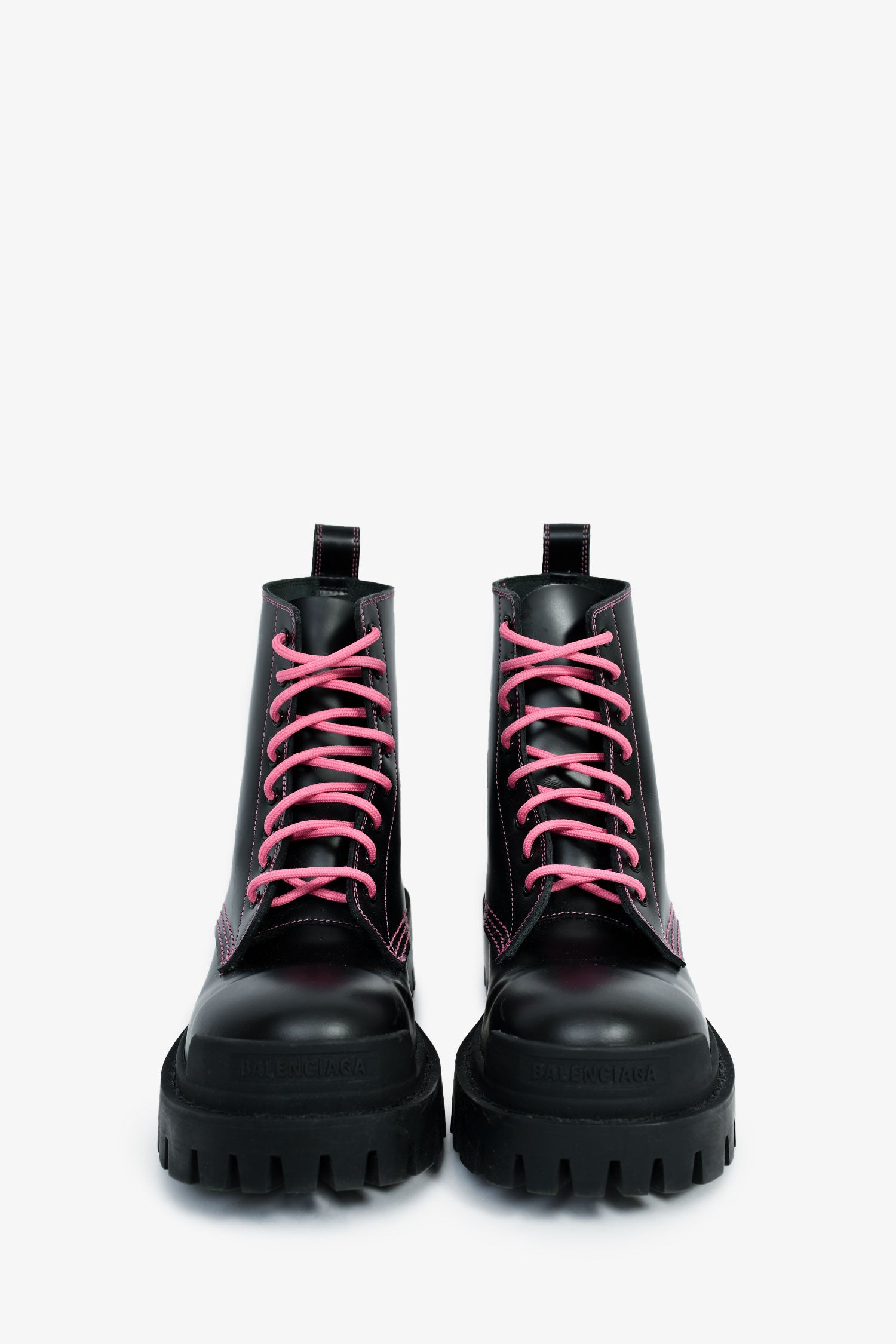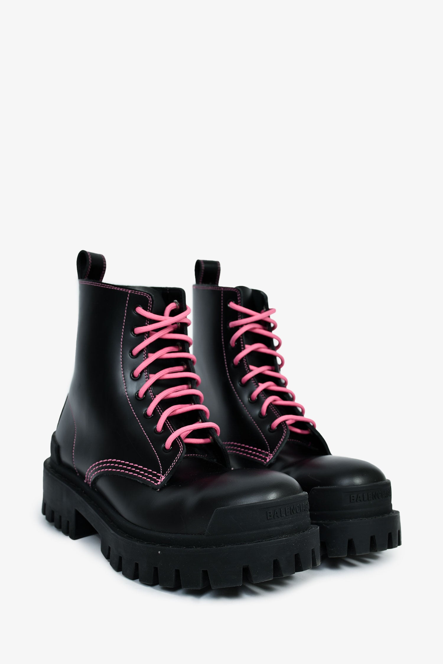 Refresh availabilityBalenciaga Black/Pink Leather 'Strike' Combat Boots. Round toe. Pink-tone lace-up closure. Treaded soles. Tonal stitching.