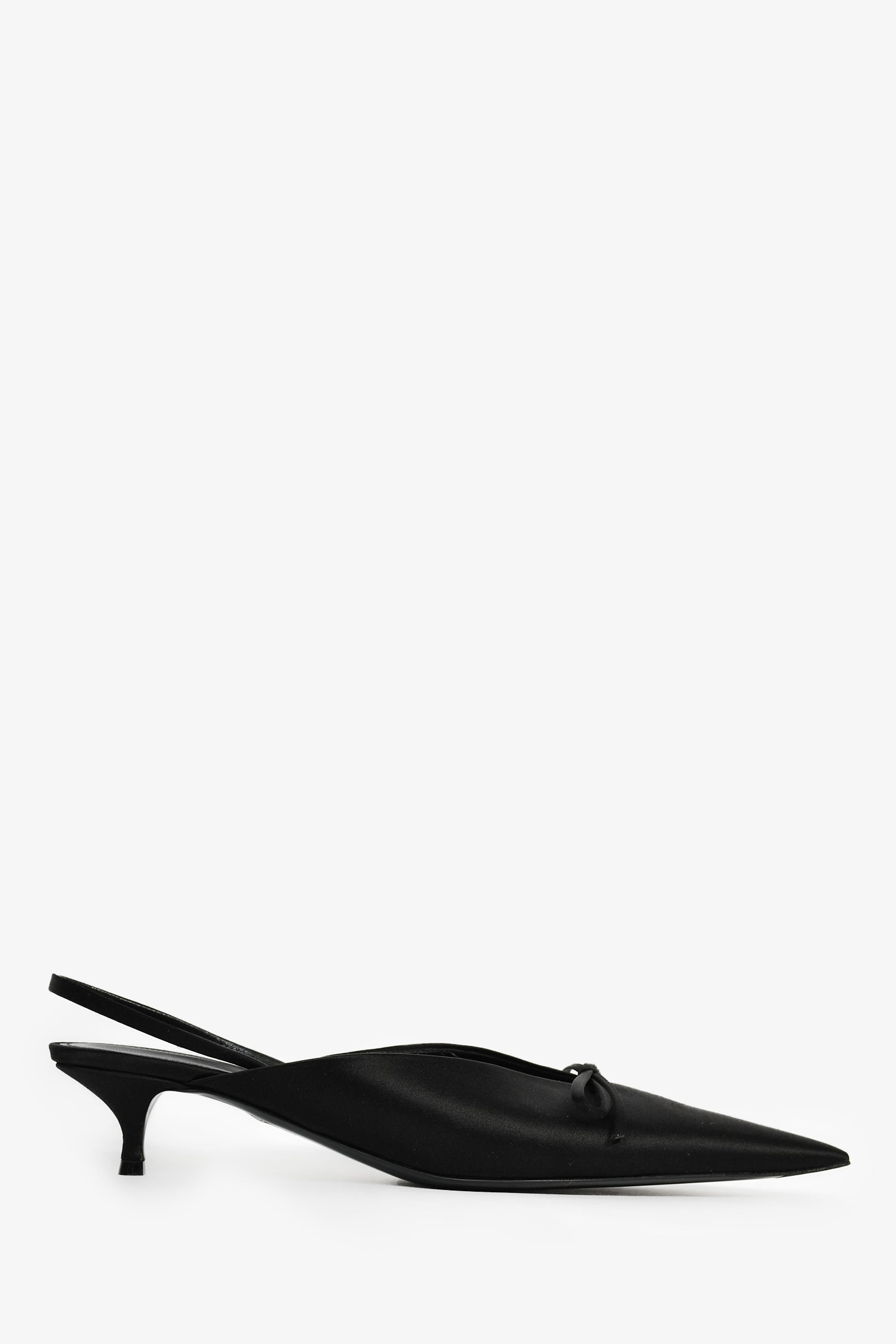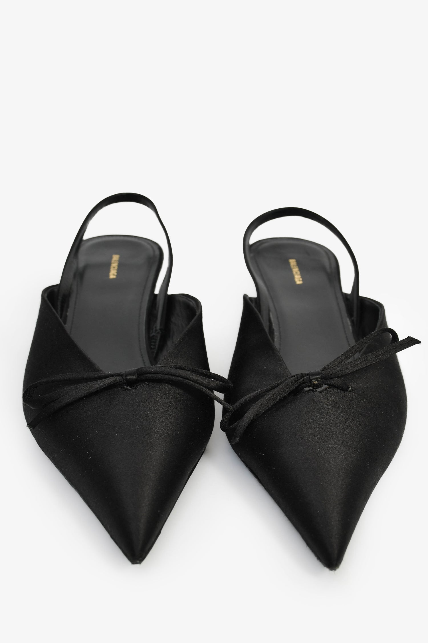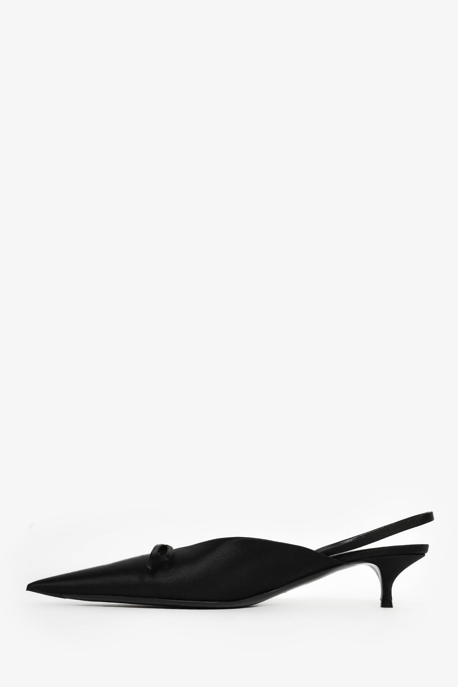 Refresh availabilityBalenciaga Black Satin Bow Knife Slingback Kitten Heels. Slip-on. Pointed toe. Patent sole. Leather insole. Tonal stitching.
