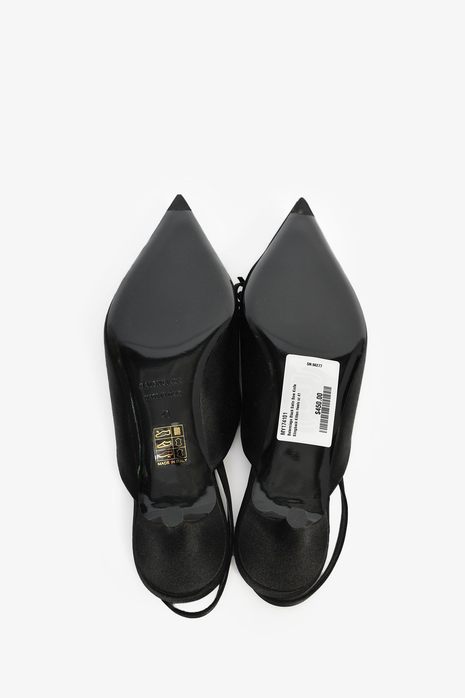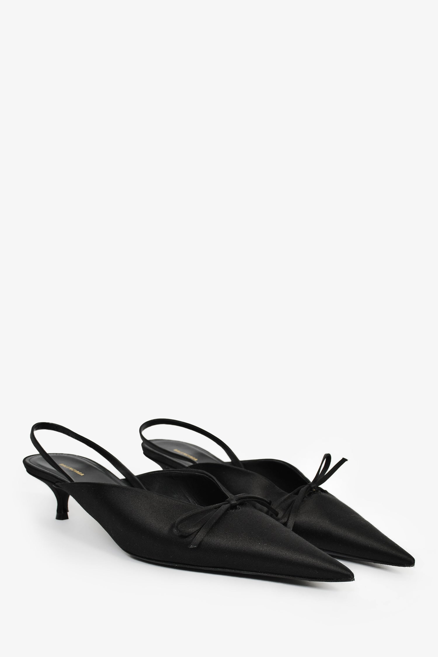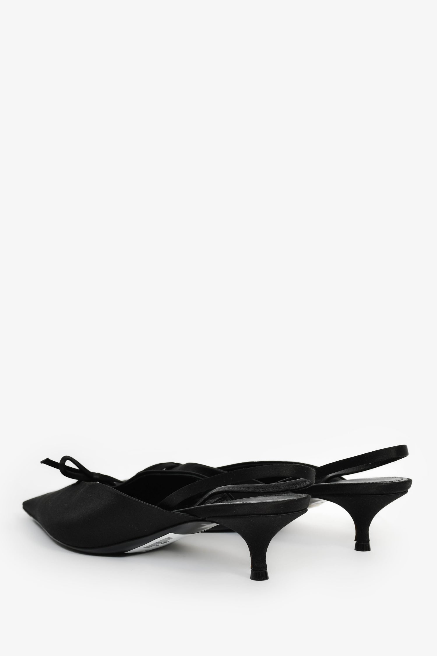 Refresh availabilityBalenciaga Black Satin Bow Knife Slingback Kitten Heels. Slip-on. Pointed toe. Patent sole. Leather insole. Tonal stitching.