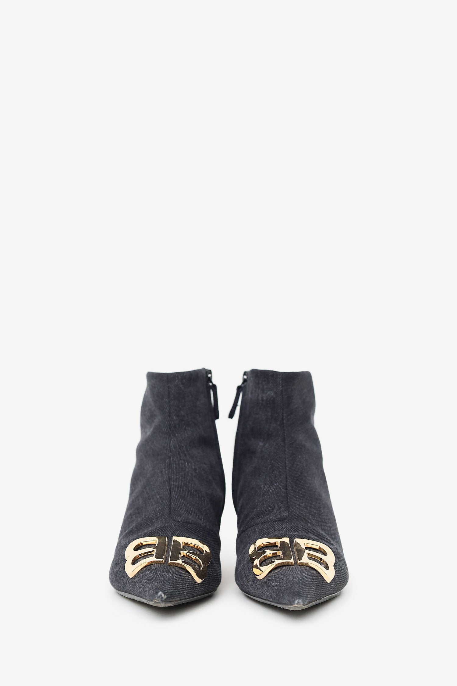 Refresh availabilityBalenciaga Black Wash Denim 'BB' Knife Heeled Ankle Boots. Pull-on. Side zip closure. Pointed toe. Gold-tone hardware. Tonal stitching.
