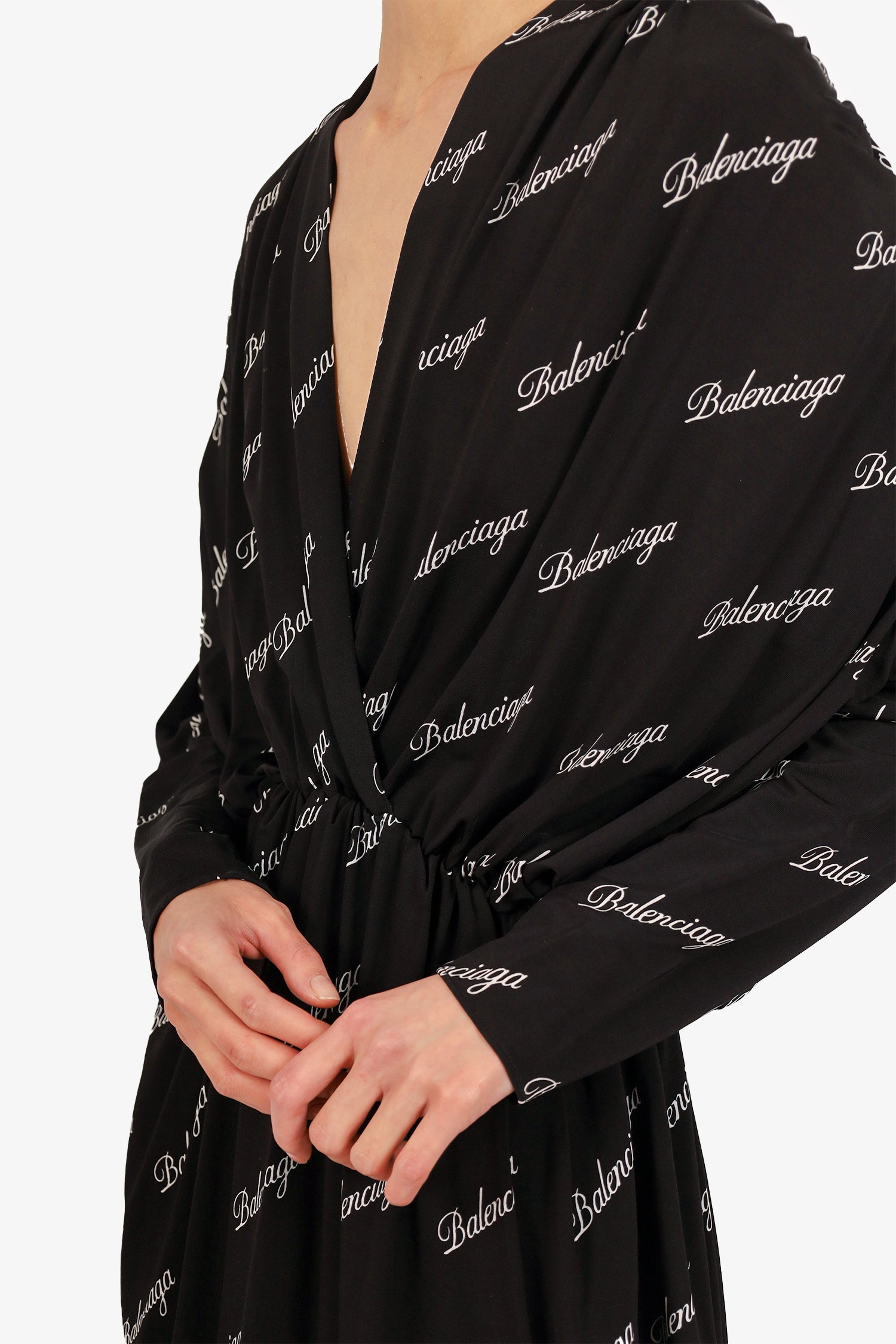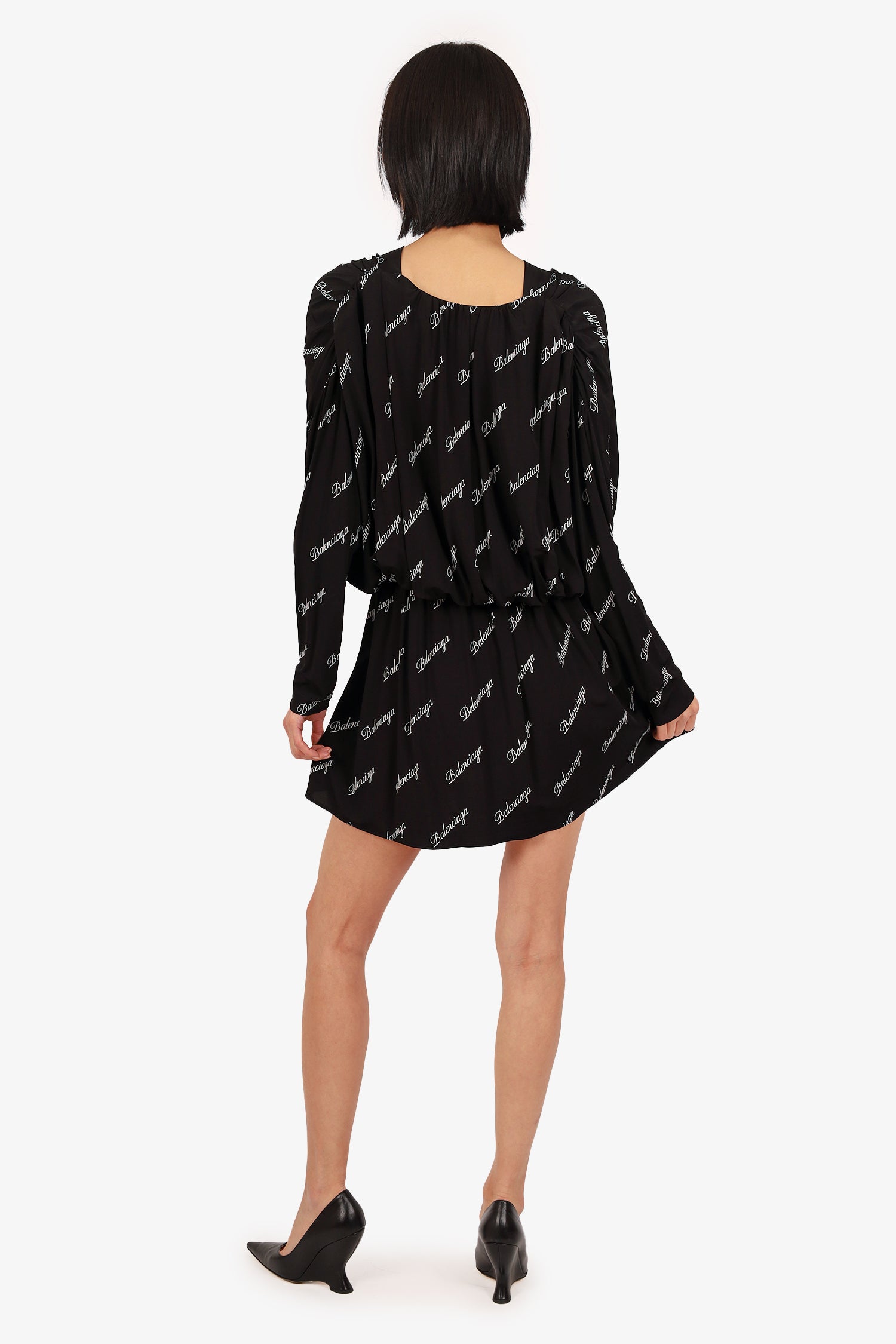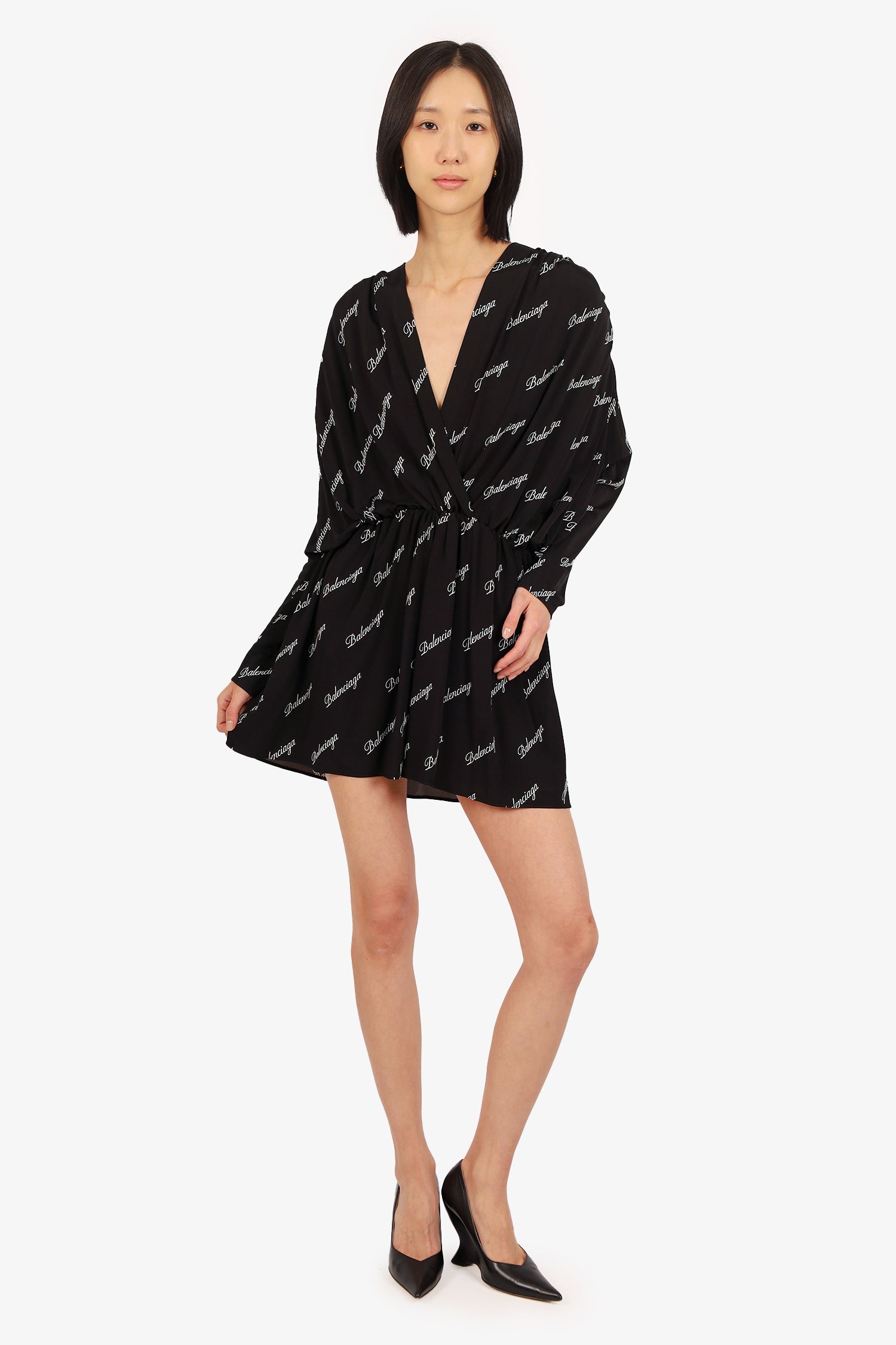 Refresh availabilityBalenciaga Black/White Logo V-Neck Long Sleeve Mini Dress. Slip-on. Unlined. Tonal stitching.