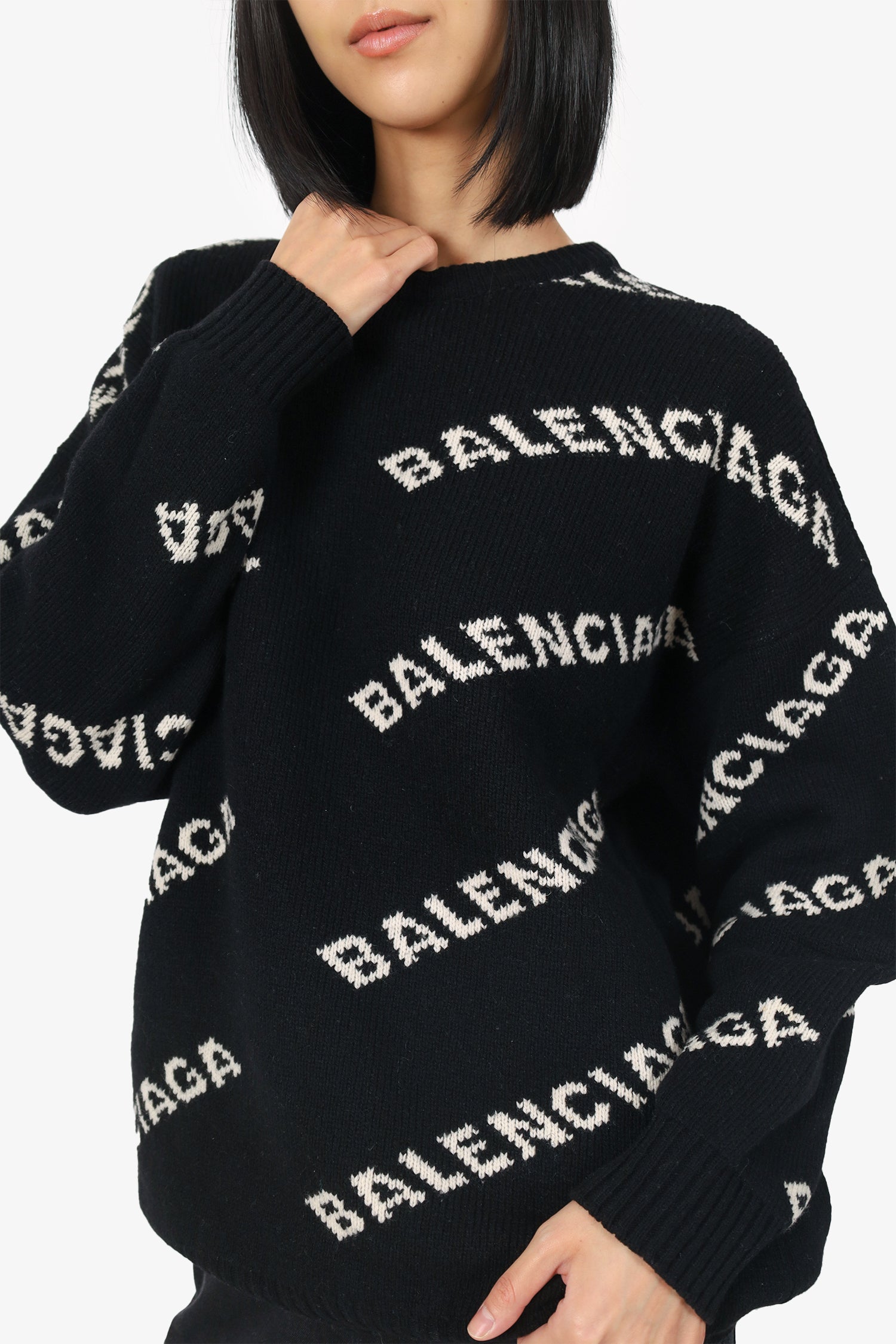 Refresh availabilityBalenciaga Black/White Logo All Over Sweater. Pull-on. Round neckline. Tonal stitching.