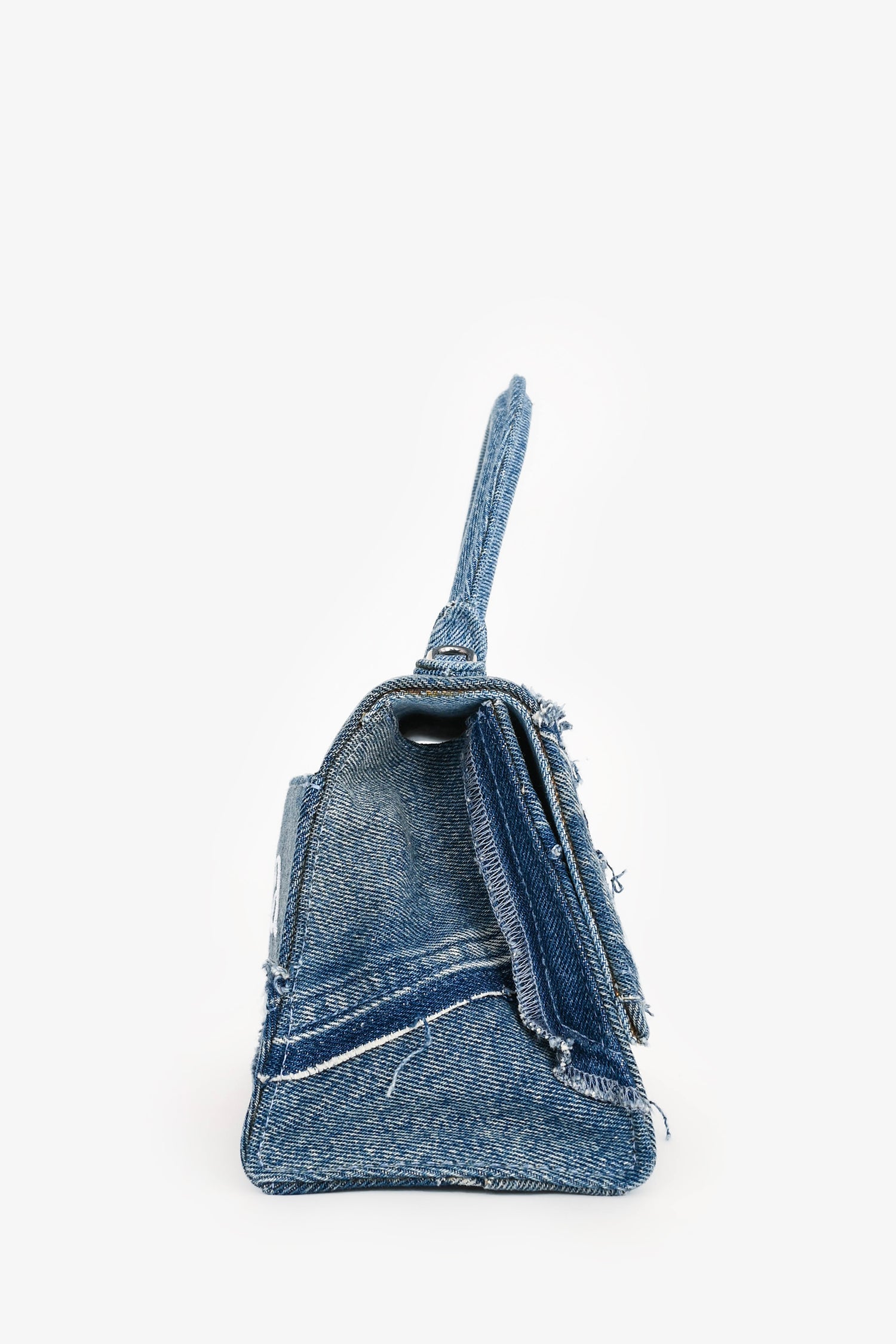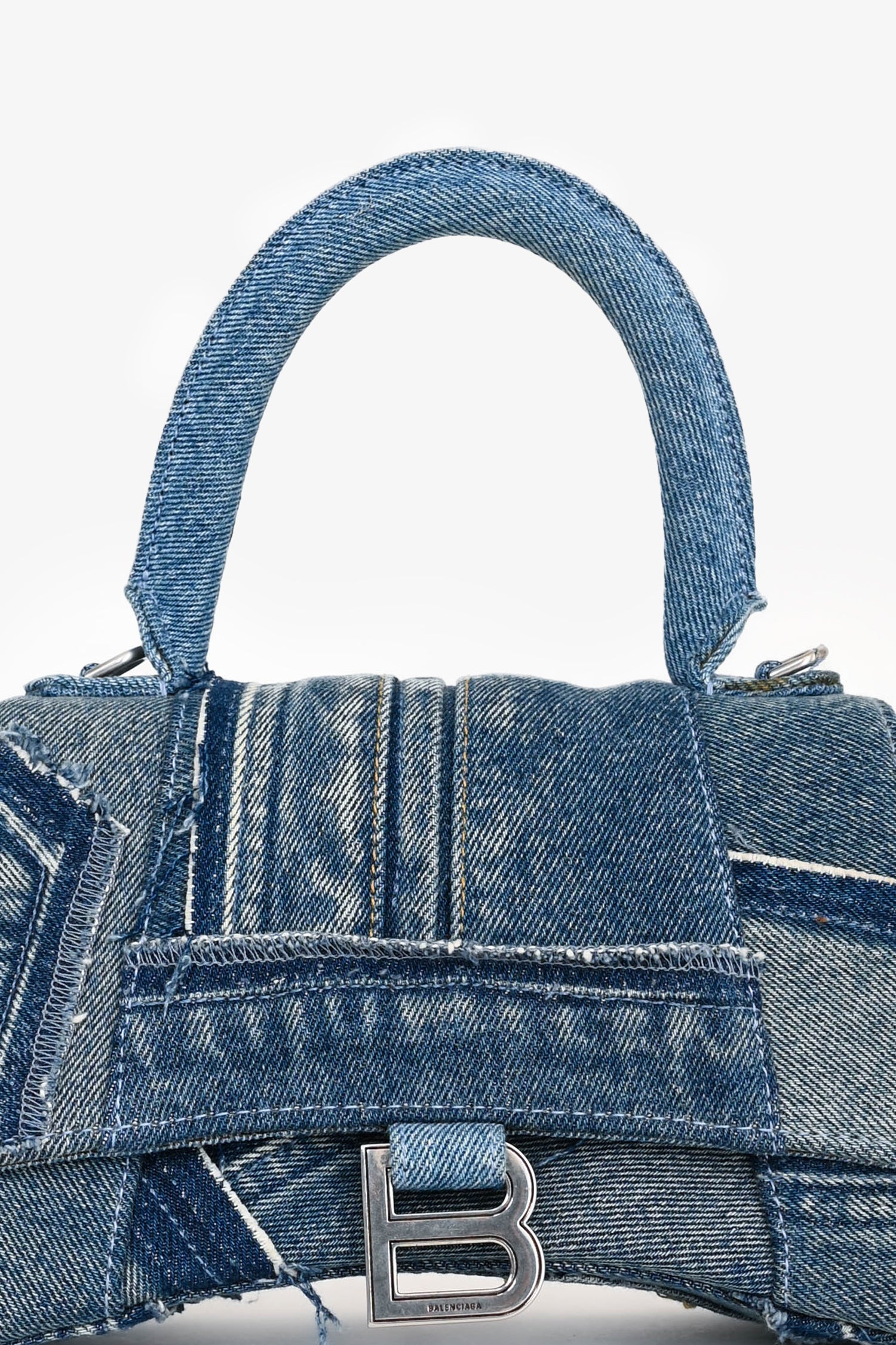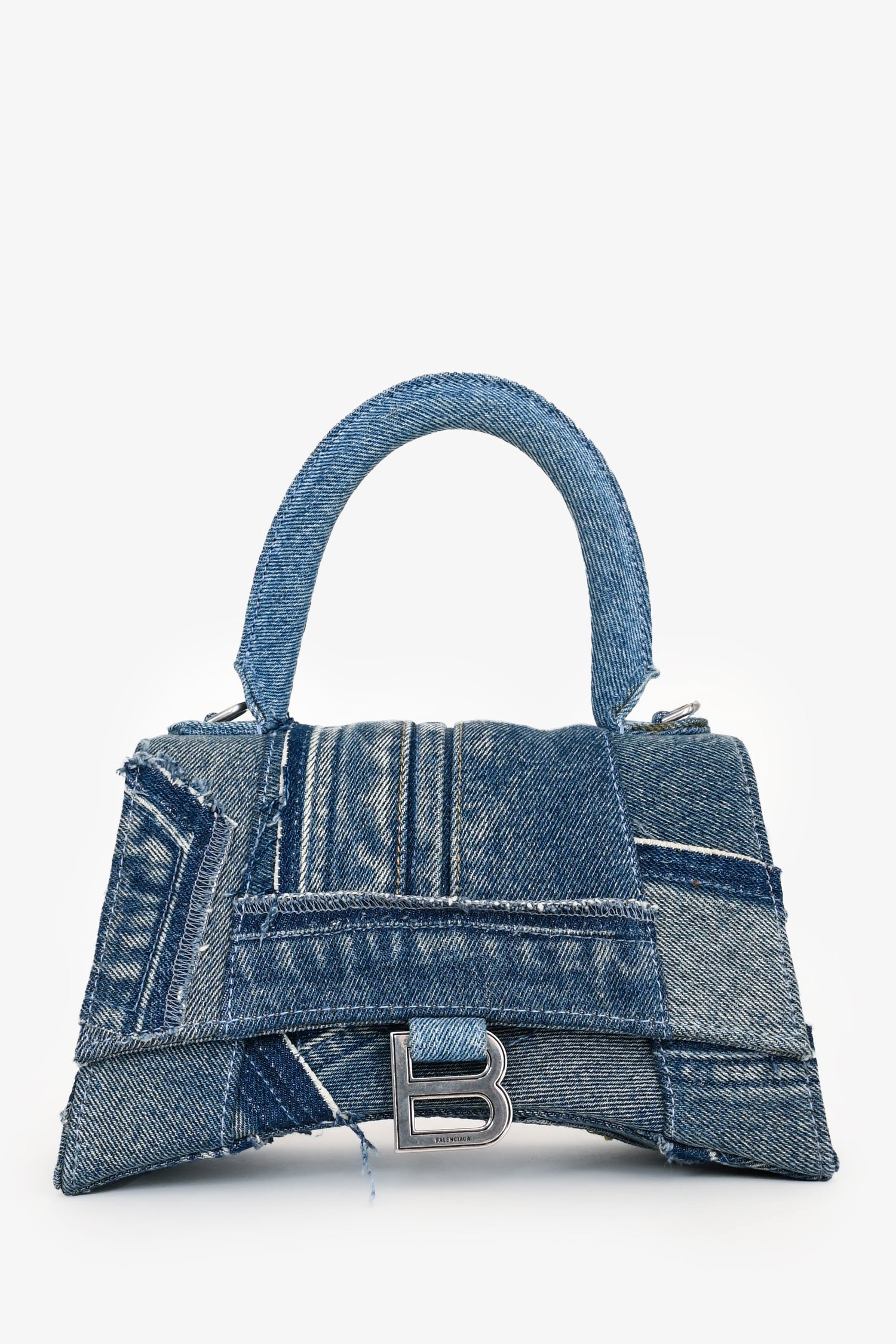 Refresh availabilityBalenciaga Blue Denim Patched Logo Embroidered Hourglass Bag with Strap. Top handle. Front fold-over flap with magnetic button closure. Black textile interior lining. Single interior wall zip pocket. Detachable and adjustable strap. Silver-tone hardware. Exterior rear slip pocket. Tonal stitching