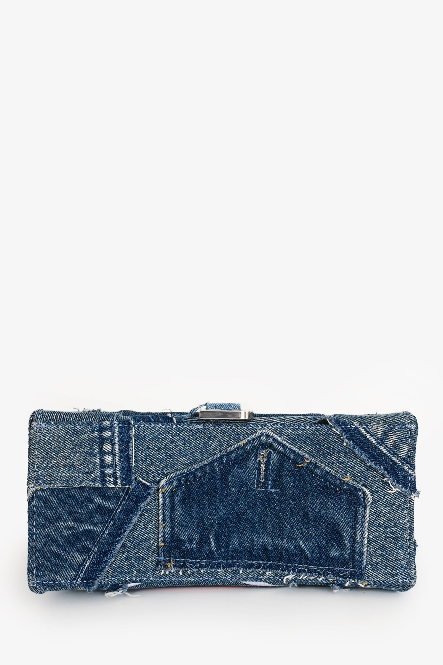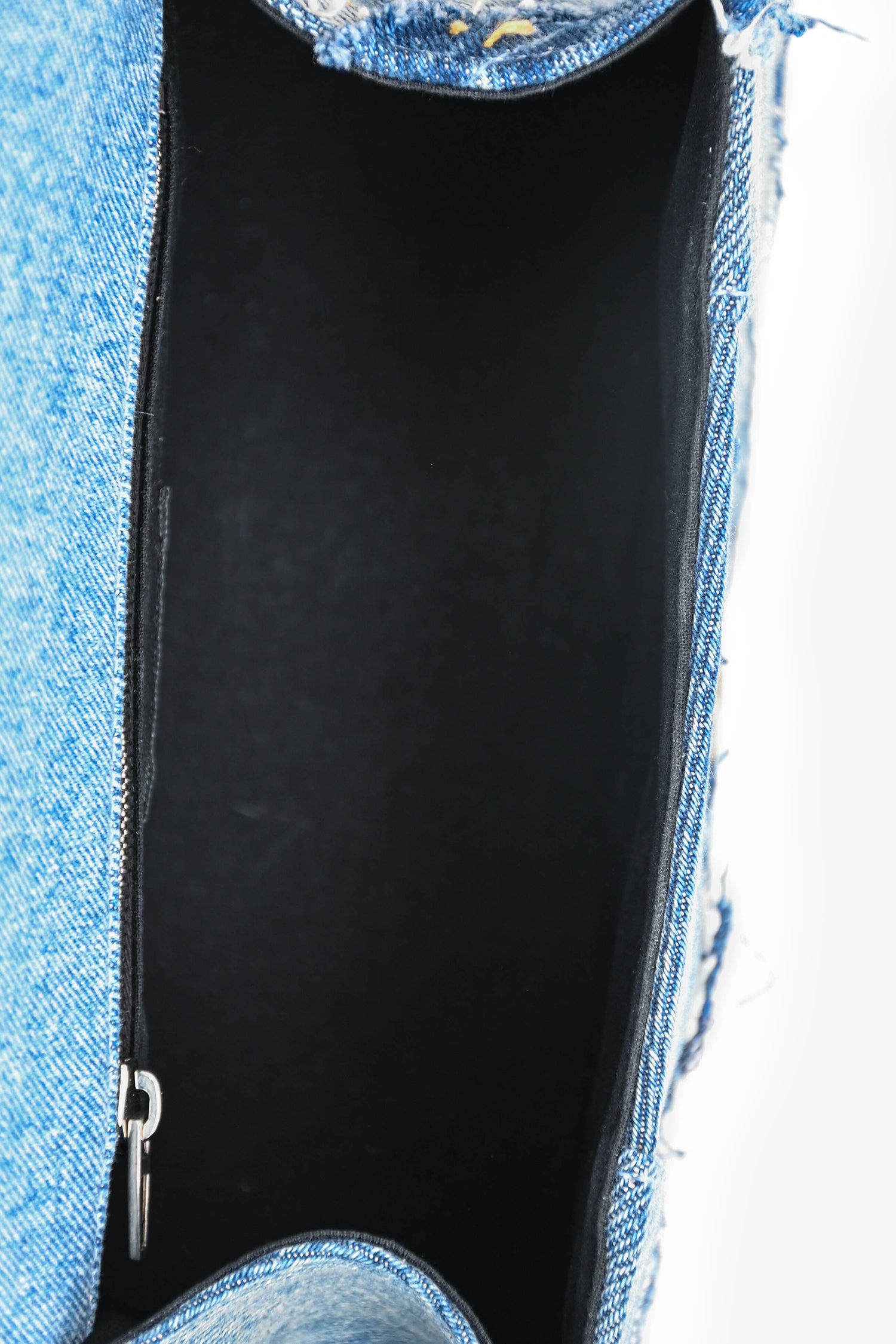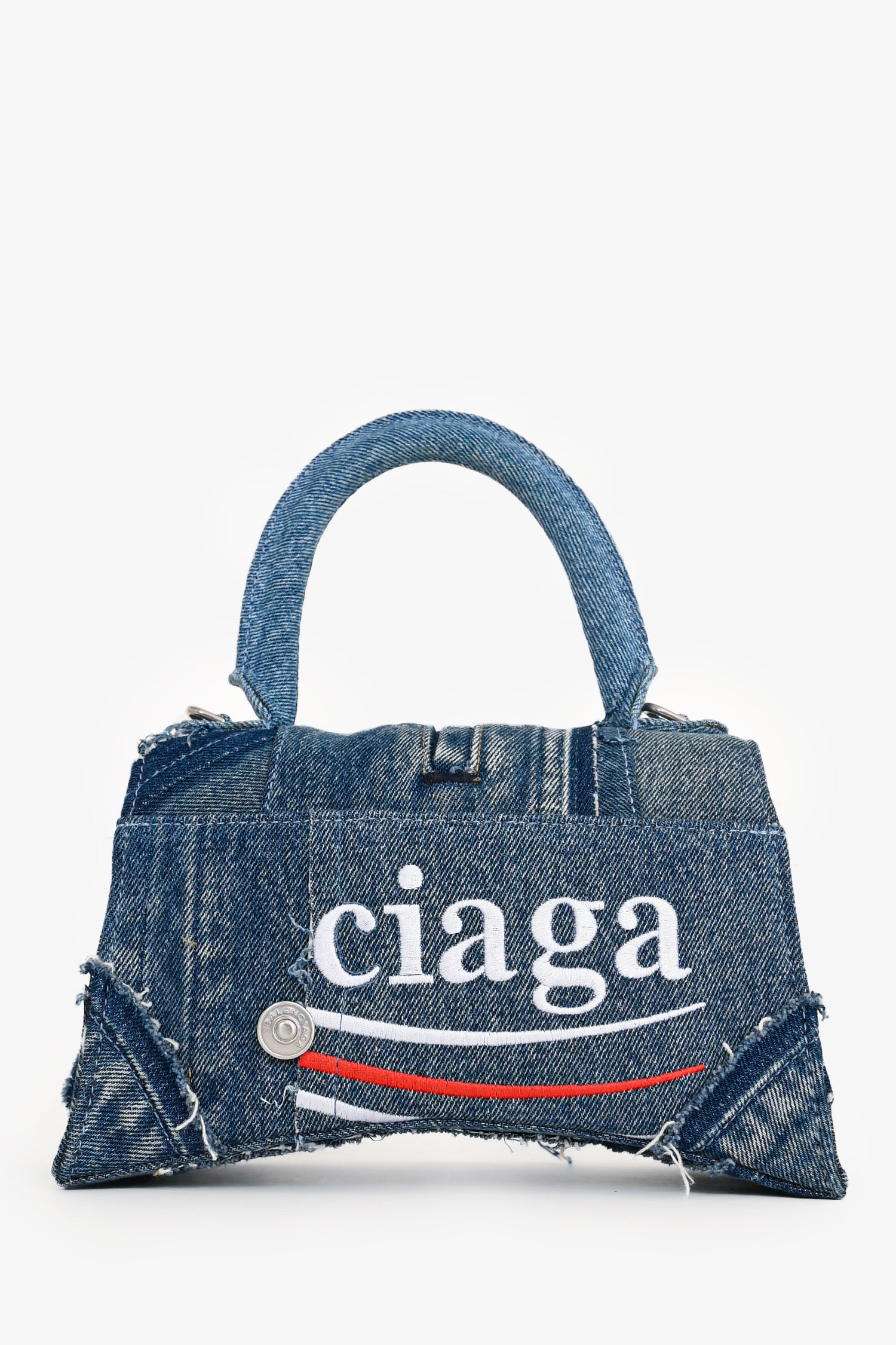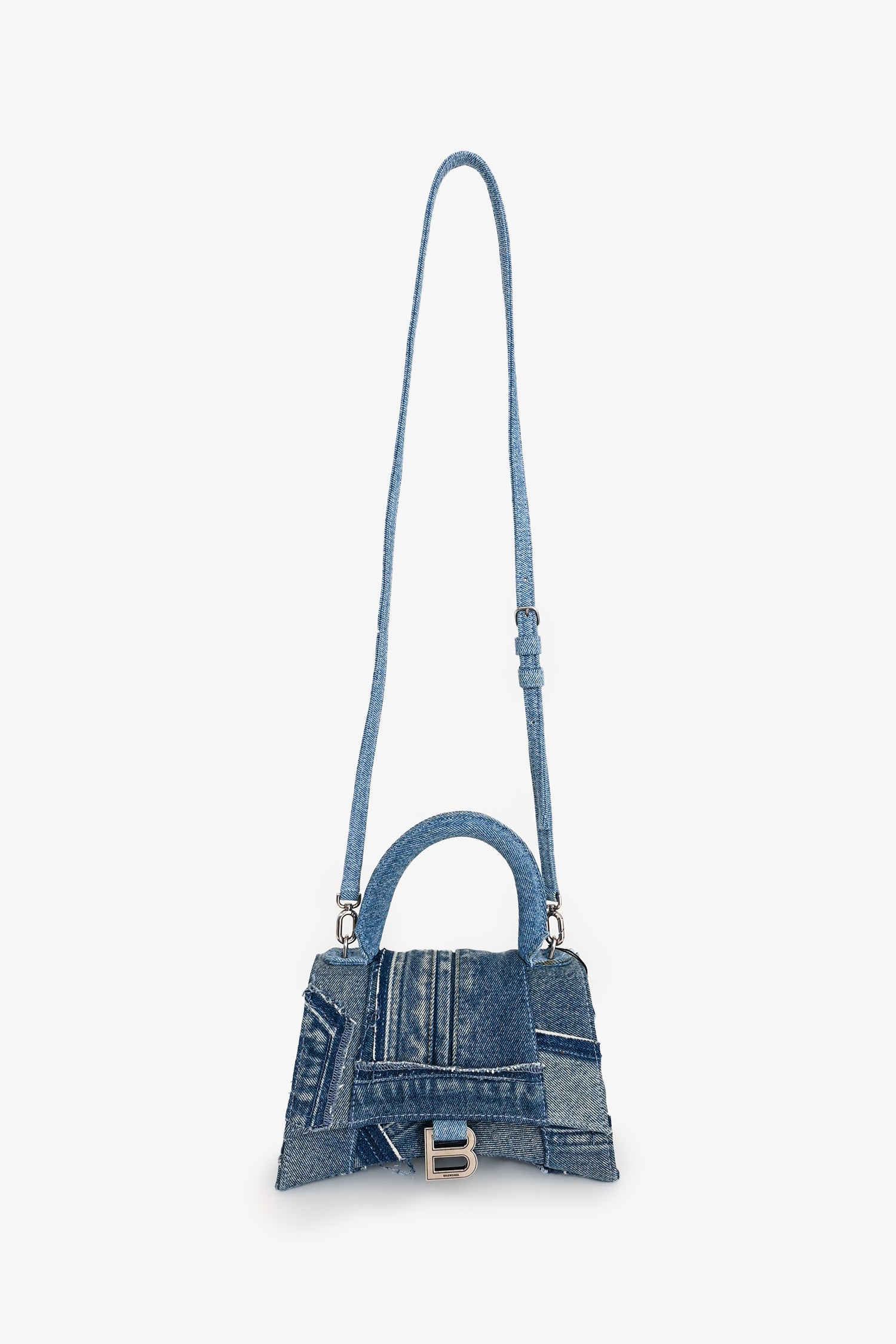 Refresh availabilityBalenciaga Blue Denim Patched Logo Embroidered Hourglass Bag with Strap. Top handle. Front fold-over flap with magnetic button closure. Black textile interior lining. Single interior wall zip pocket. Detachable and adjustable strap. Silver-tone hardware. Exterior rear slip pocket. Tonal stitching