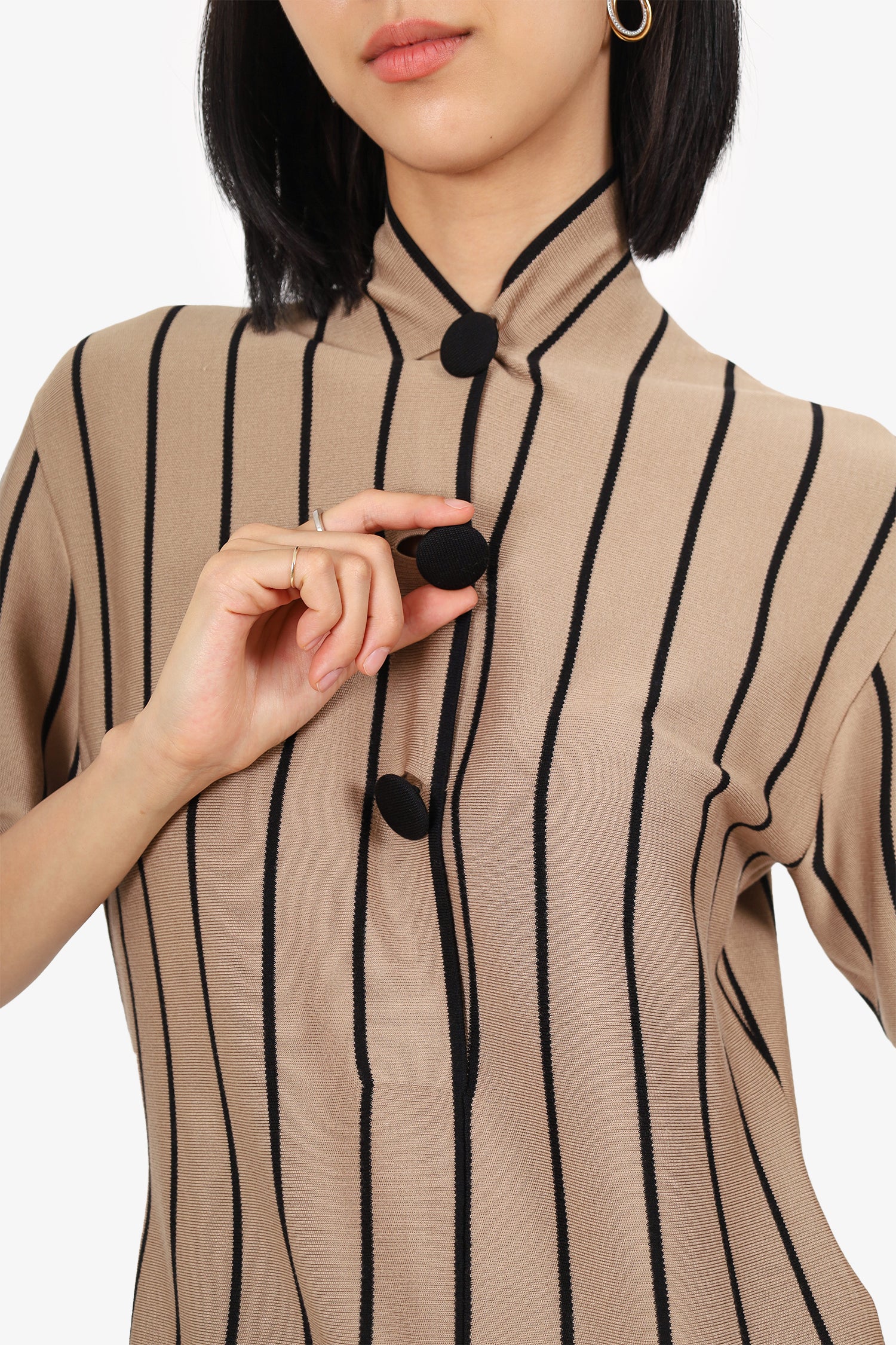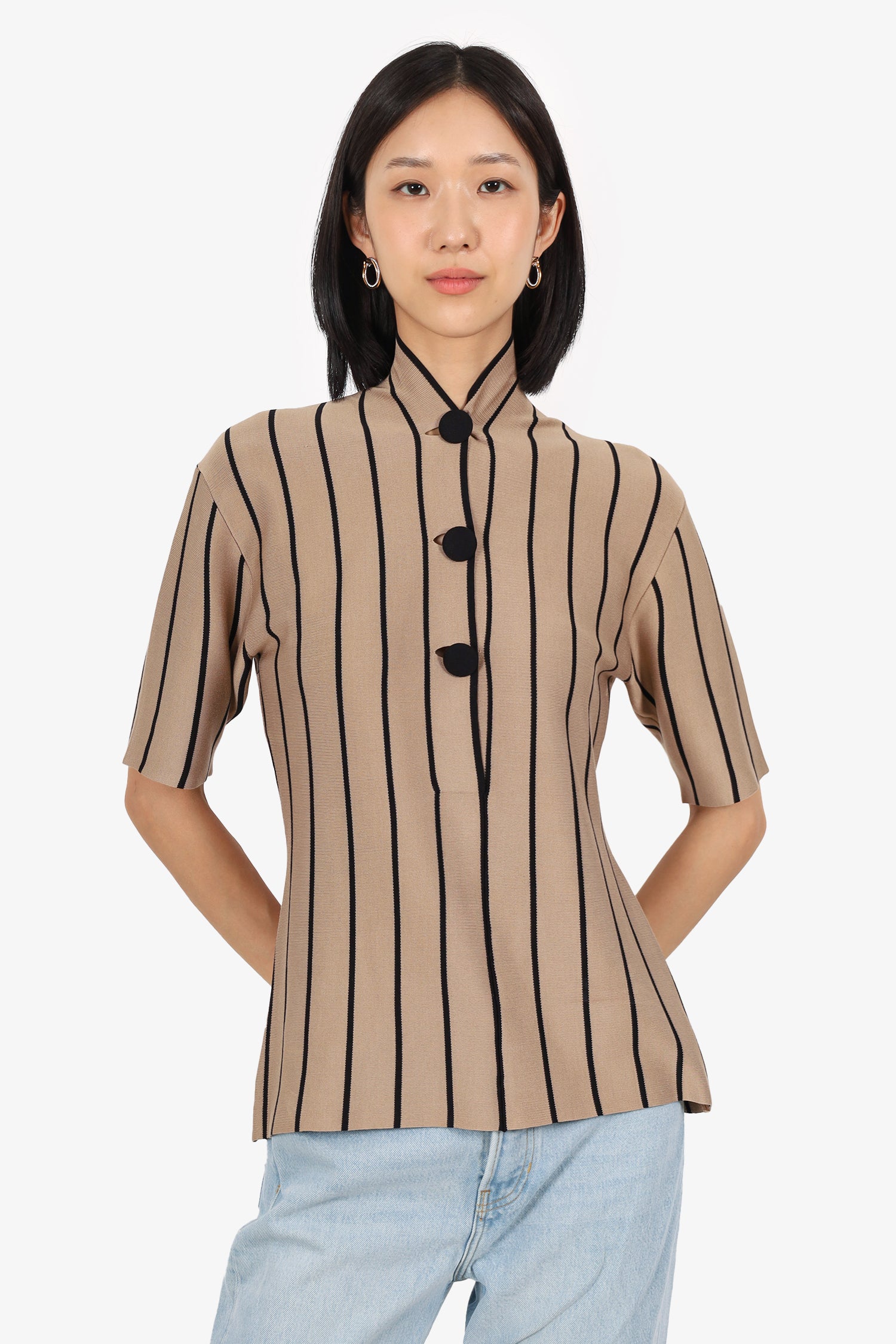 Refresh availabilityBalenciaga Brown/Black Silk Striped Short Sleeve Top. Pull-on. Round neckline. Front button-up closure. Tonal stitching.