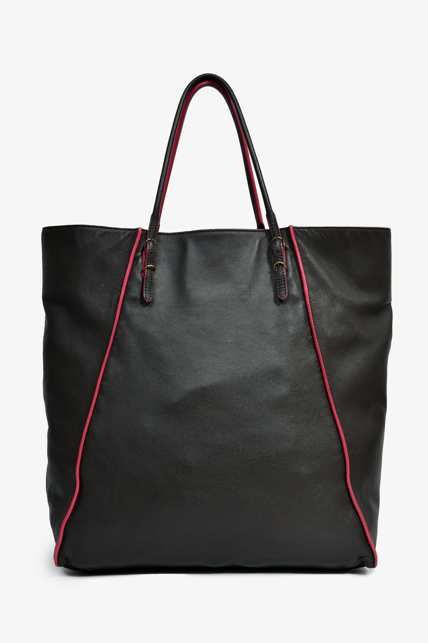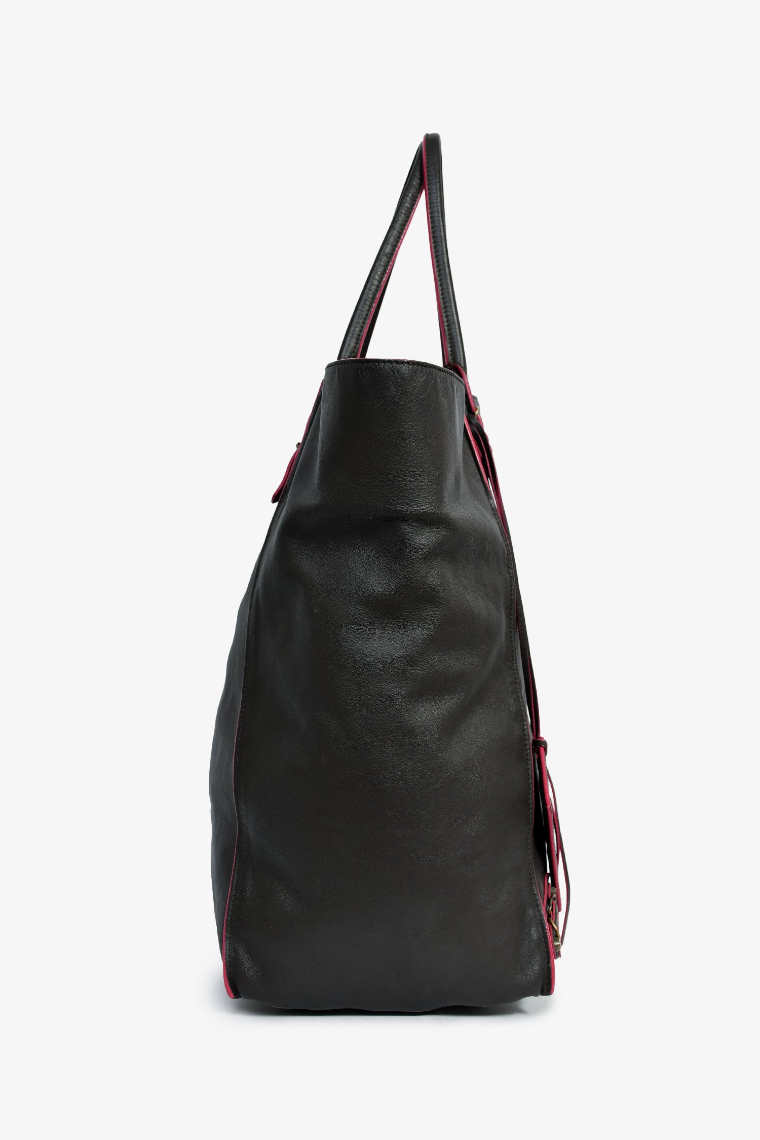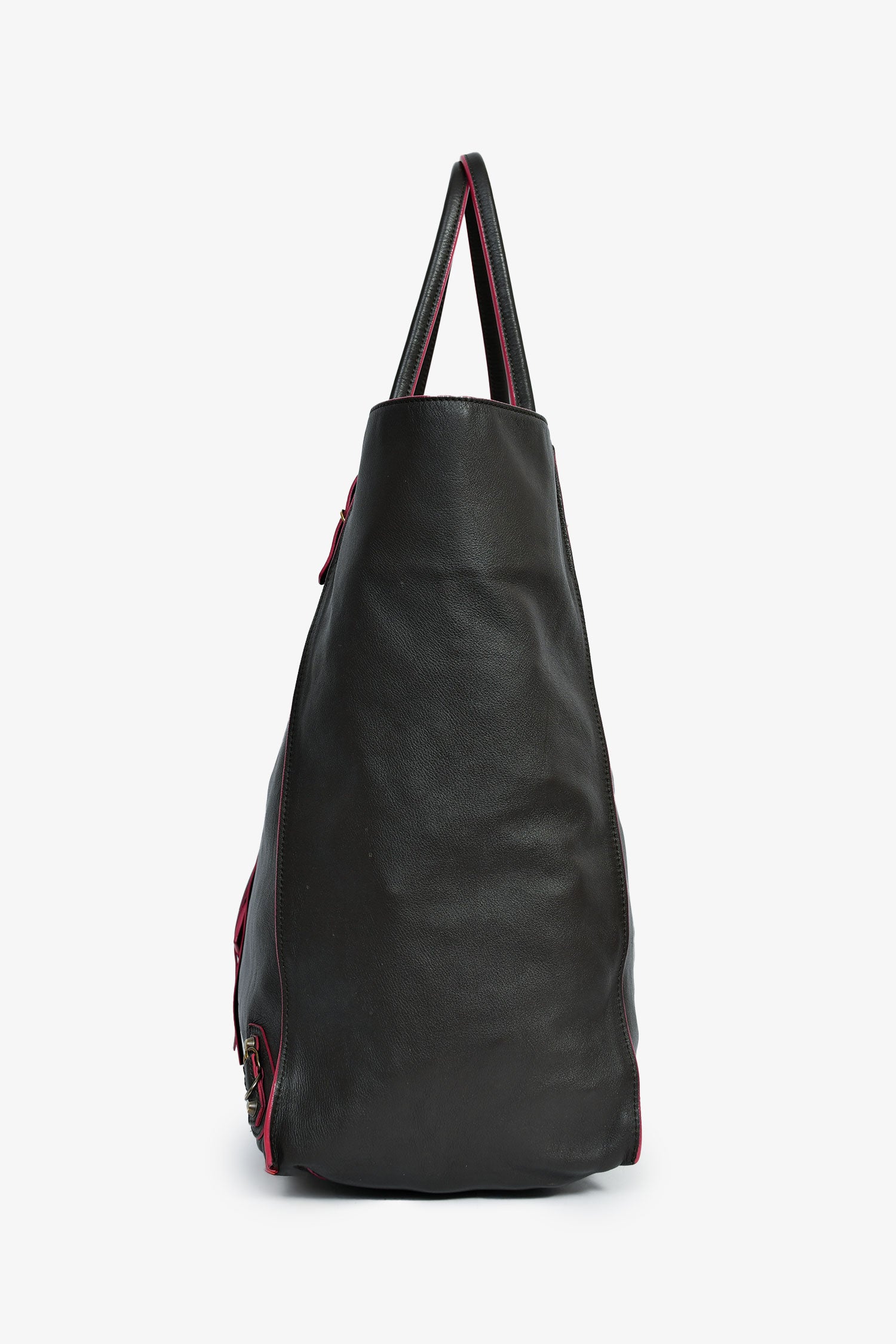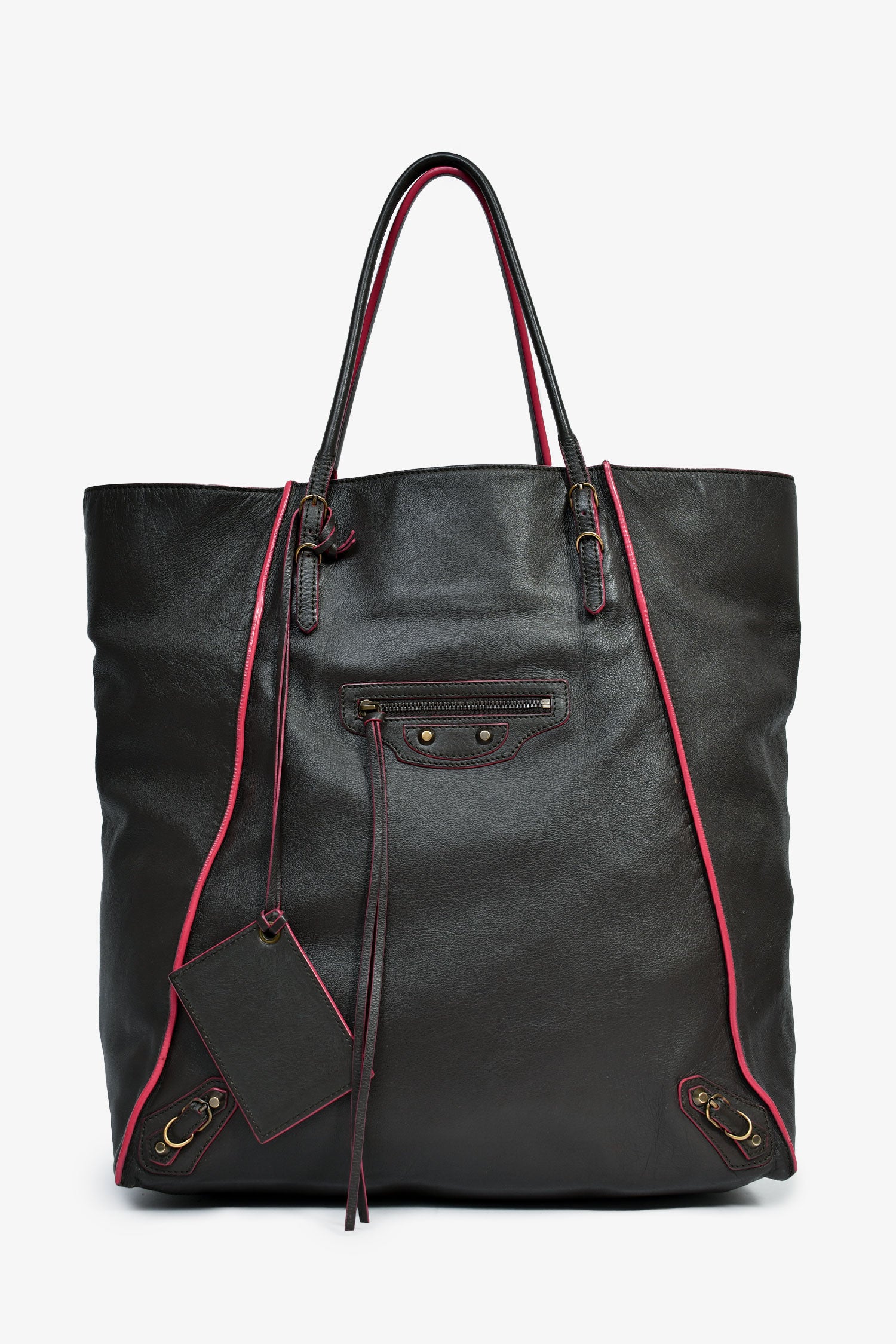 Refresh availabilityBalenciaga Brown/Pink Leather Tote Bag. Open top. Dual handles. Front exterior zip pocket. Single interior wall flap with two slip pockets. Detachable mirror. Gold-tone hardware. Tonal stitching.
