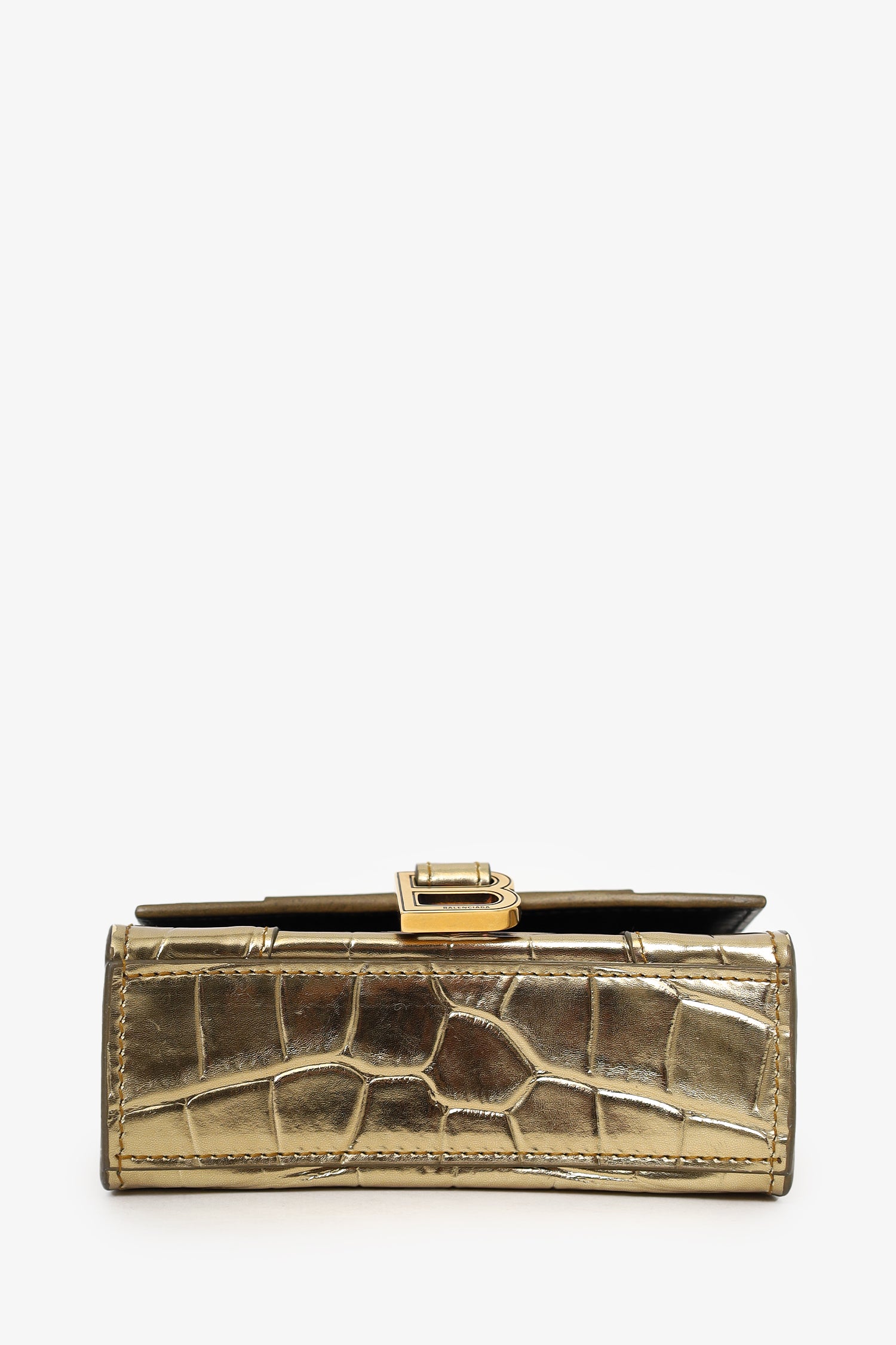 Refresh availabilityBalenciaga Gold Croc Embossed Leather Hourglass Nano Chain Bag. Single top handle. Gold-tone hardware. Coated trimming. Fold-over flap. Interior slip compartment. Chain-link strap.