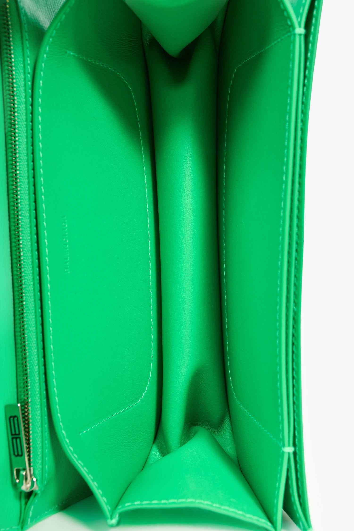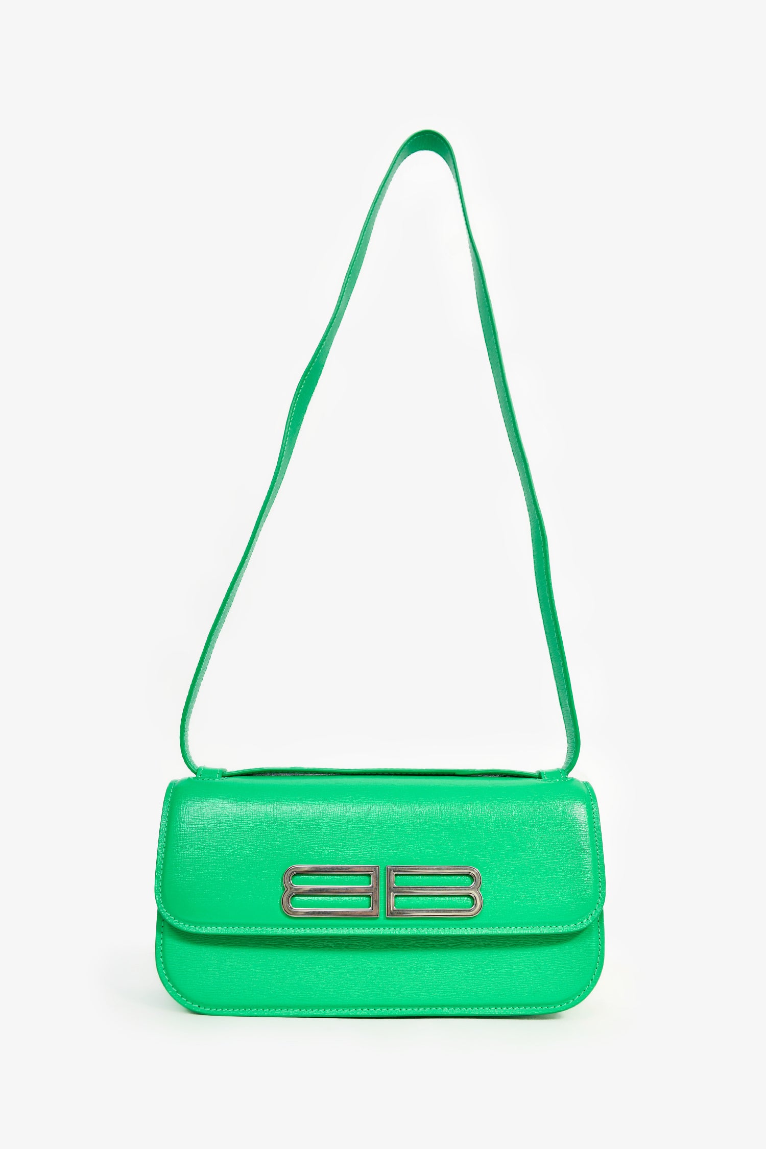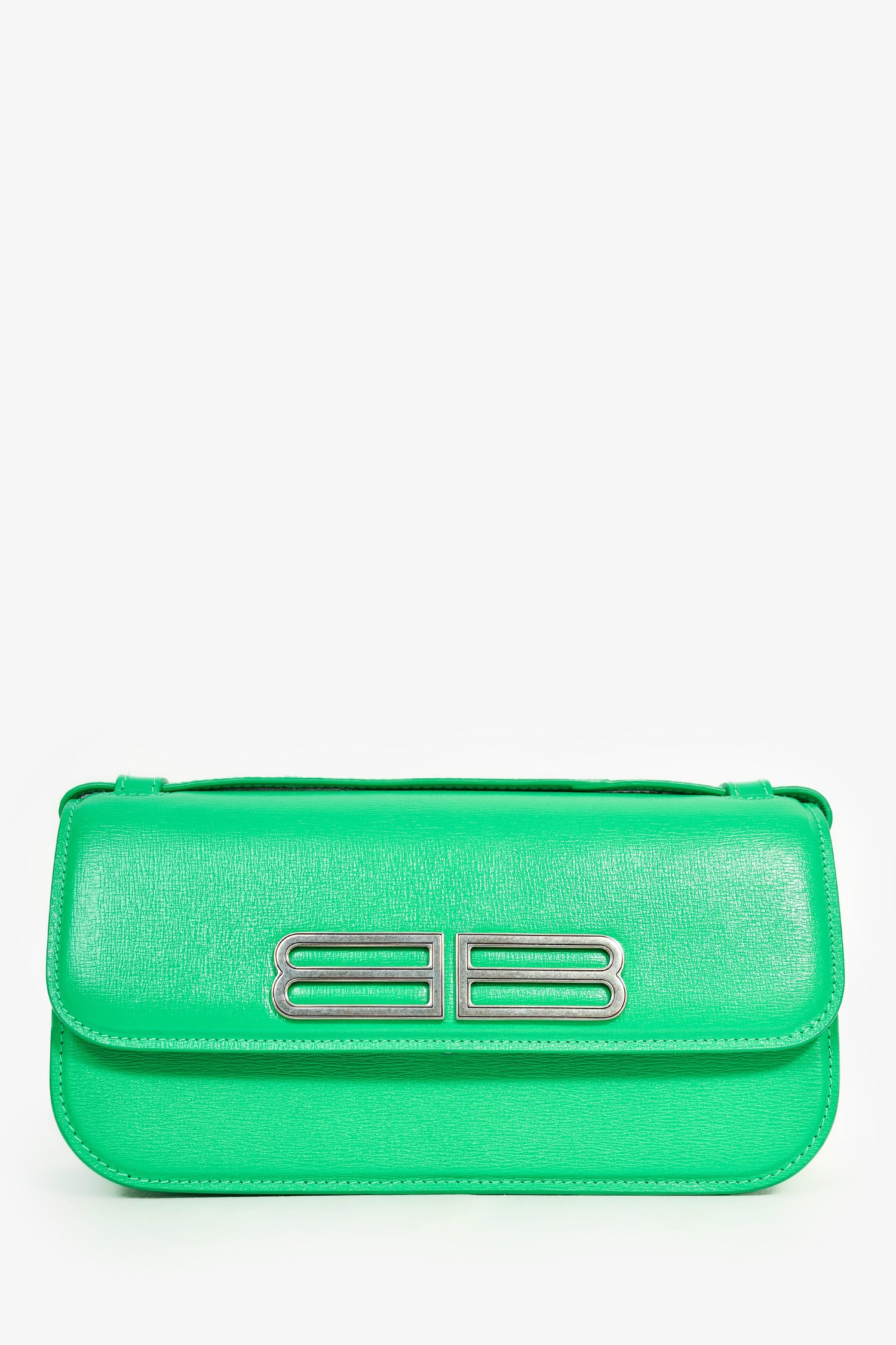 Refresh availabilityBalenciaga Green Leather 'Gossip' Shoulder Bag. Silver-tone hardware. Single shoulder strap. Push-lock closure. 3 interior compartments. 1 zipped compartment. Tonal stitching.