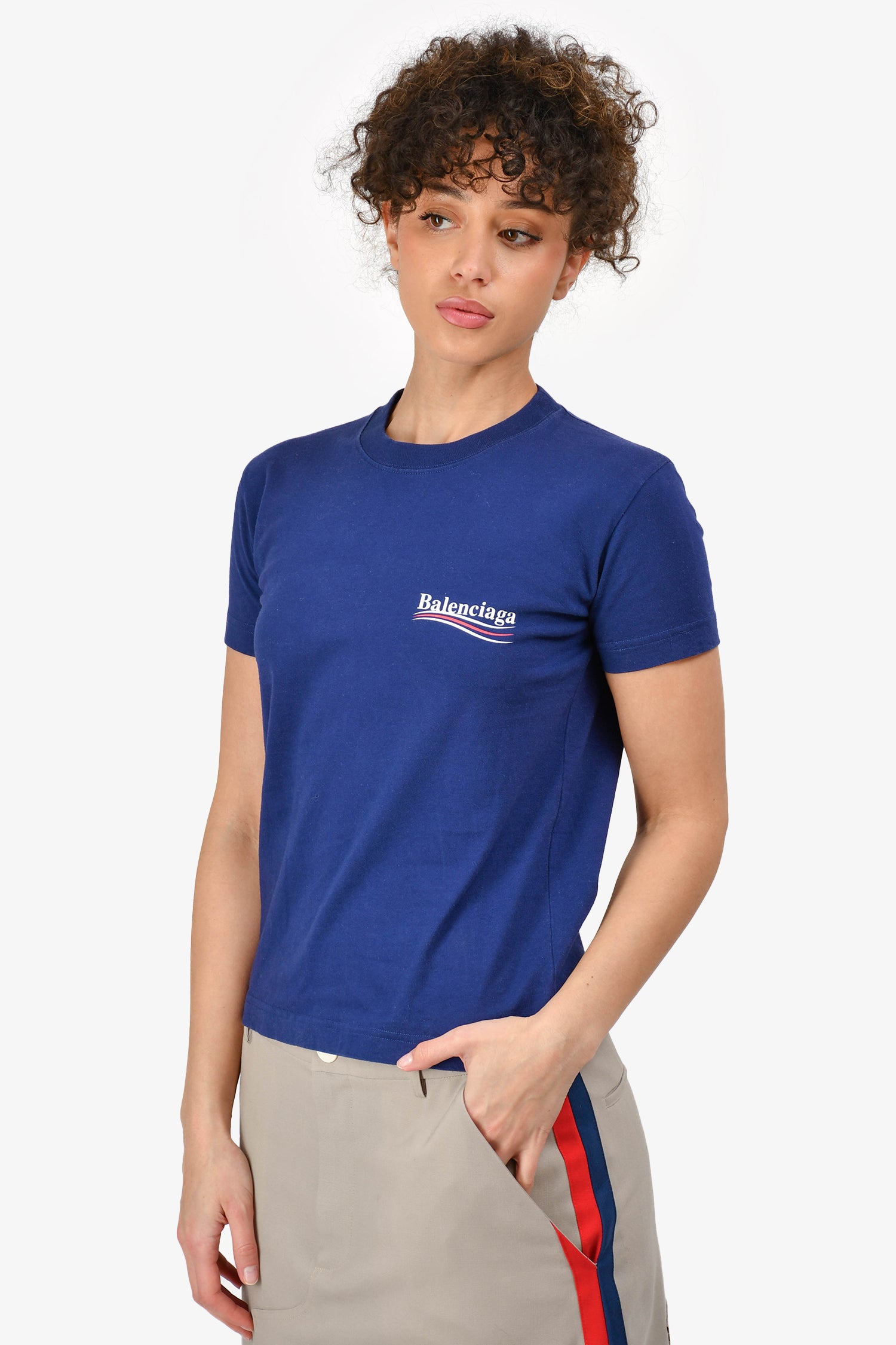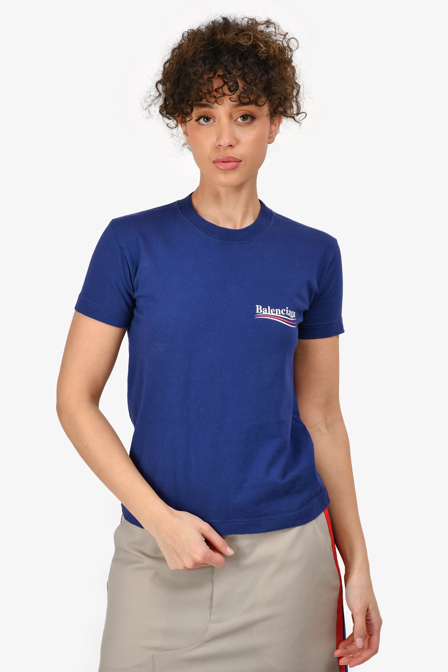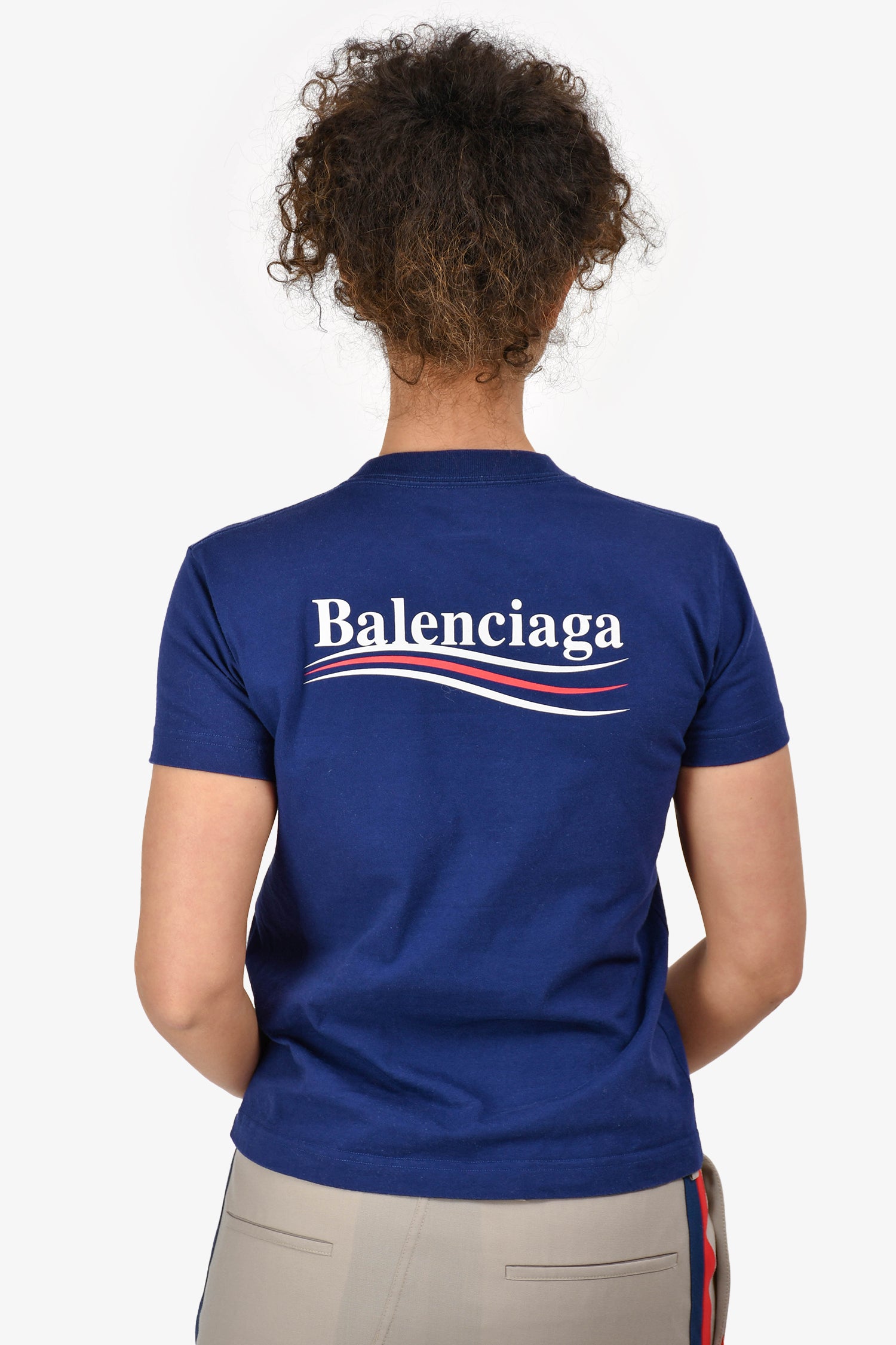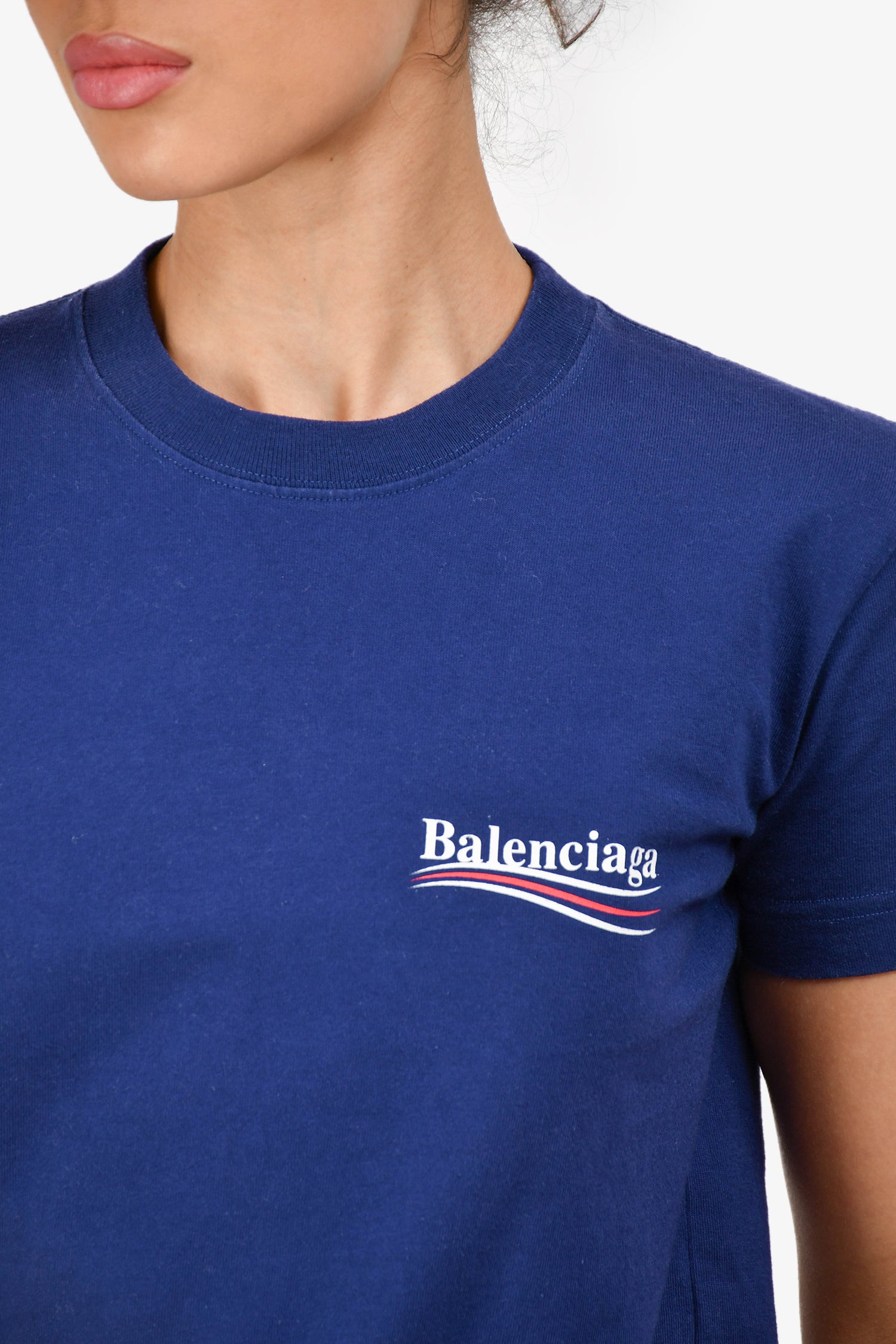 Refresh availabilityBalenciaga Navy Logo Printed Short Sleeve T-Shirt. Round neck. Ribbed neckline. Tonal stitching.