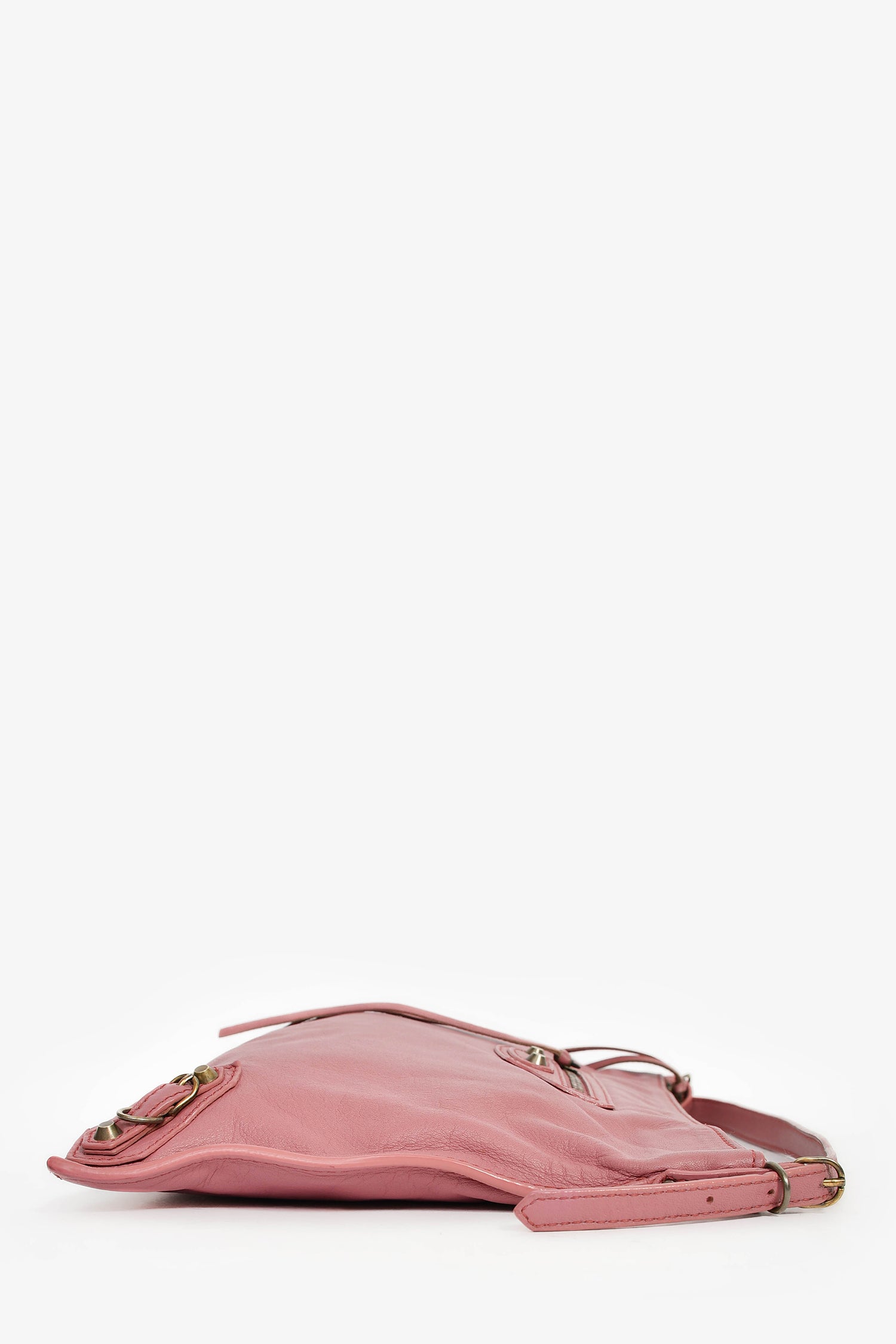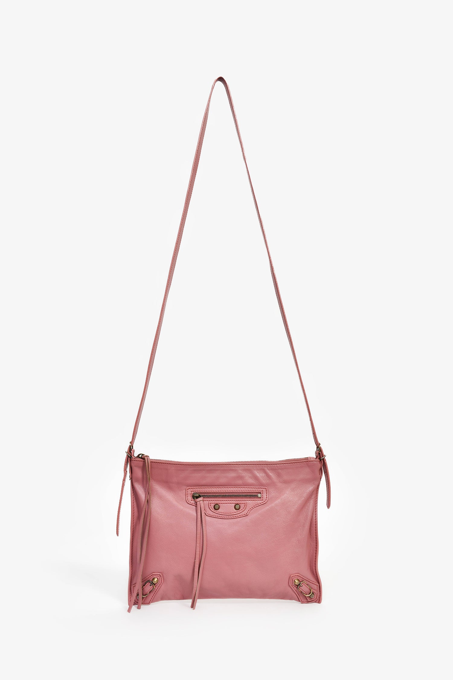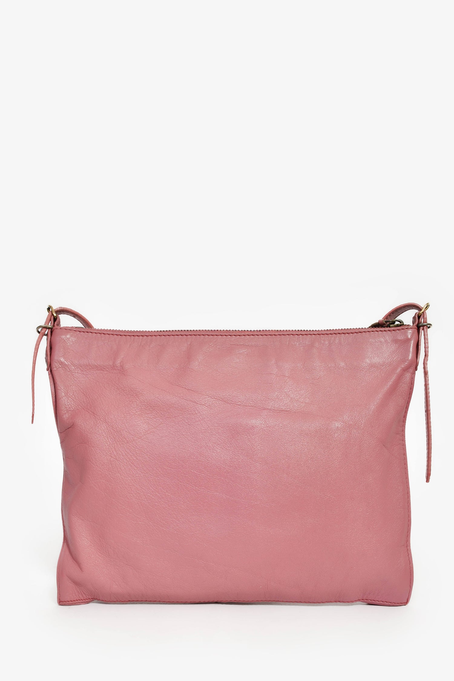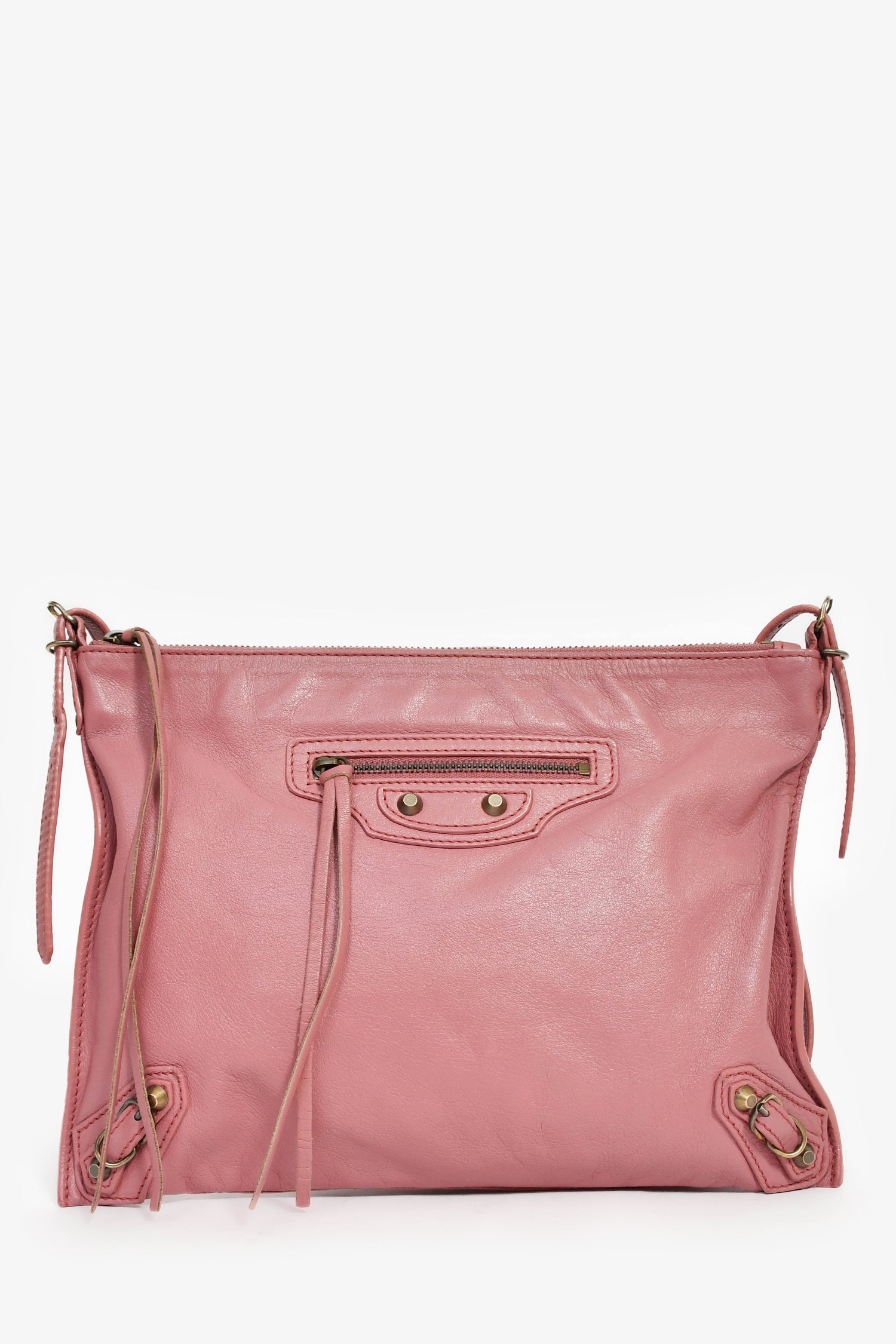 Refresh availabilityBalenciaga Pink Leather 'Papier Neo' Crossbody Bag. Top zip closure. Adjustable strap. Front exterior zip pocket. Leather-lined interior. 2 interior wall slip pockets. Detachable mini mirror. Gold-tone hardware. Tonal stitching.