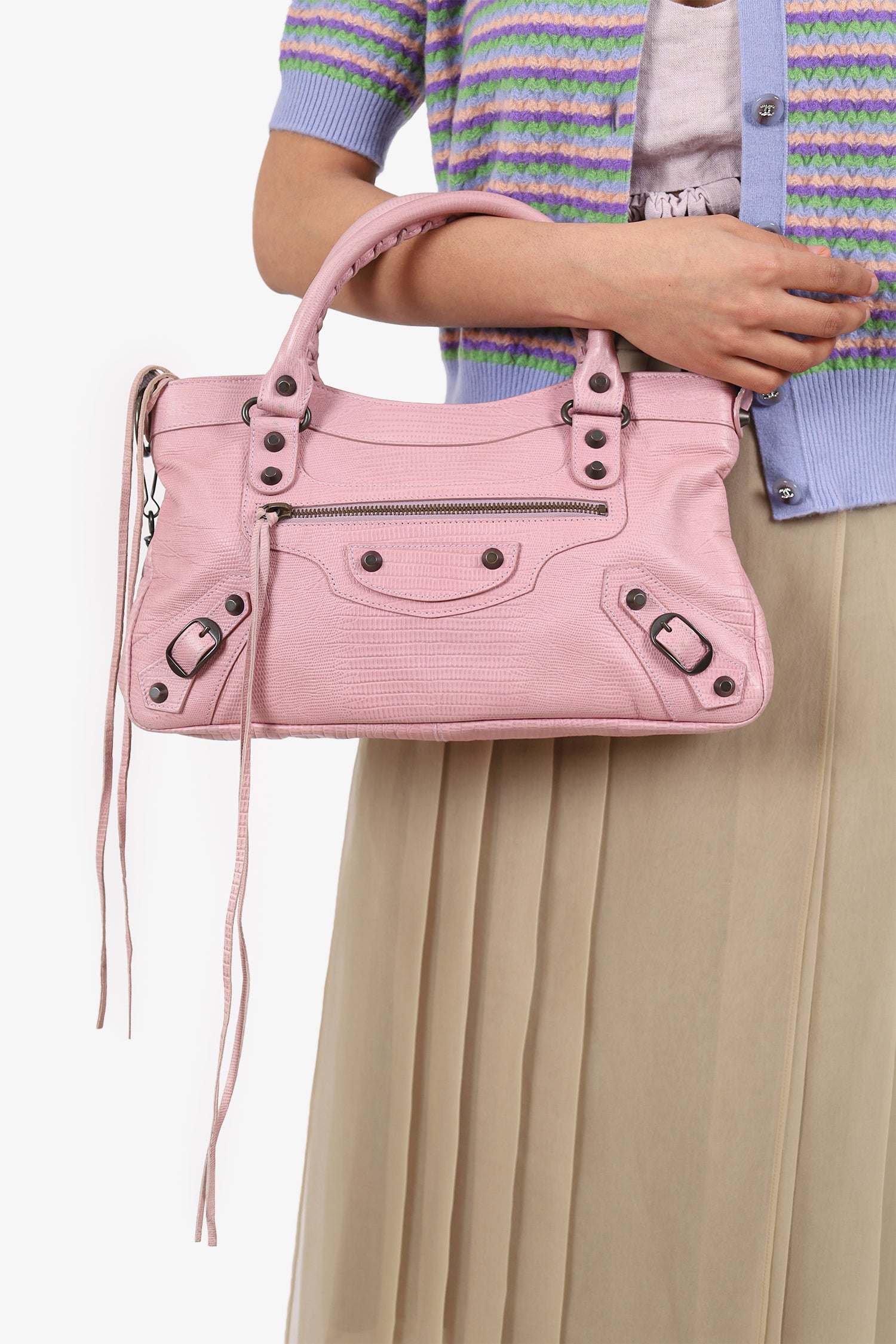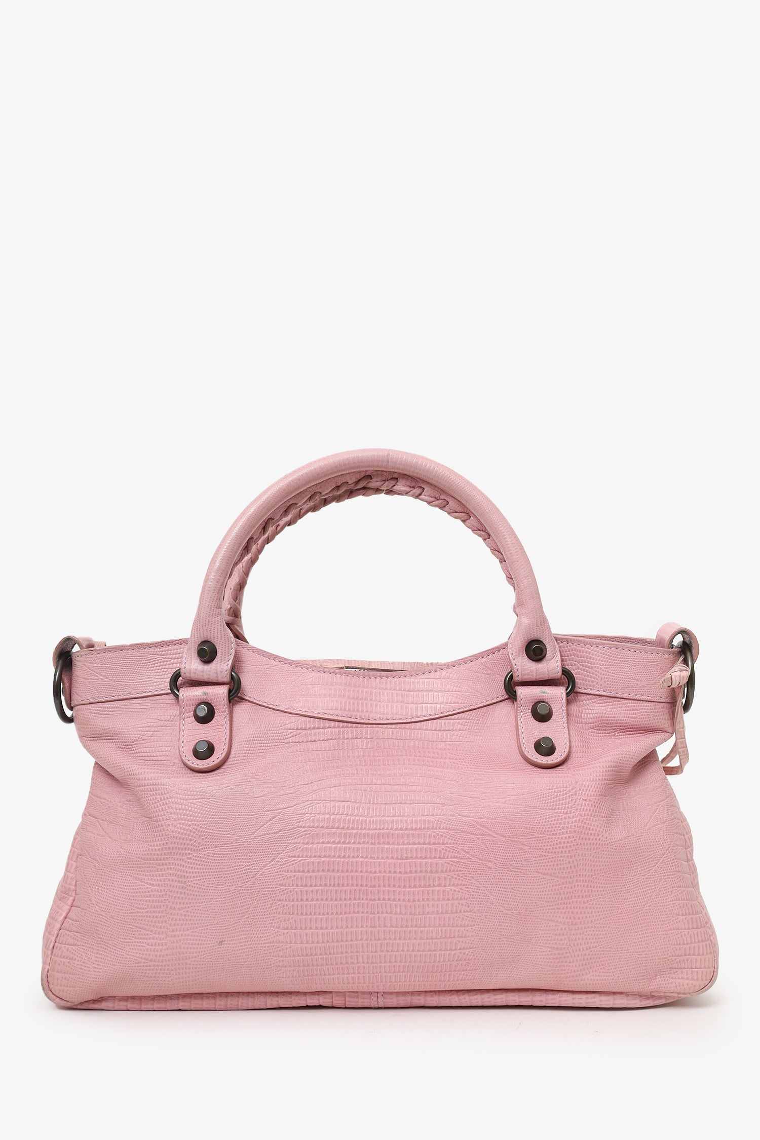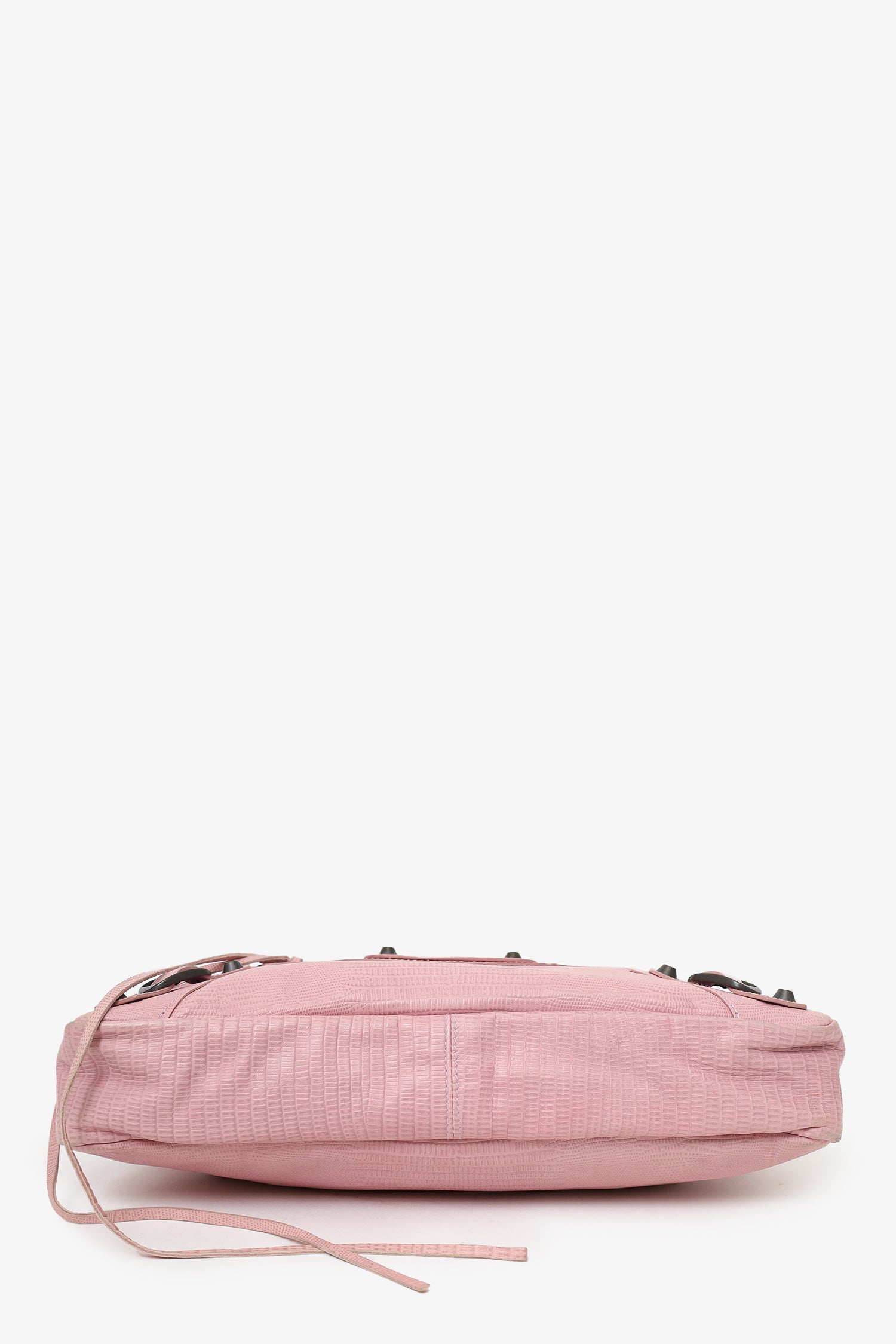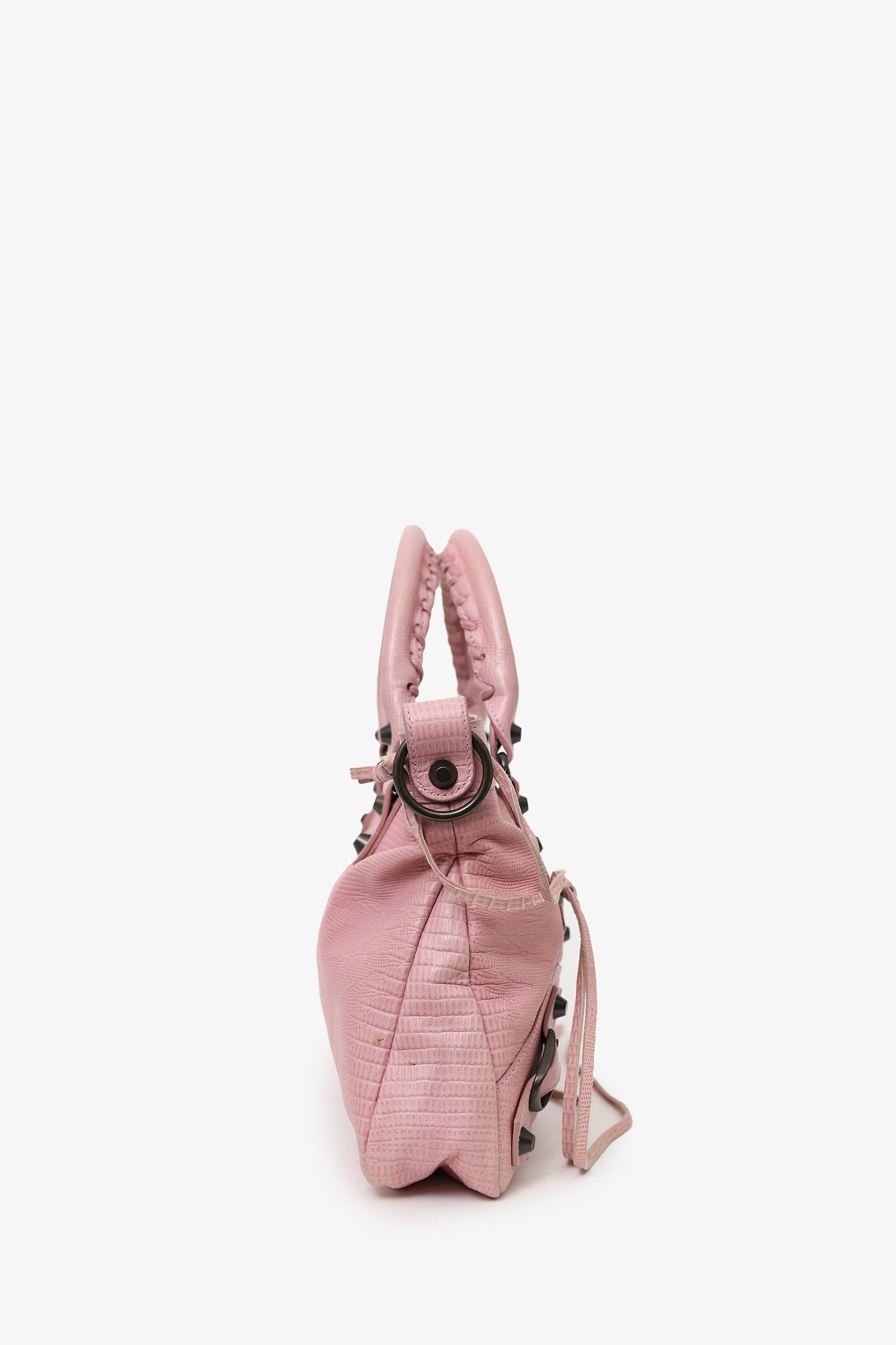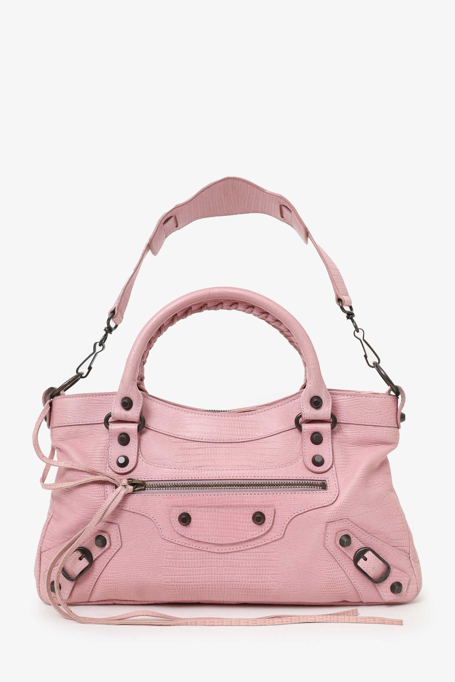 Refresh availabilityBalenciaga Pink Lizard Embossed Leather Motocross Classic City. Top zip closure. Top twin handles. Removable shoulder strap with lobster clasp closure. Front zip pocket. Front buckle designs. Lined interior. Single interior zip pocket. Palladium-tone hardware. Tonal stitching.
