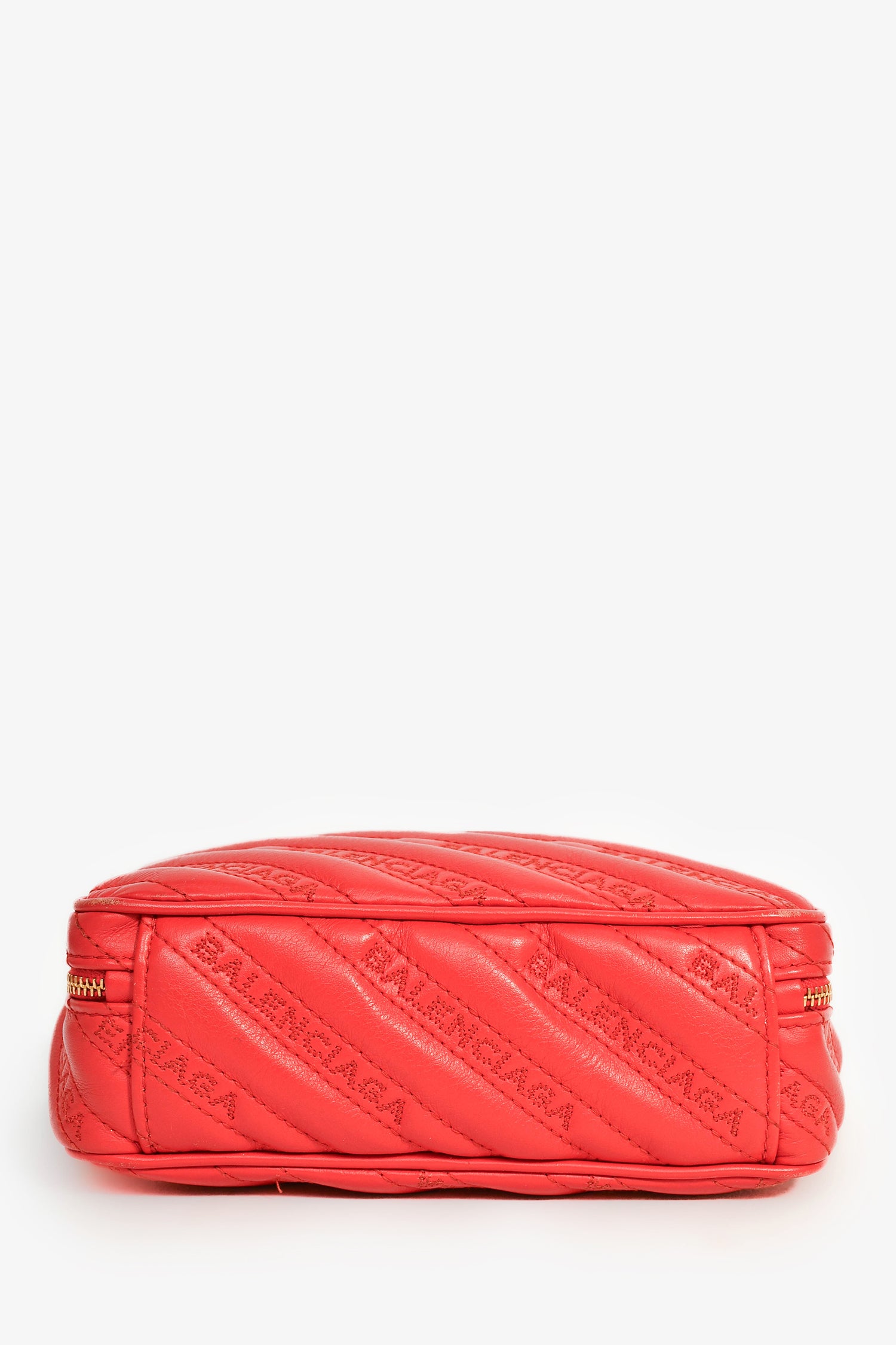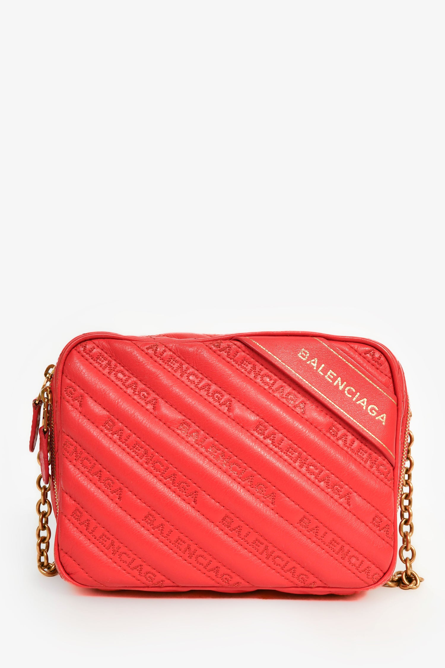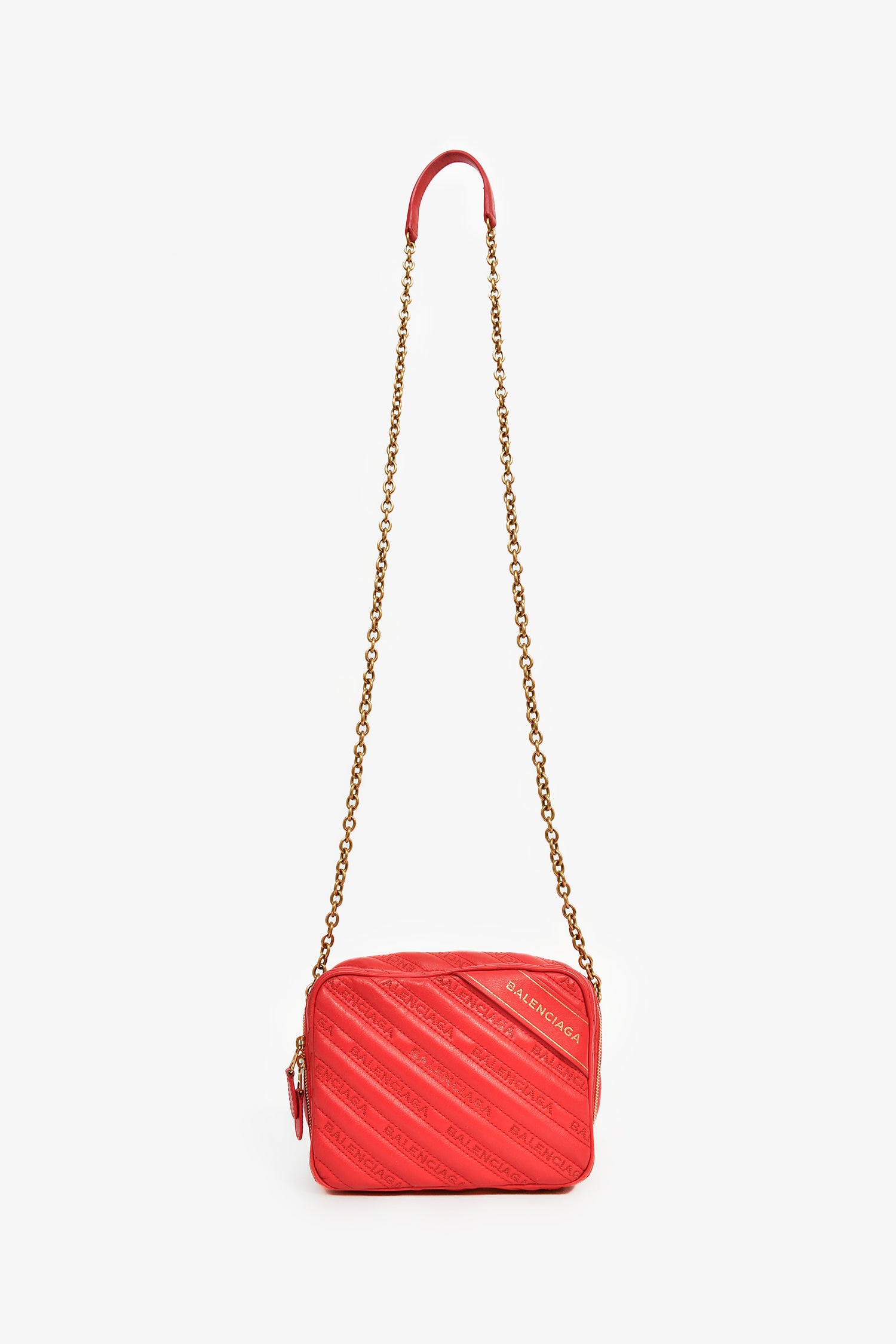 Refresh availabilityBalenciaga Red Leather Logo 'Blanket Reporter' Camera Bag. Top zip closure. Chain-link and leather crossbody strap. Lined interior. Single zip pocket. Tonal stitching. Gold-tone hardware.
