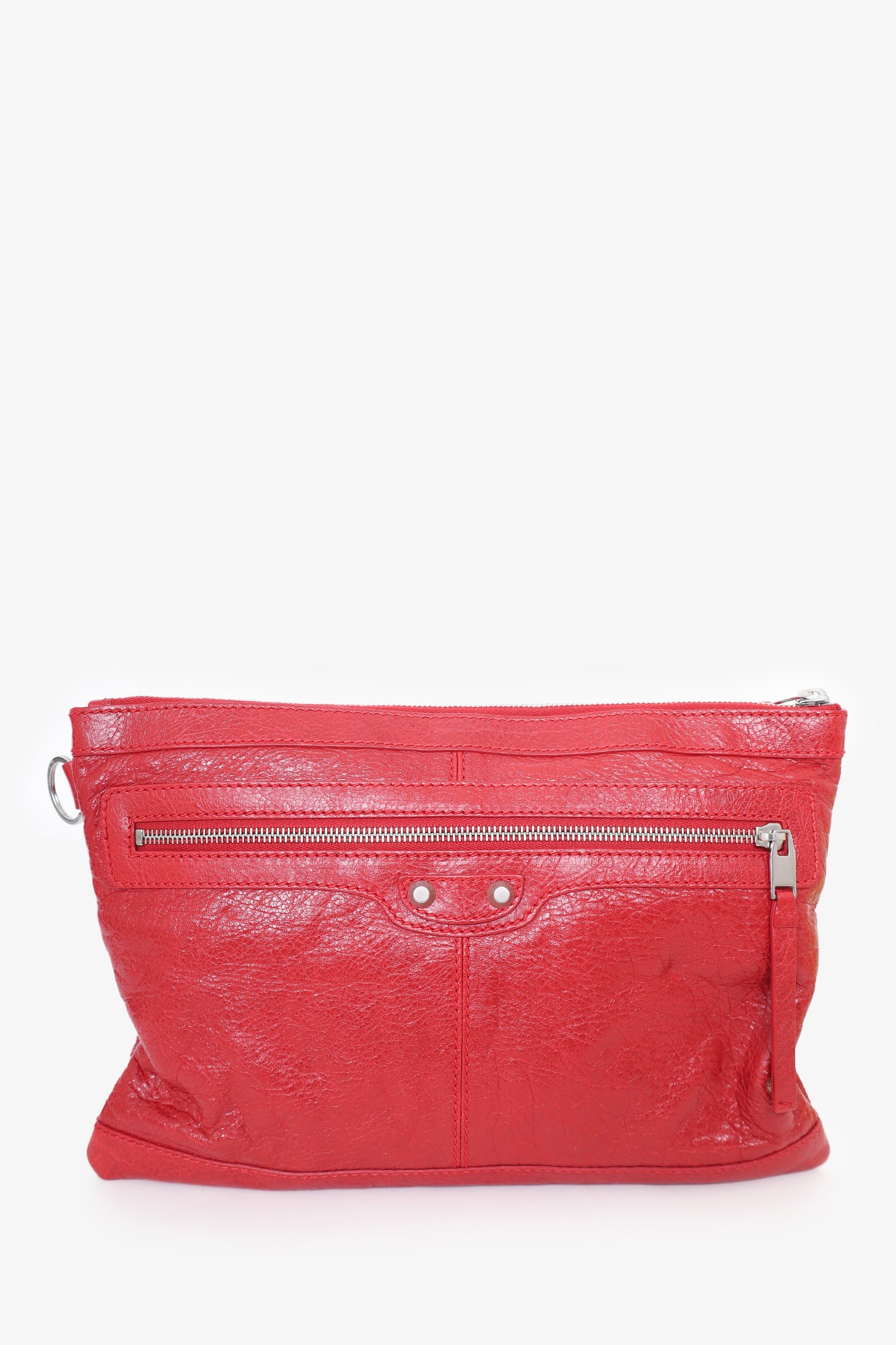 Refresh availabilityBalenciaga Red Leather Motocross Clip Zip Clutch. Top zip closure. Single front zip pocket. Silver-tone hardware. Tonal stitching.