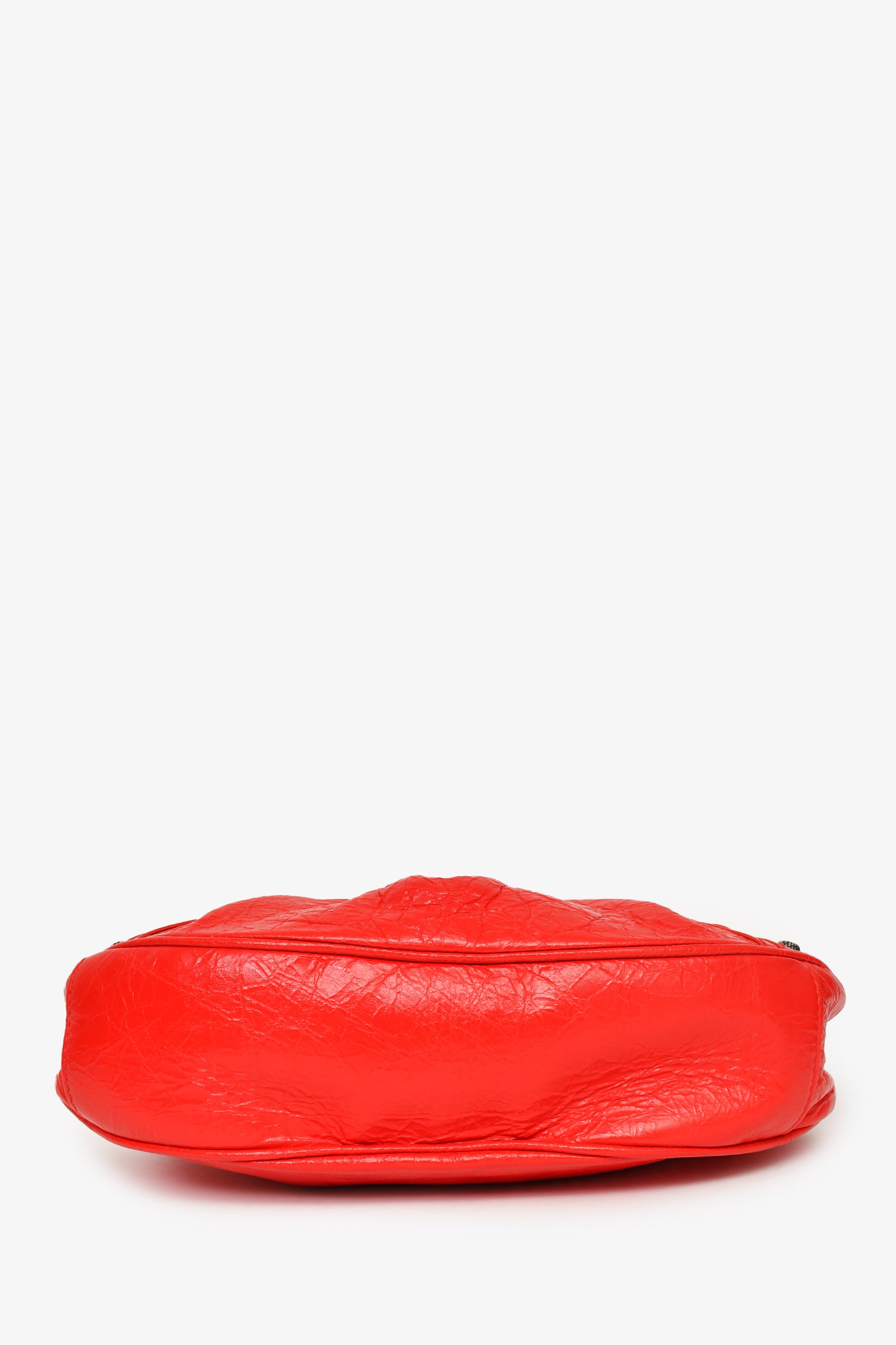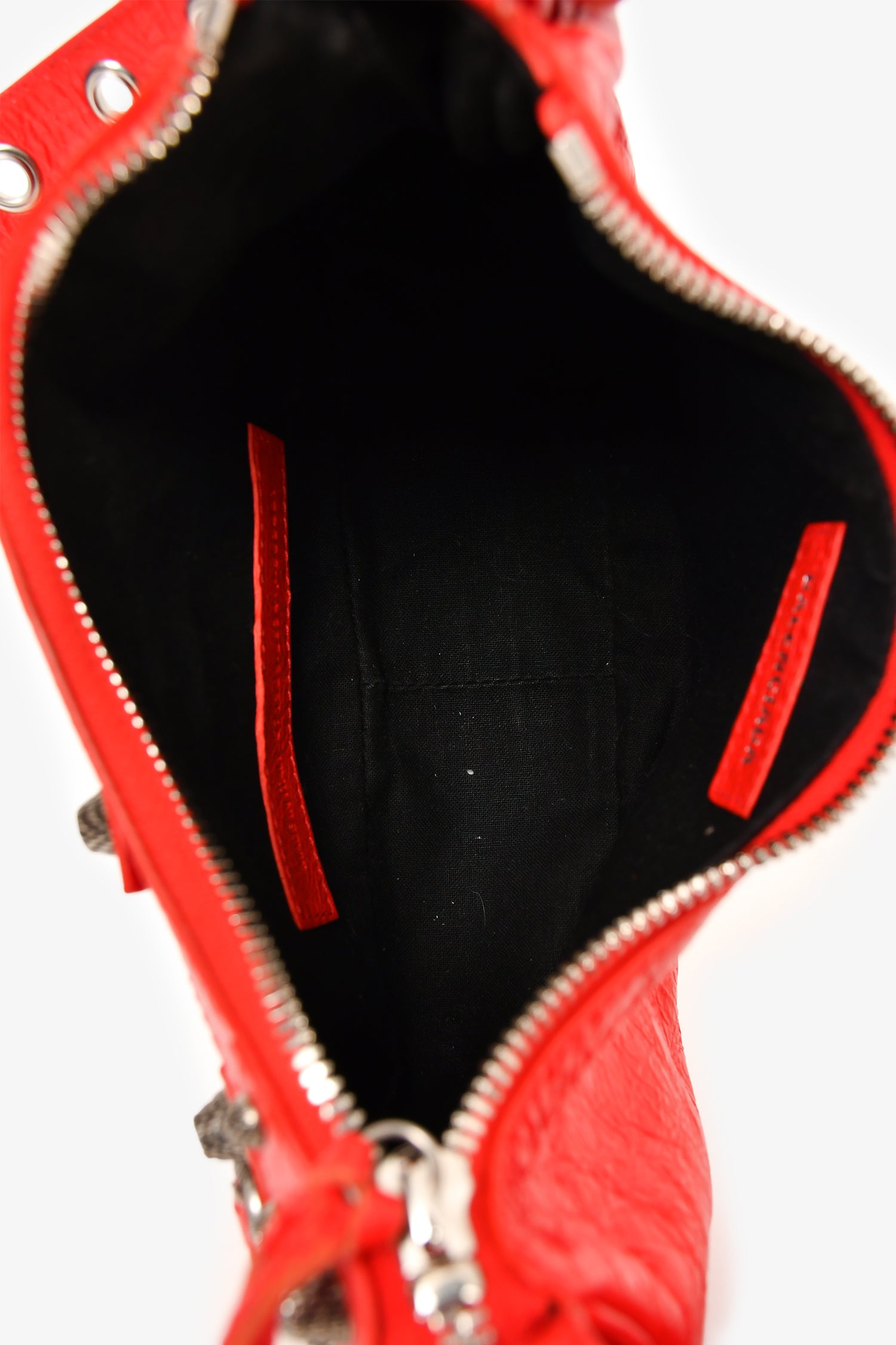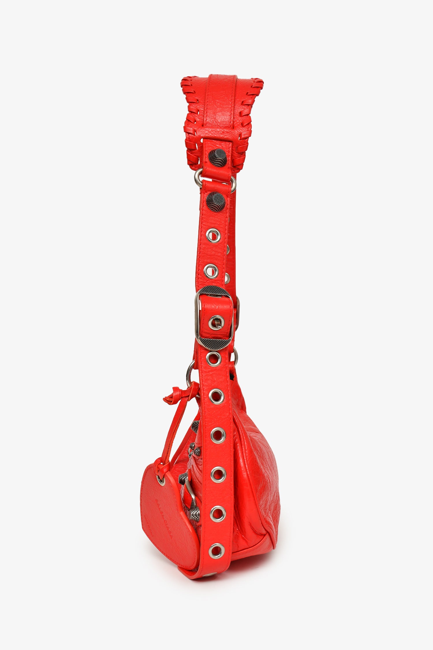 Refresh availabilityBalenciaga Red Leather Studded 'Cagole' Shoulder Bag. Silver-tone studs and hardware. Zipped top. Lined interior with leather trimming. Shoulder strap with leather weaving and leather pad.