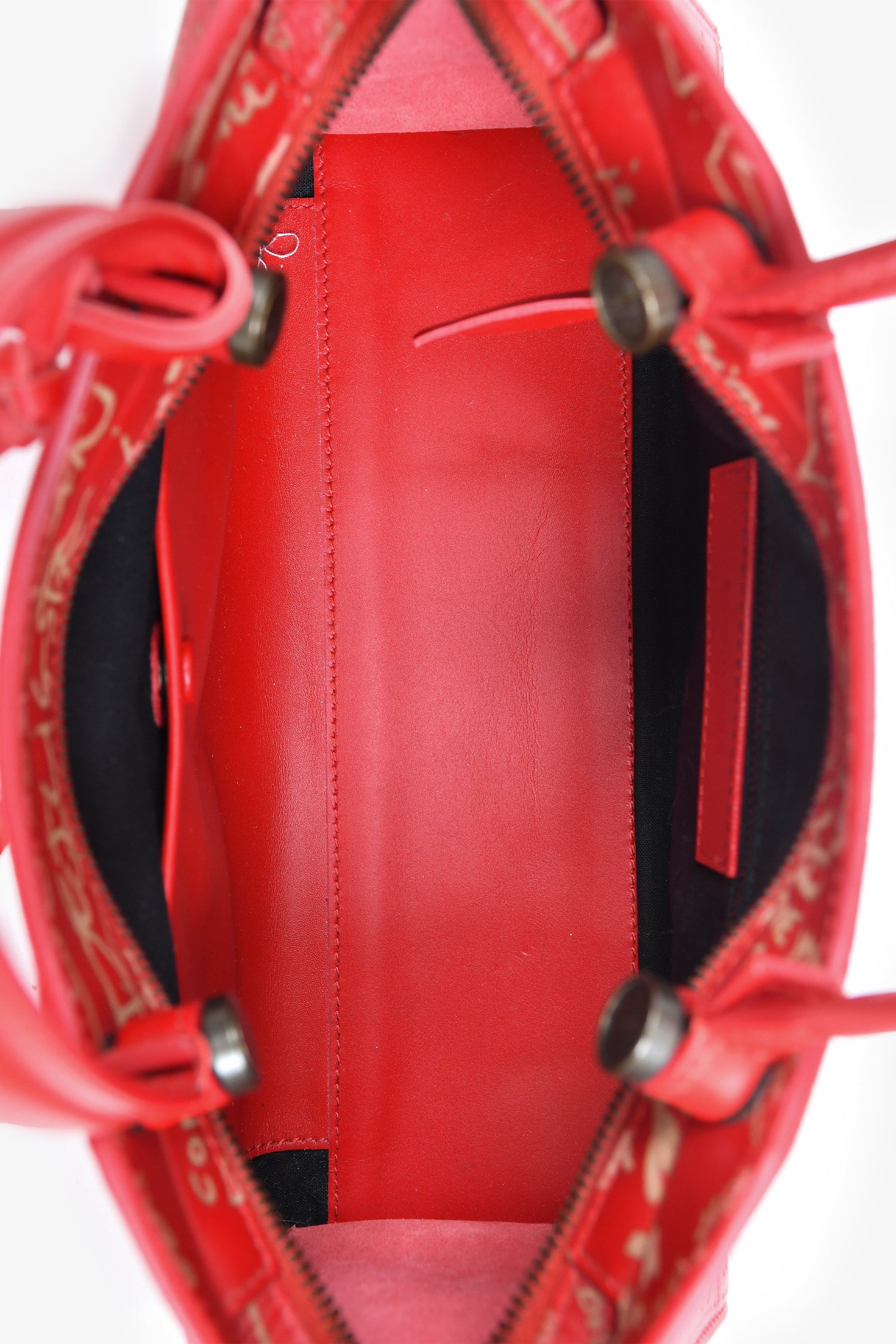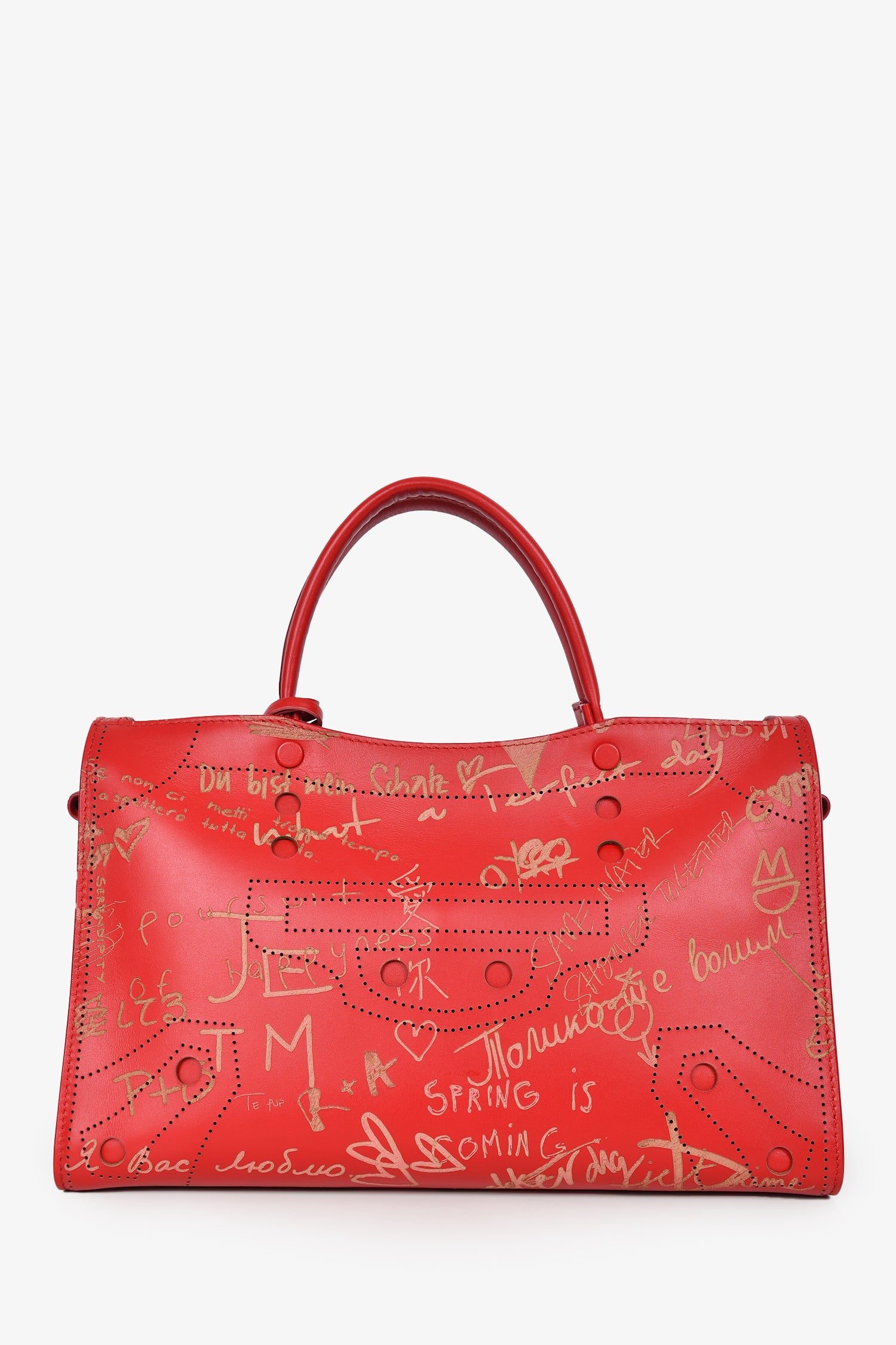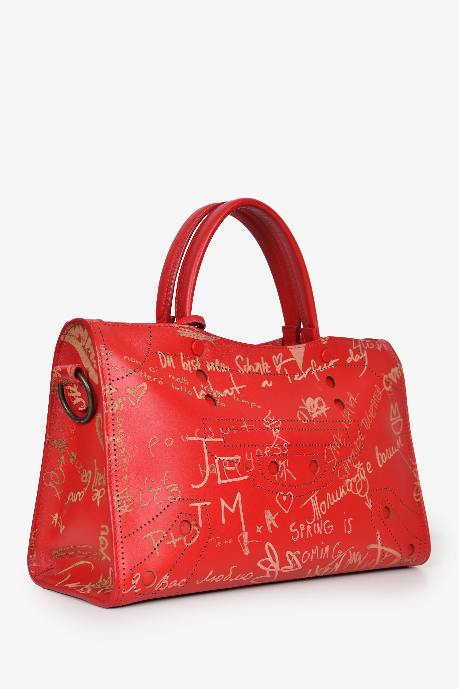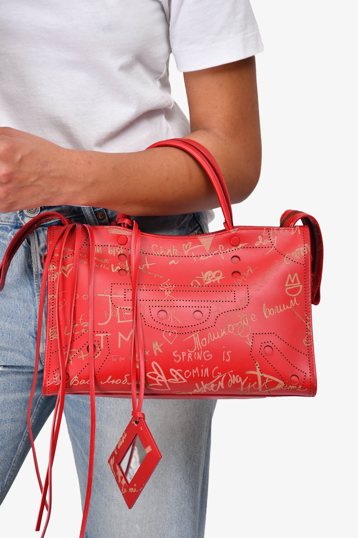 Refresh availabilityBalenciaga Red Leather Valentine's Day Blackout City Bag With Strap. Top zipper closure. Magnetic closure on straps. Strap detailing of zipper. Interior zipper compartment and pocket. Engraved writing on bag. Mirror on strap. Brown-tone hardware. Tonal stitching.