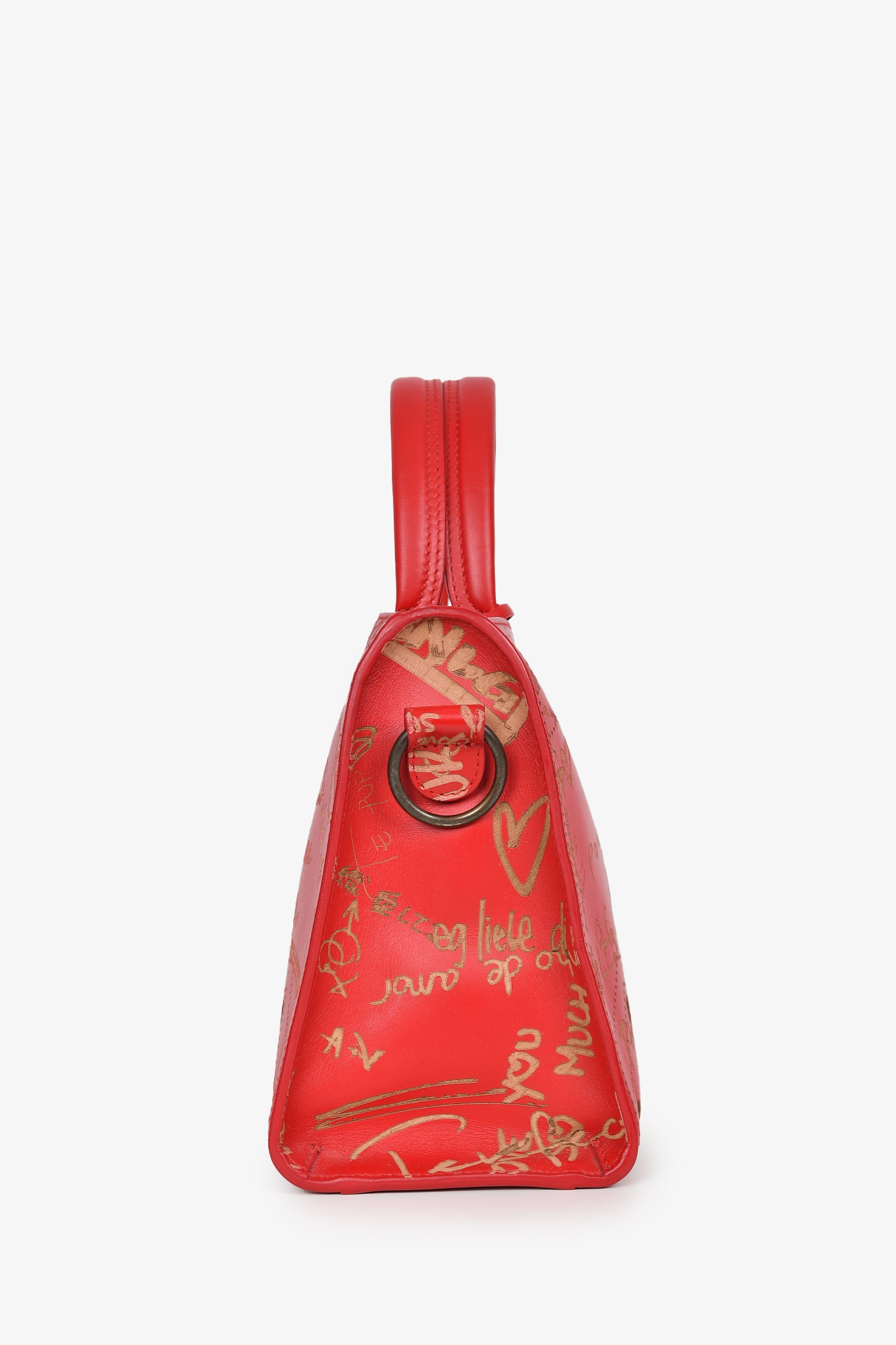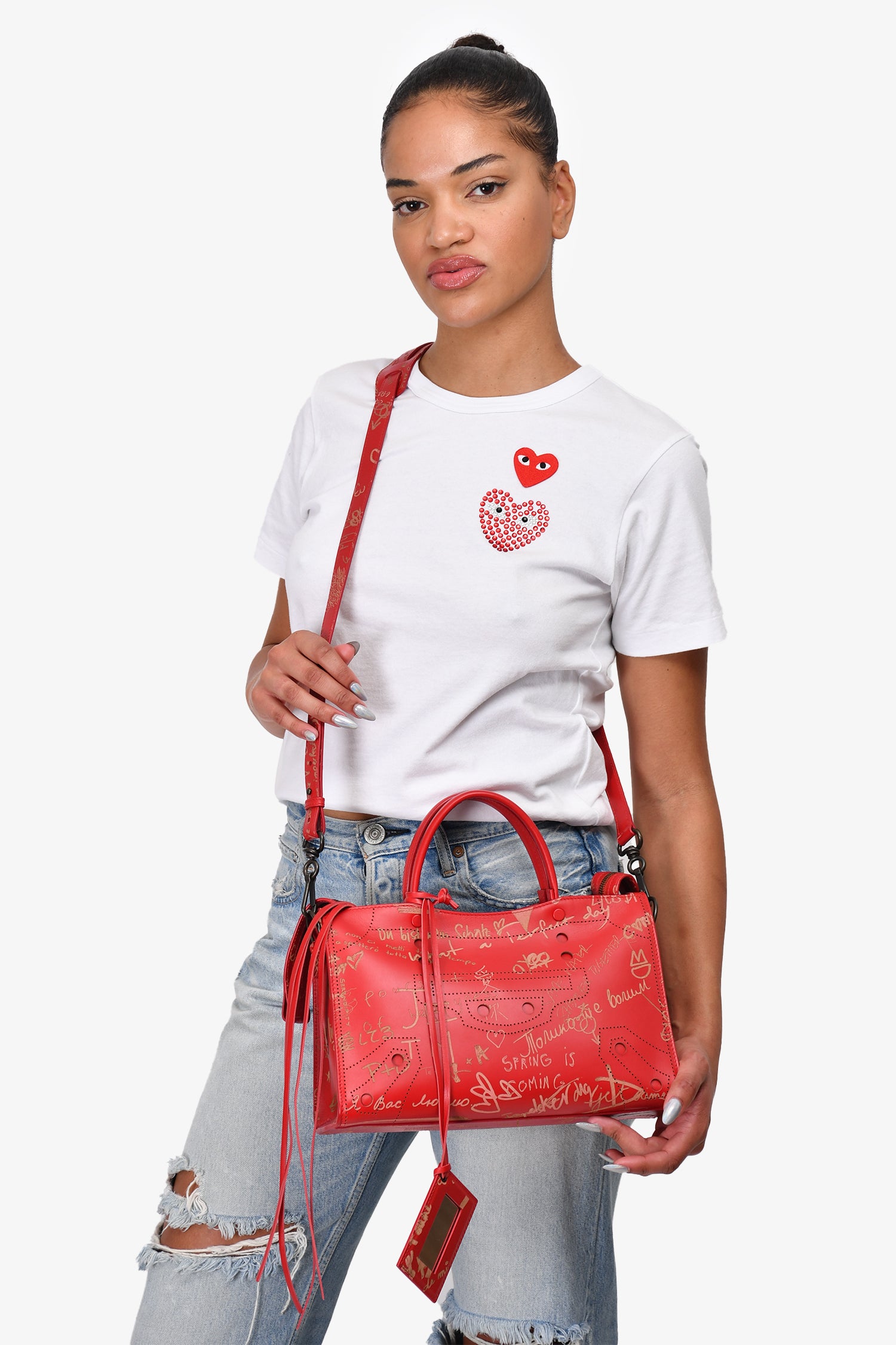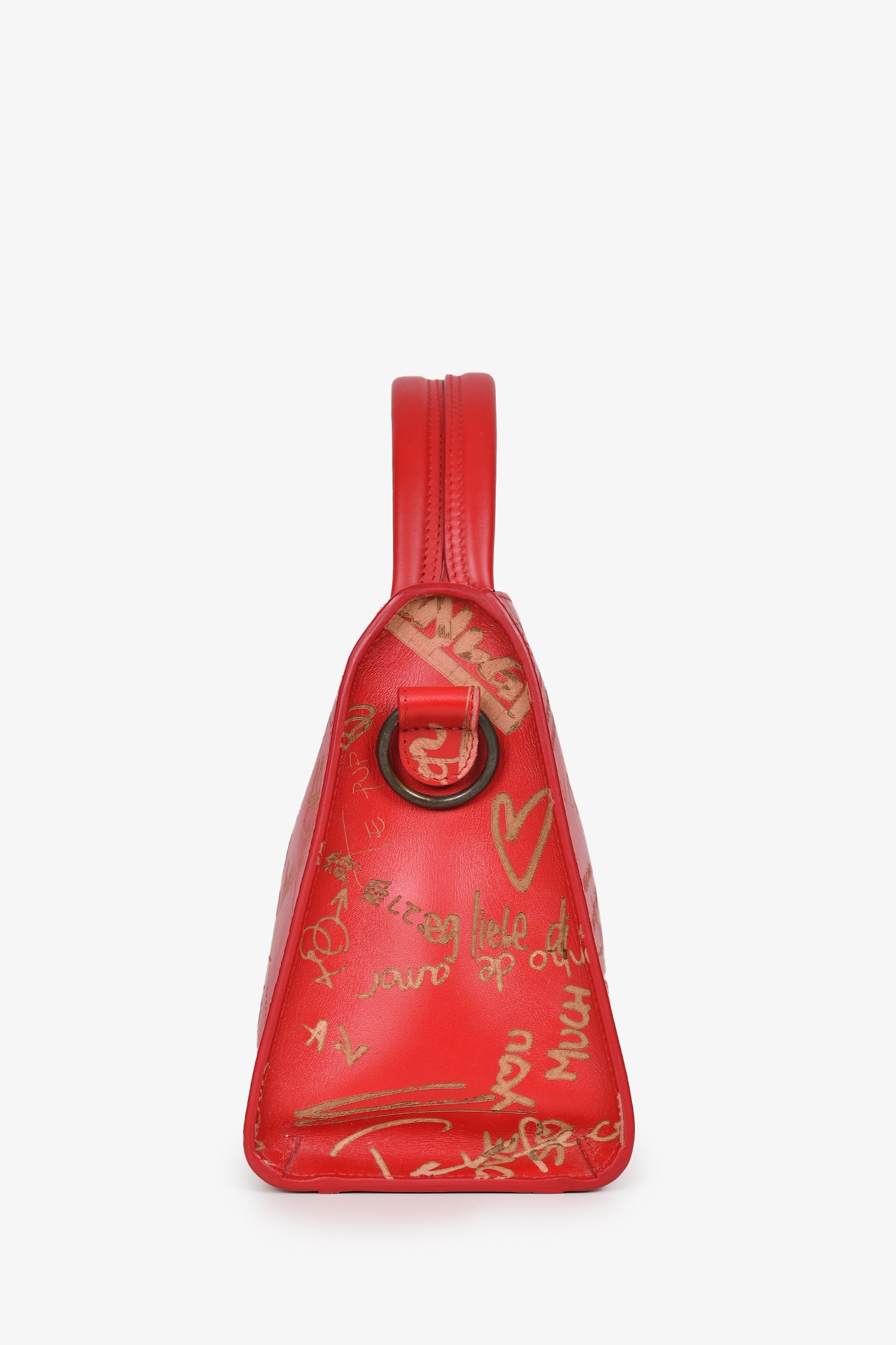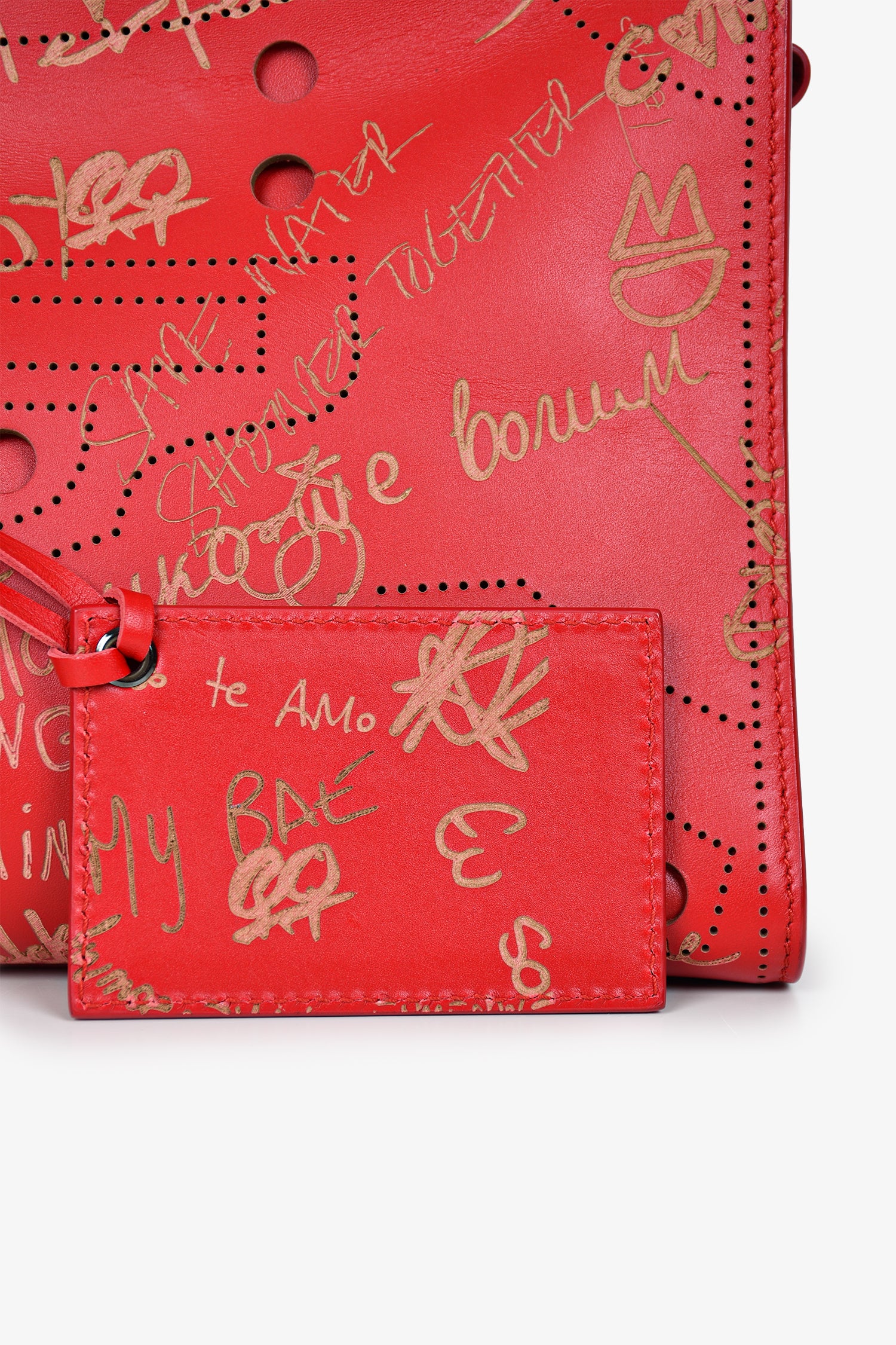 Refresh availabilityBalenciaga Red Leather Valentine's Day Blackout City Bag With Strap. Top zipper closure. Magnetic closure on straps. Strap detailing of zipper. Interior zipper compartment and pocket. Engraved writing on bag. Mirror on strap. Brown-tone hardware. Tonal stitching.