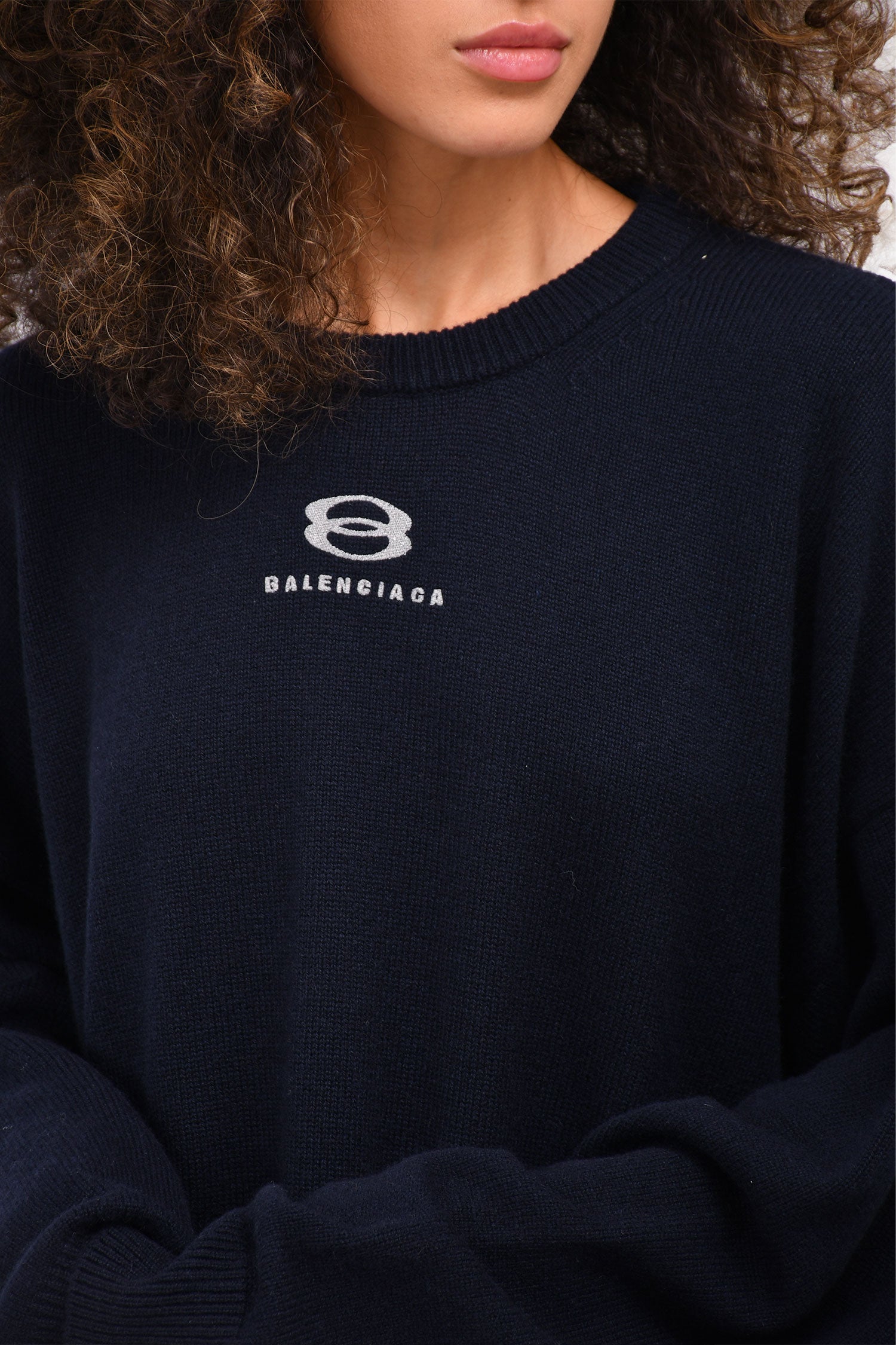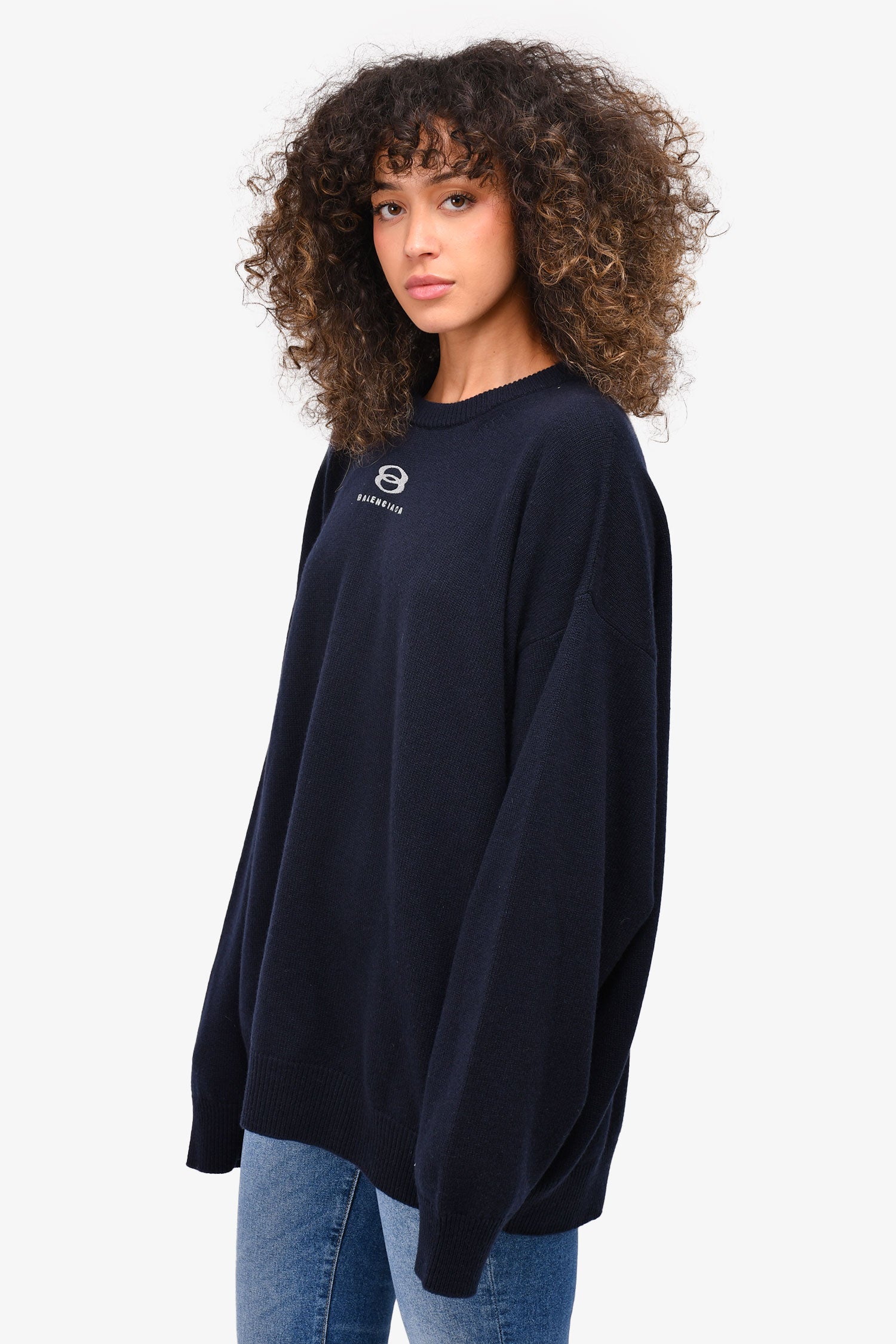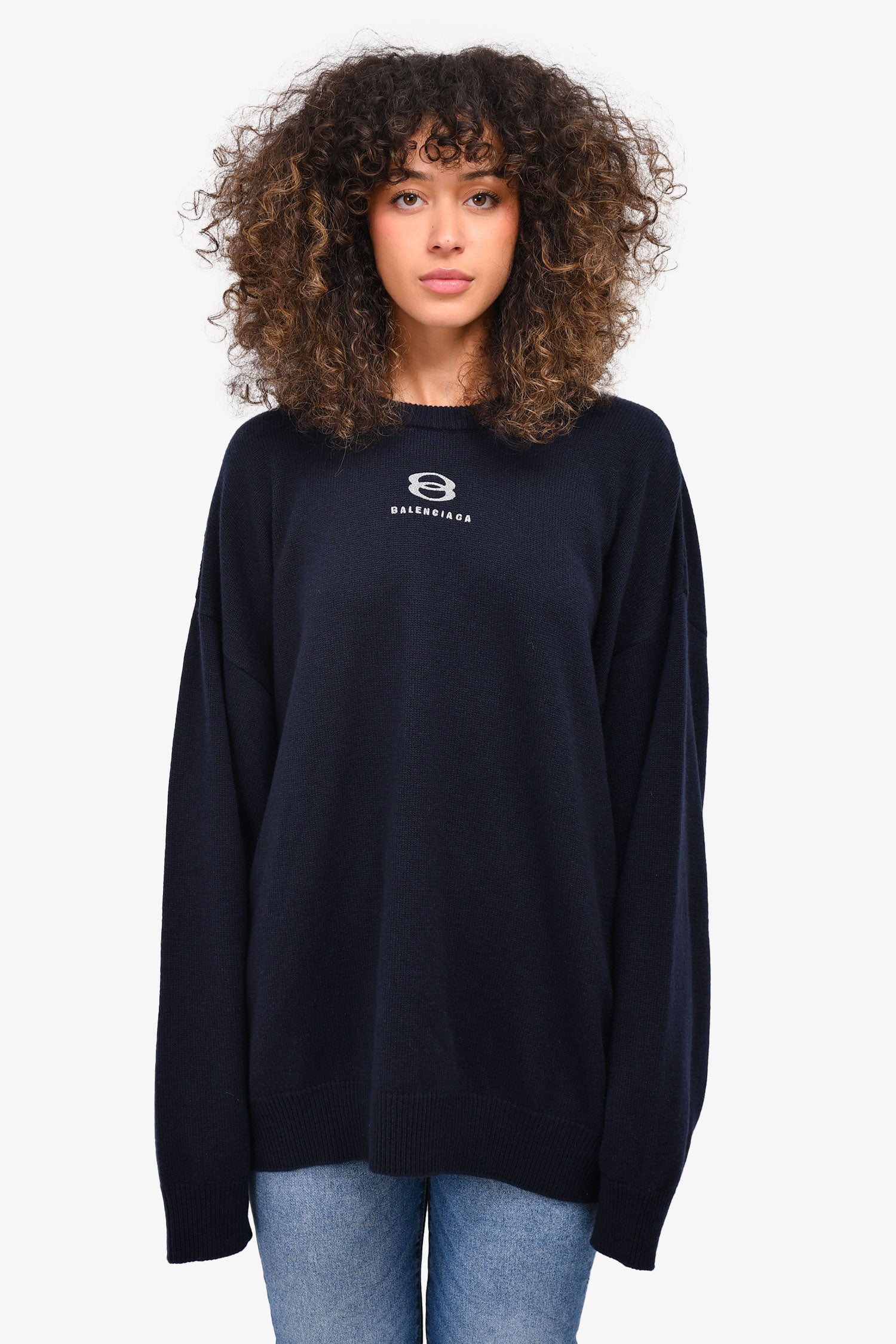 Refresh availabilityBalenciaga Unisex Wardrobe Navy Cashmere Logo Oversized Sweater. Ribbed collar, sleeves, and waistband. Tonal stitching.