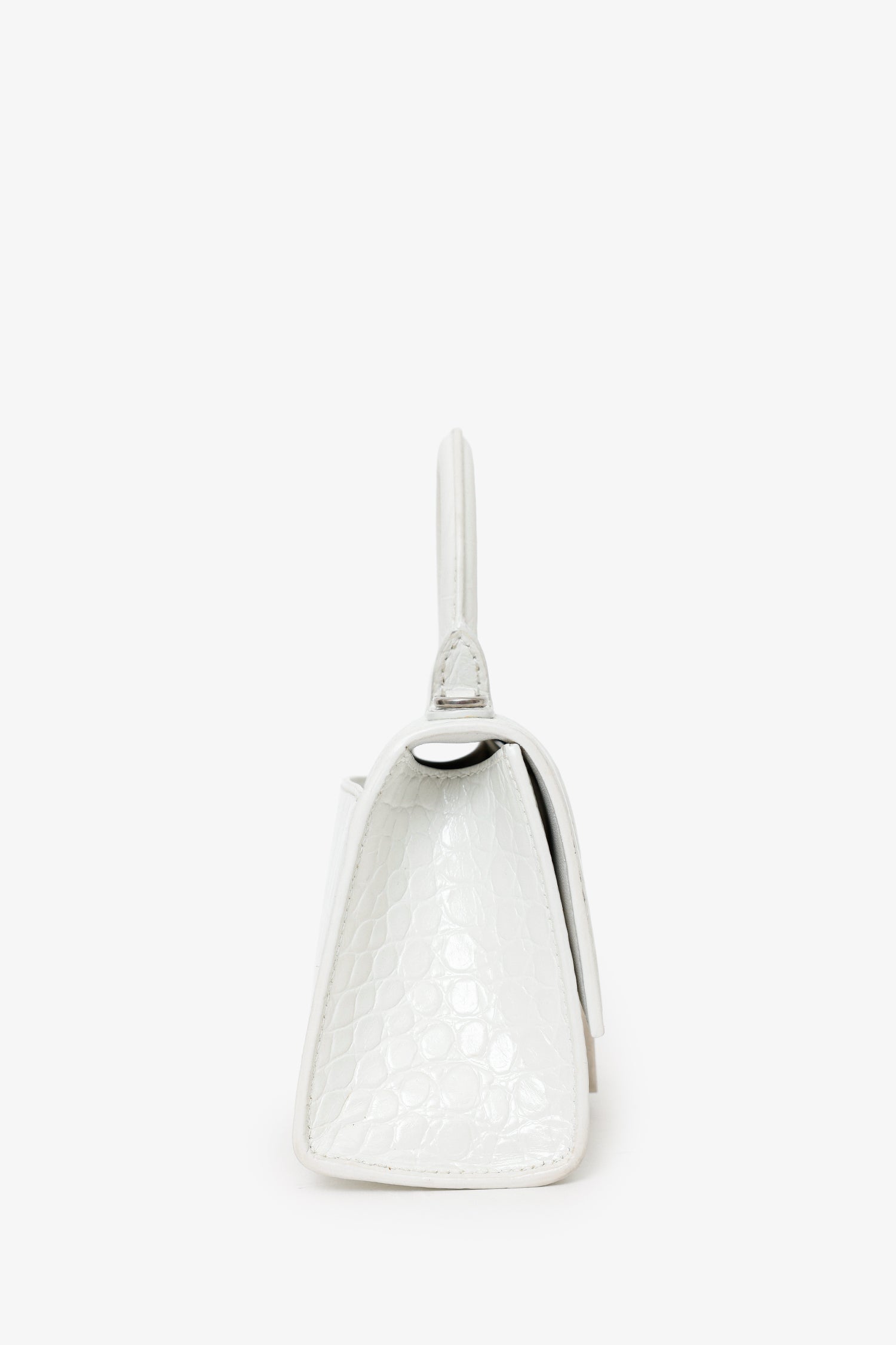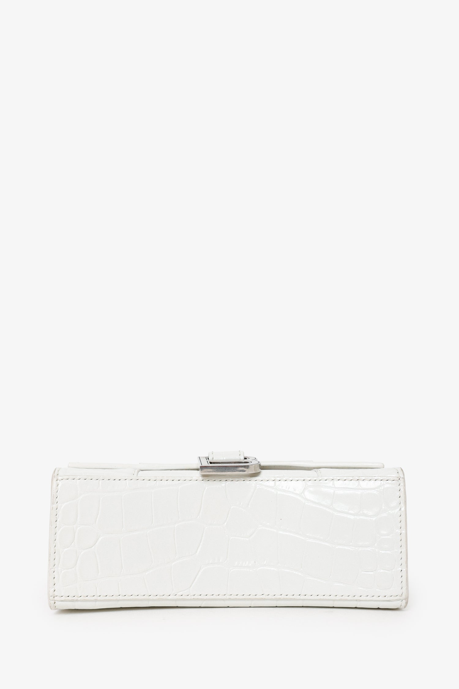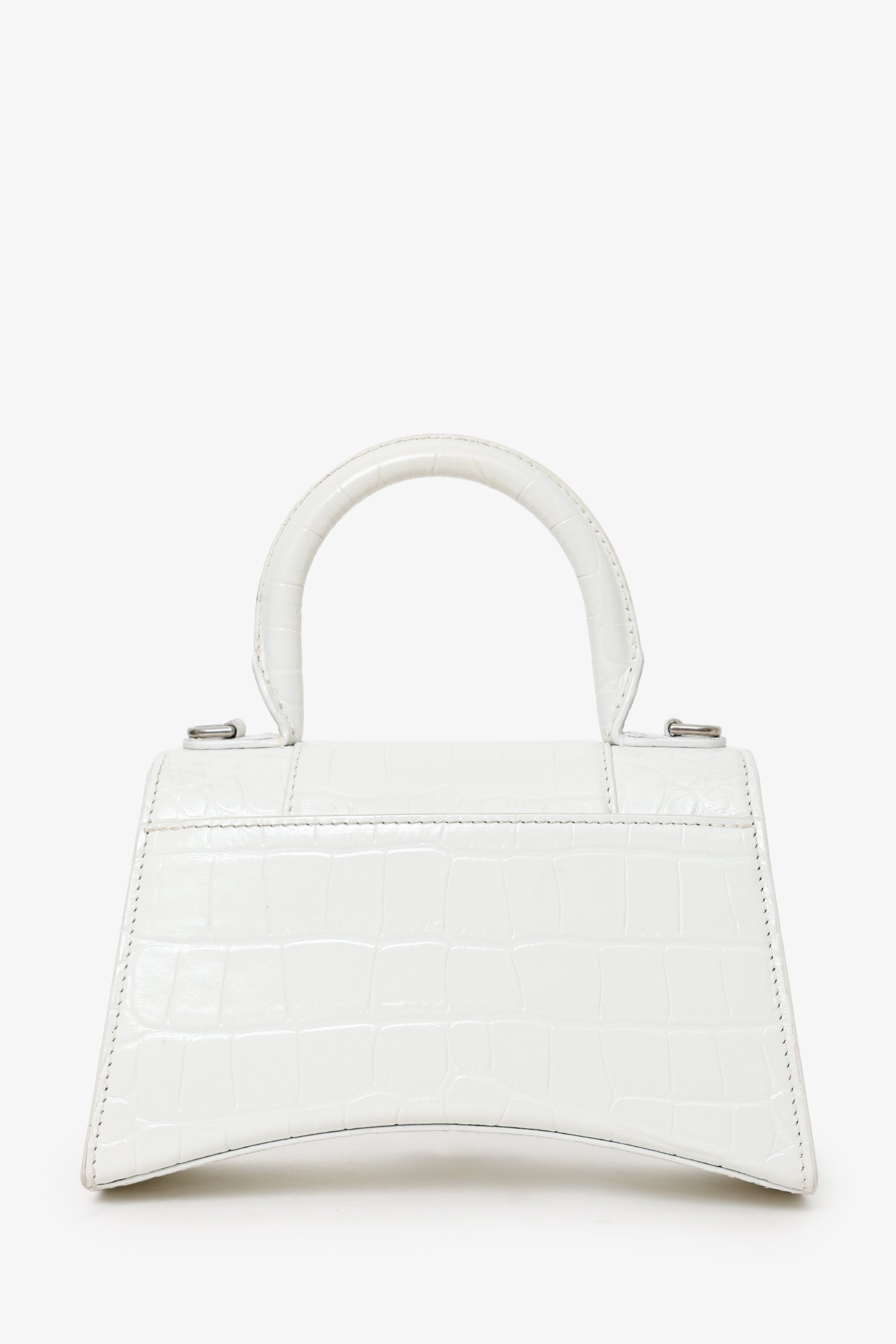 Refresh availabilityBalenciaga White Croc Embossed XS Hourglass Top Handle Bag With Strap. Front fold-over flap with button-up closure. Top handle. Removable and adjustable push-pin buckle closure strap with clasp closure. Single rear exterior slip pocket. Open interior. Silver-tone hardware. Tonal stitching.