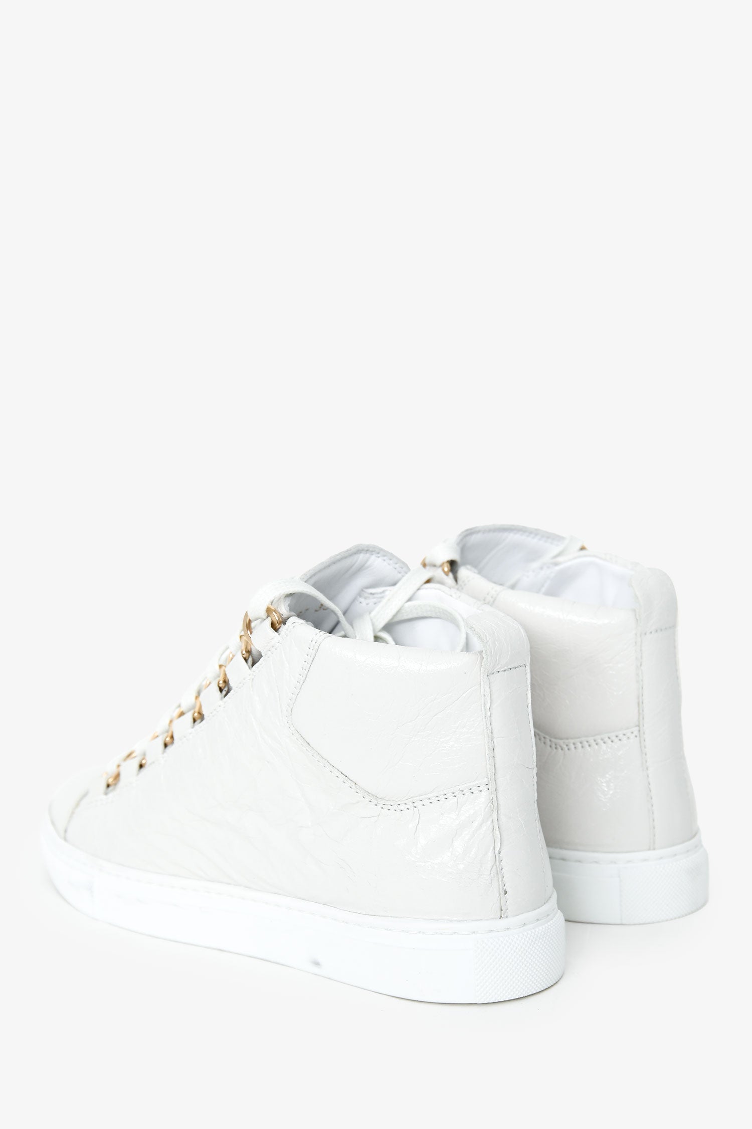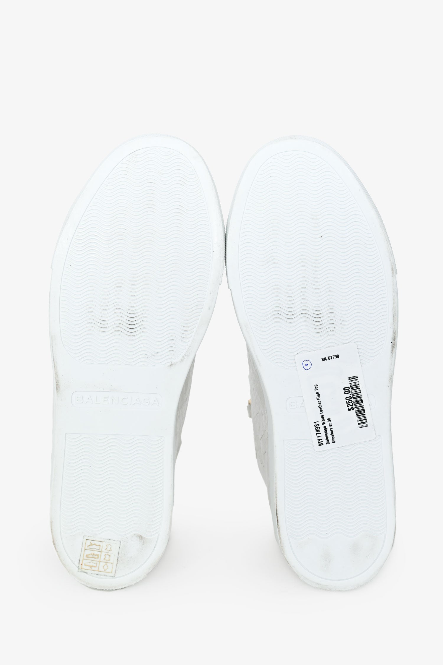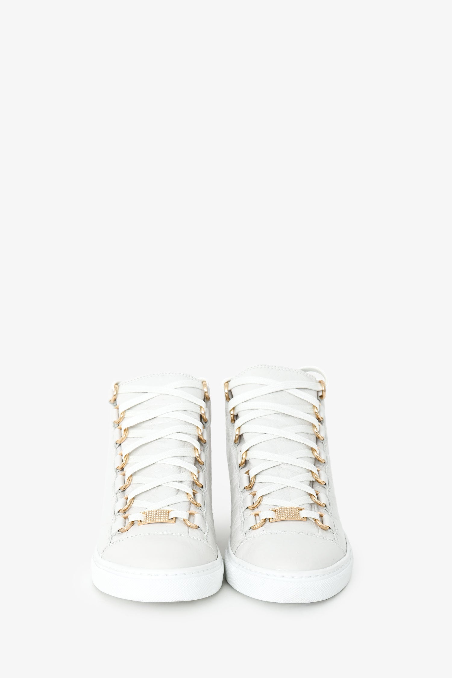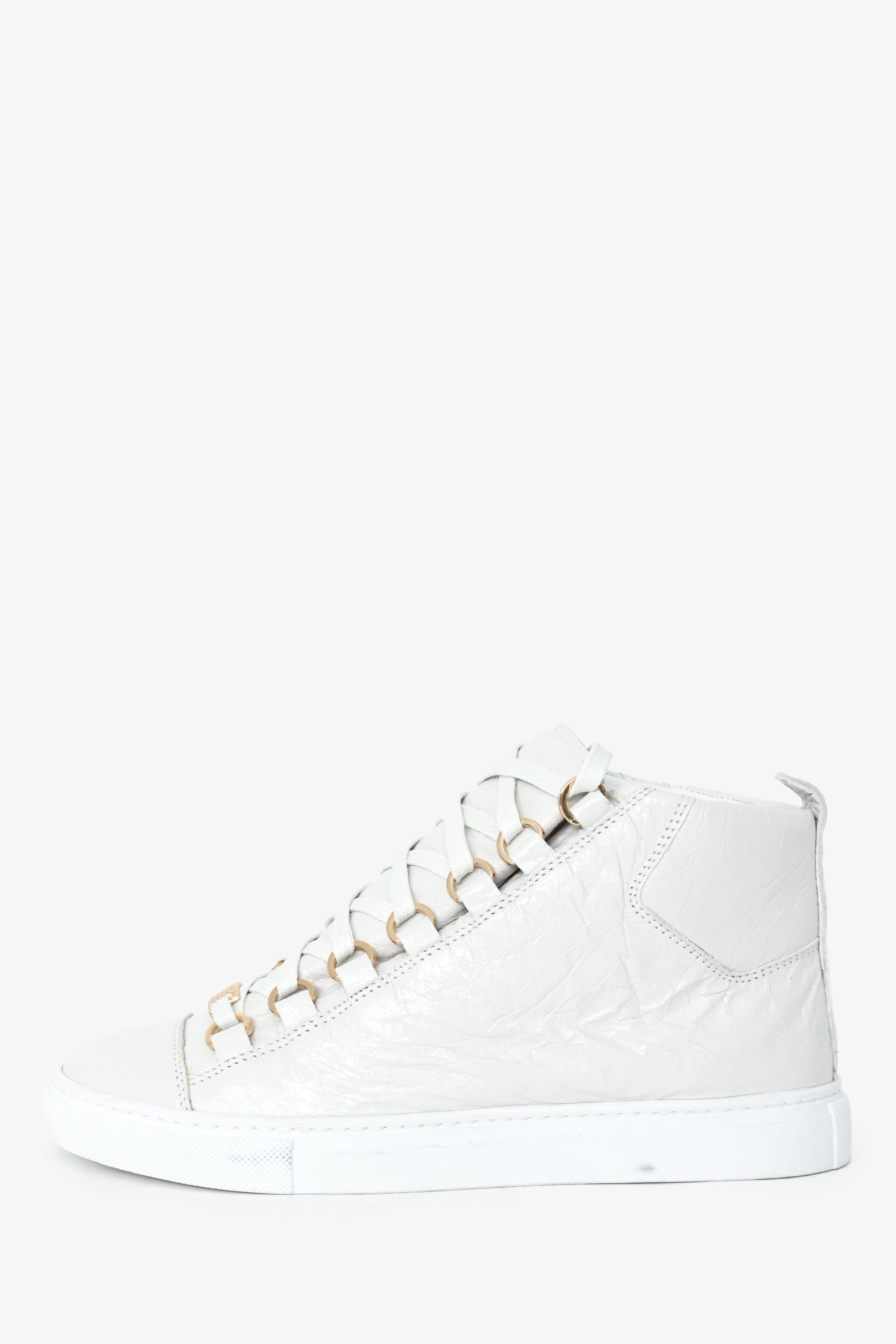 Refresh availabilityBalenciaga White Leather High Top Sneakers. Lace-up detail. Leather insole. Gold-tone hardware. Tonal stitching.