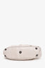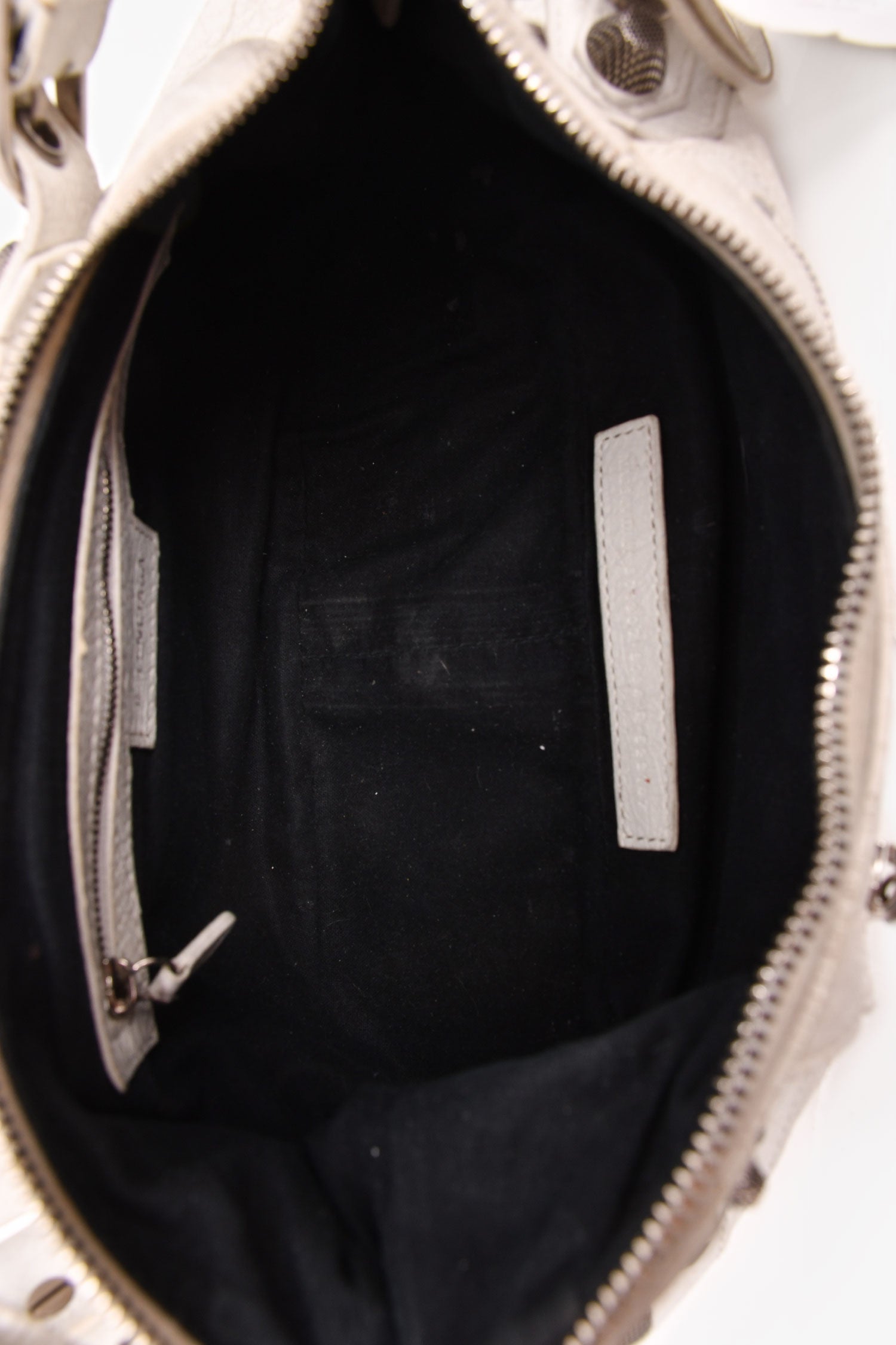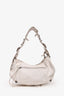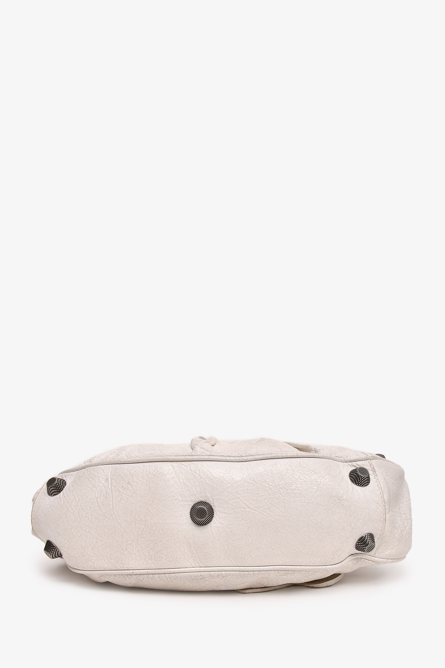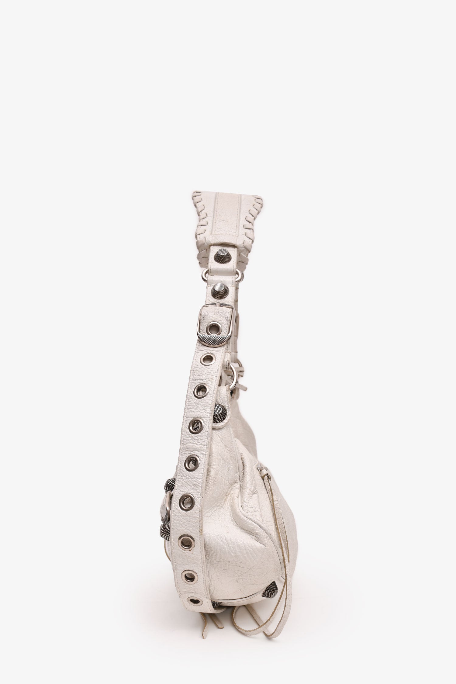 Balenciaga White Leather Le Cagole Small 2022 Shoulder Bag. Silver-tone studs and hardware. Front zipper with leather strap pulls. Zipped top. Studded leather strap with weaved detail and grommets. Lined interior with a zipped compartment. Attached heart shaped mirror and zipped compartment.