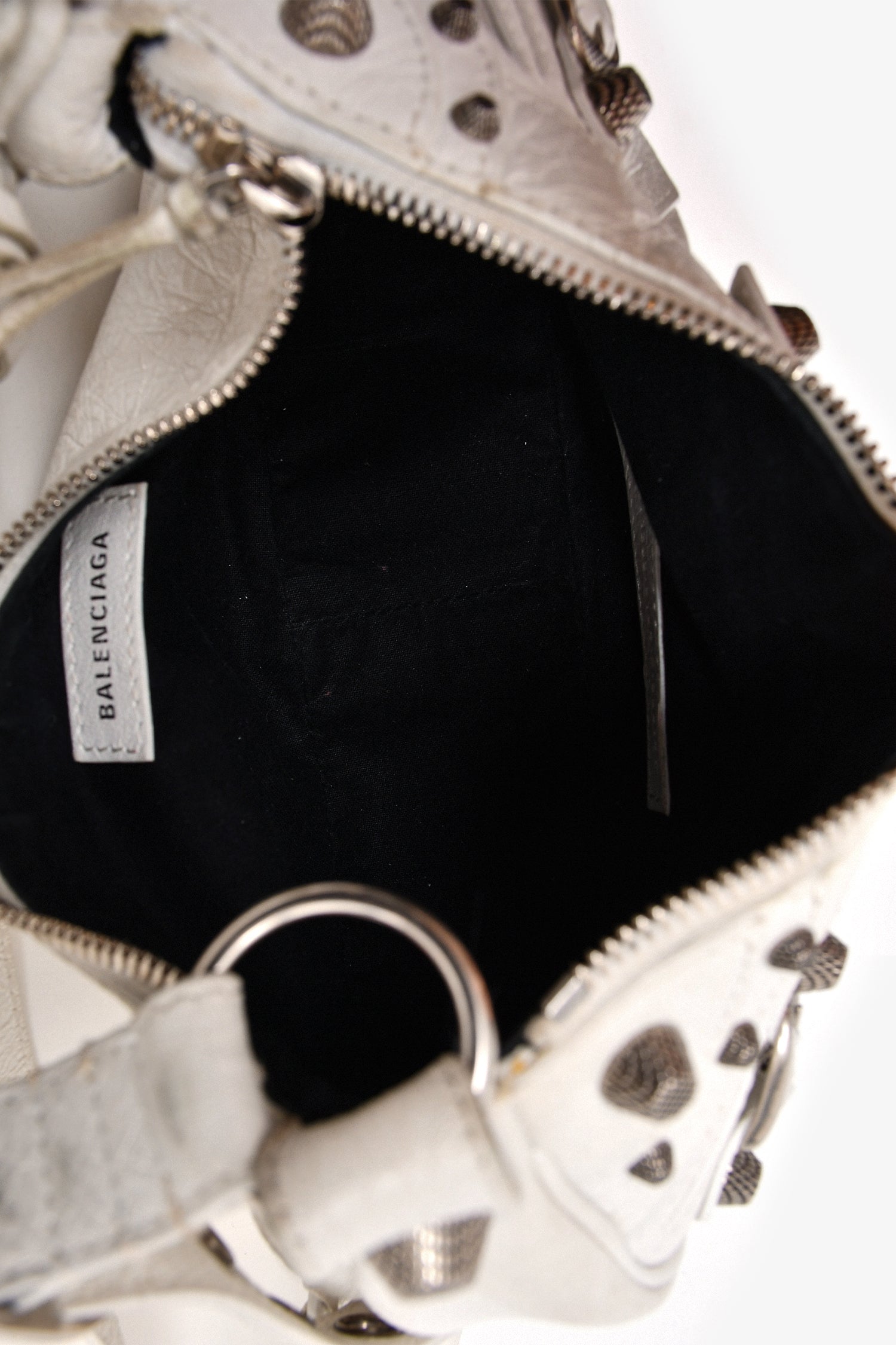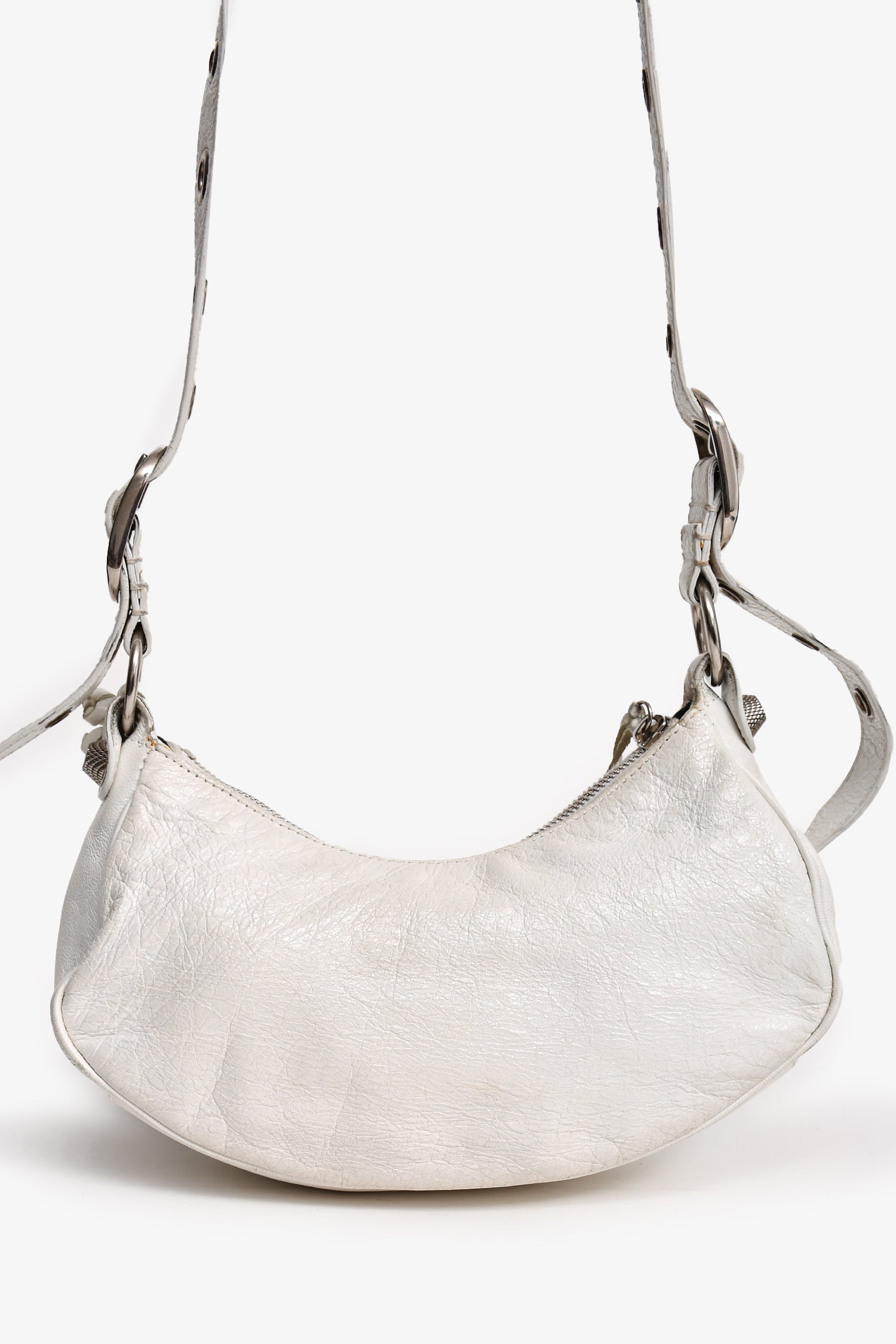 Refresh availabilityBalenciaga White Leather XS Le Cagole Crossbody Bag. Antiqued silver-tone hardware. Tonal stitching. Zipped top. Studded detail and grommets throughout. Crossbody strap with woven leather. Lined interior.