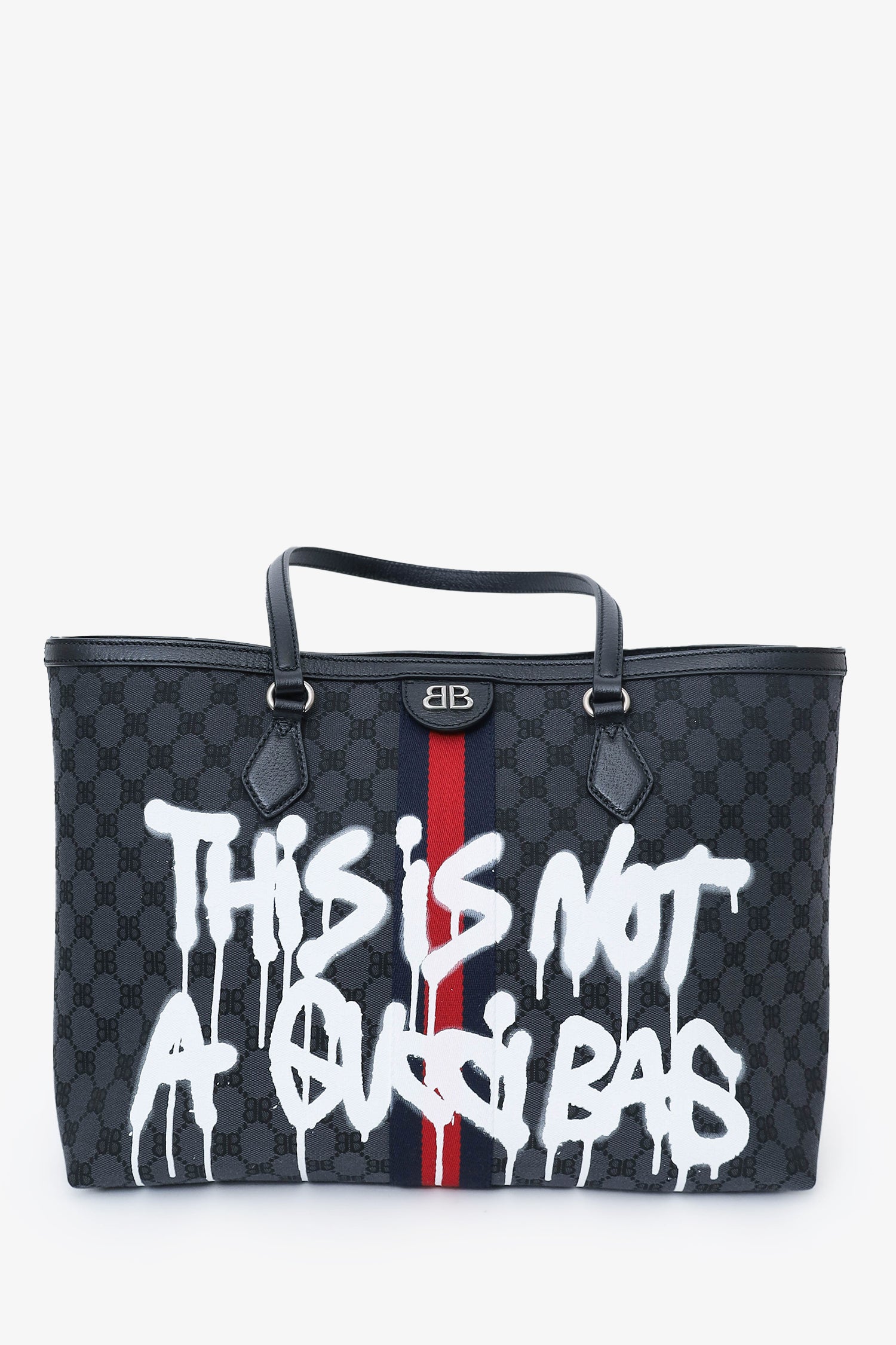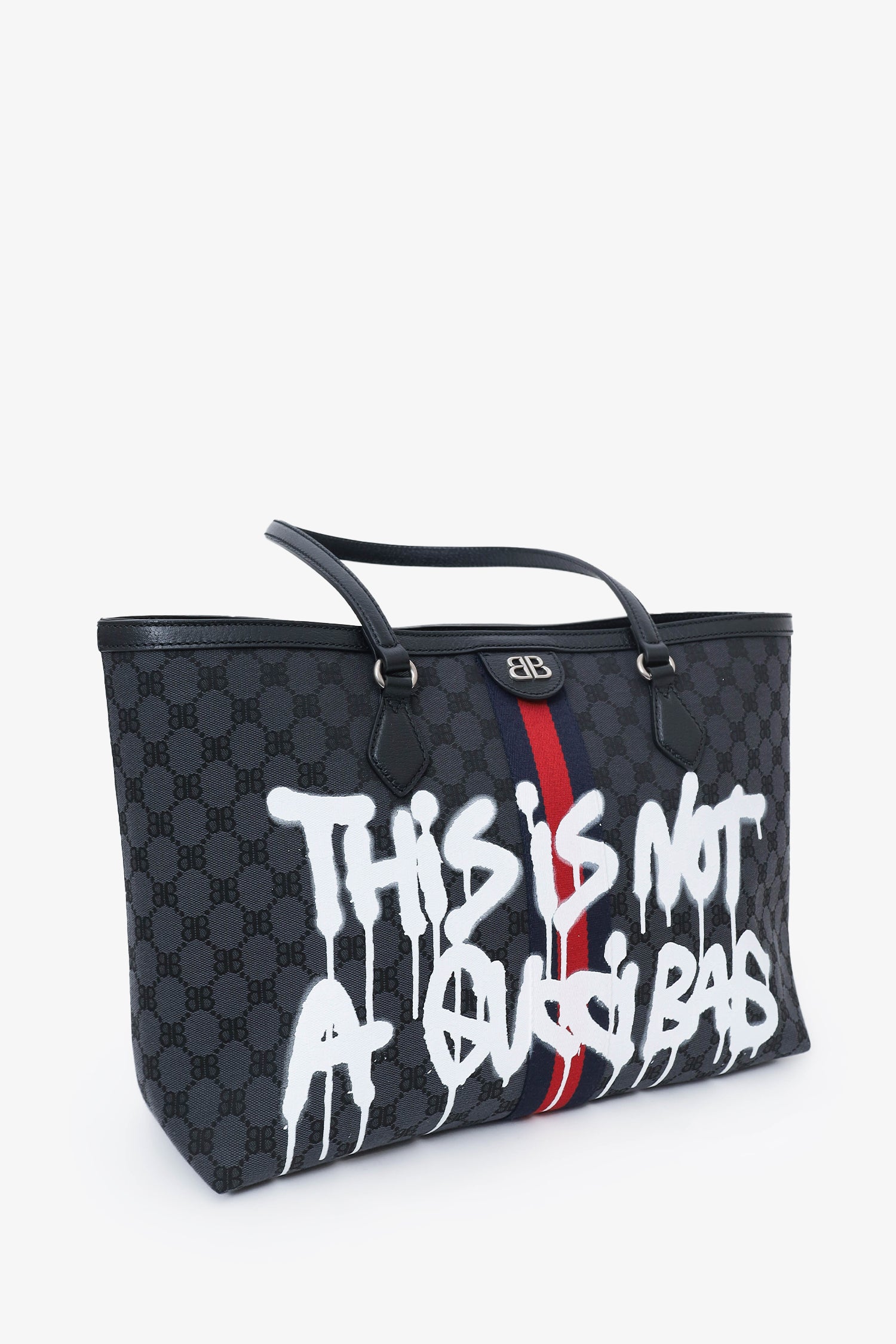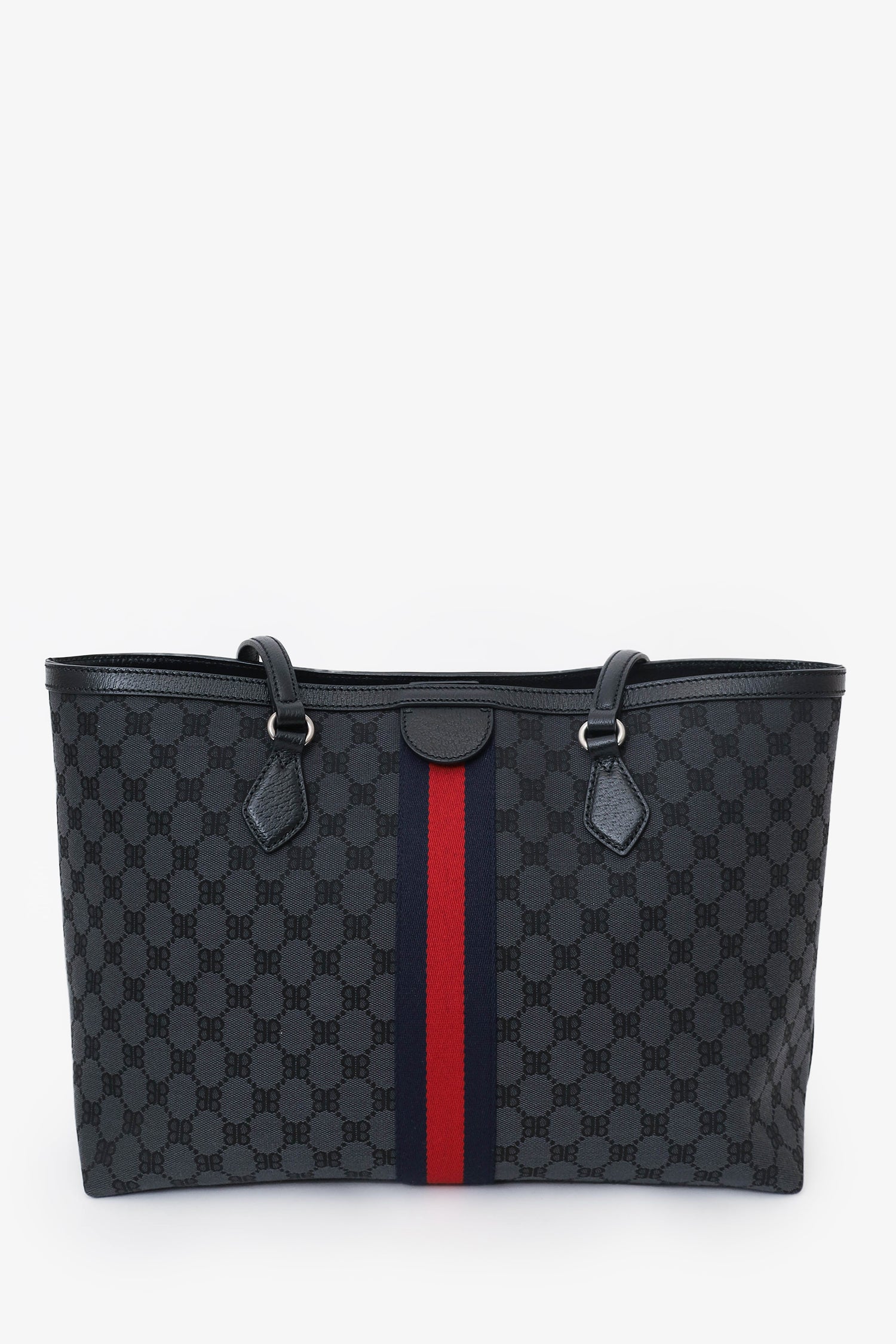Refresh availabilityBalenciaga x Gucci Black BB Monogram Web Graffiti Medium Ophidia Shopping Tote. Front magnetic closure. Top dual handles. Logo on front. 2 interior compartments; 1 slip and 1 zip closure. Silver-tone hardware. Tonal stitching.