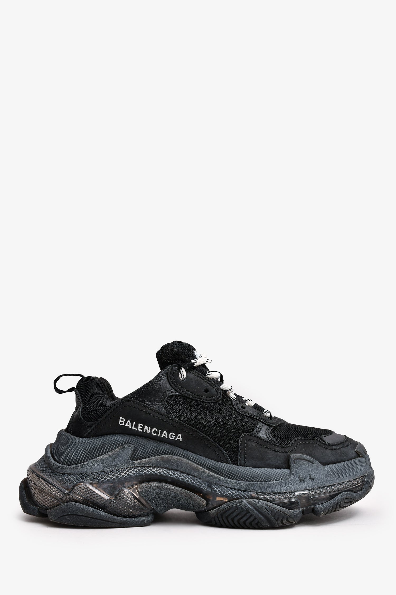 Refresh availabilityBalenciaga Black Triple S Sneakers. PVC platform. Two-tone lace. Branding on the side. Tonal stitching.