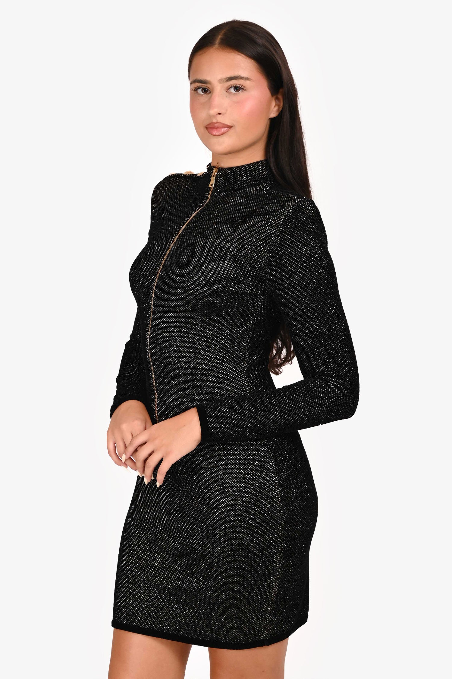 Refresh availabilityBalmain Back/Gold Knit Long Sleeve Mini Dress. Front zip closure. Padded shoulders.