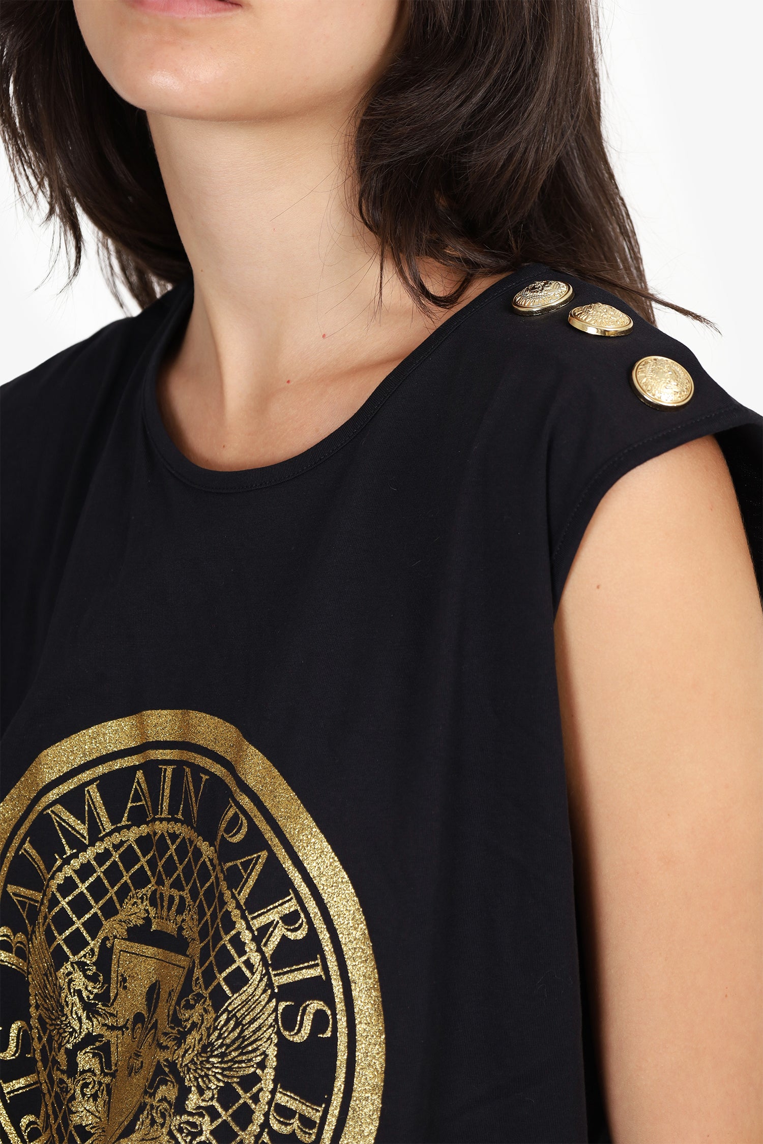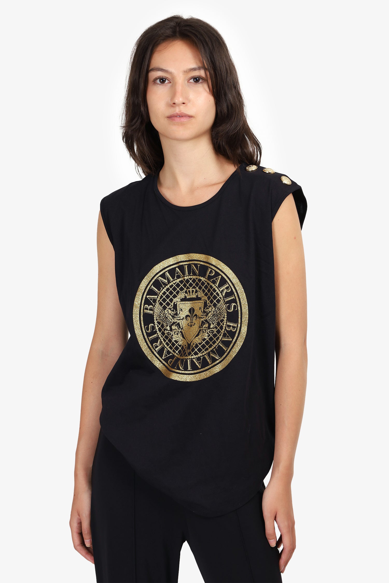 Refresh availabilityBalmain Black Cotton Logo Print Sleeveless Top. Round neckline. Pull-over. Unlined. Tonal stitching.