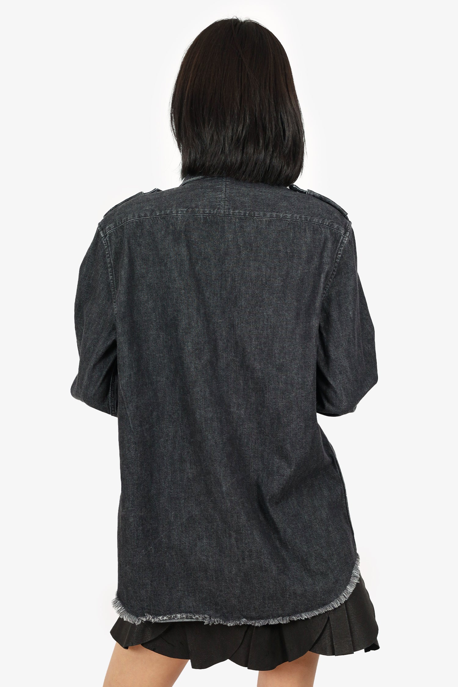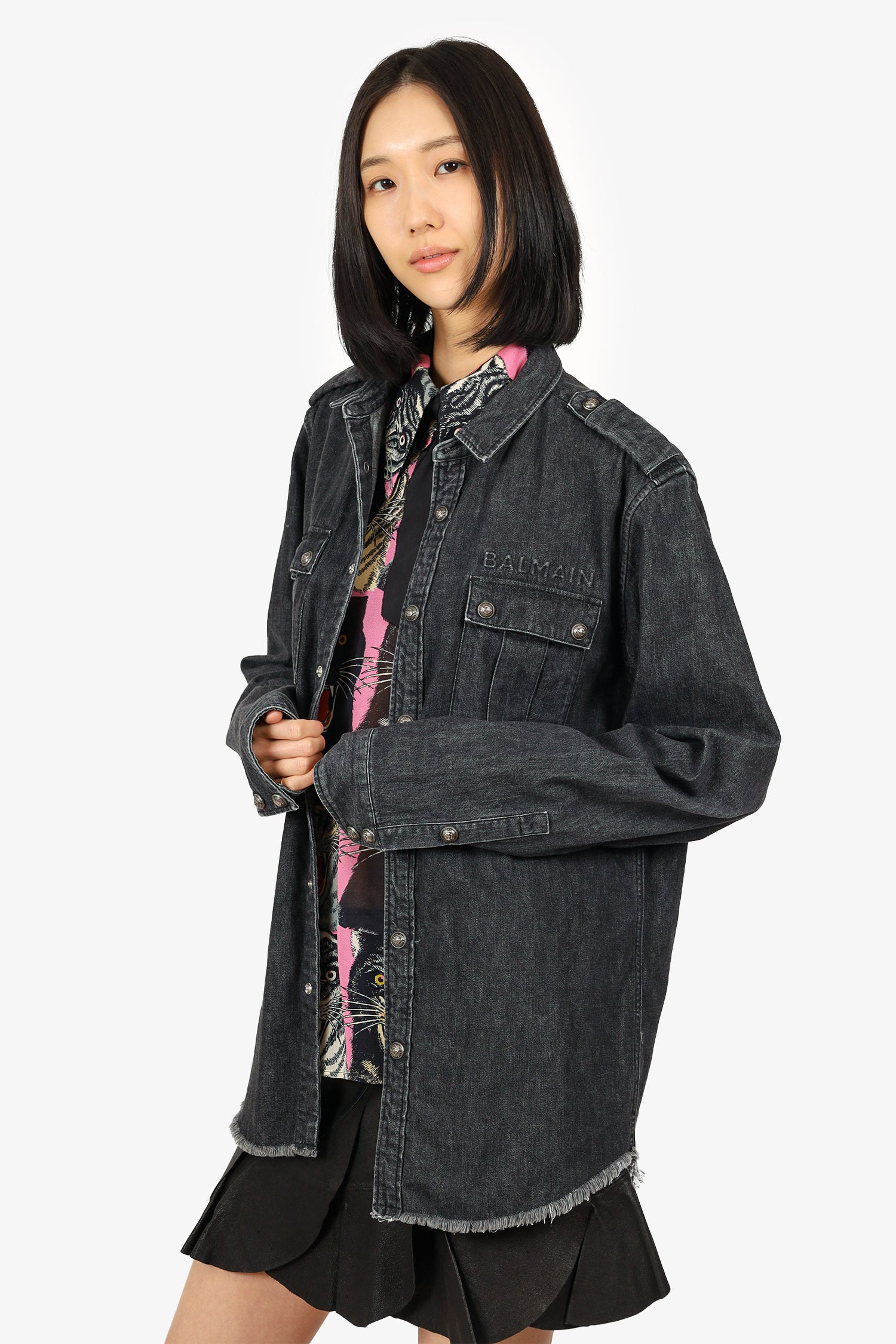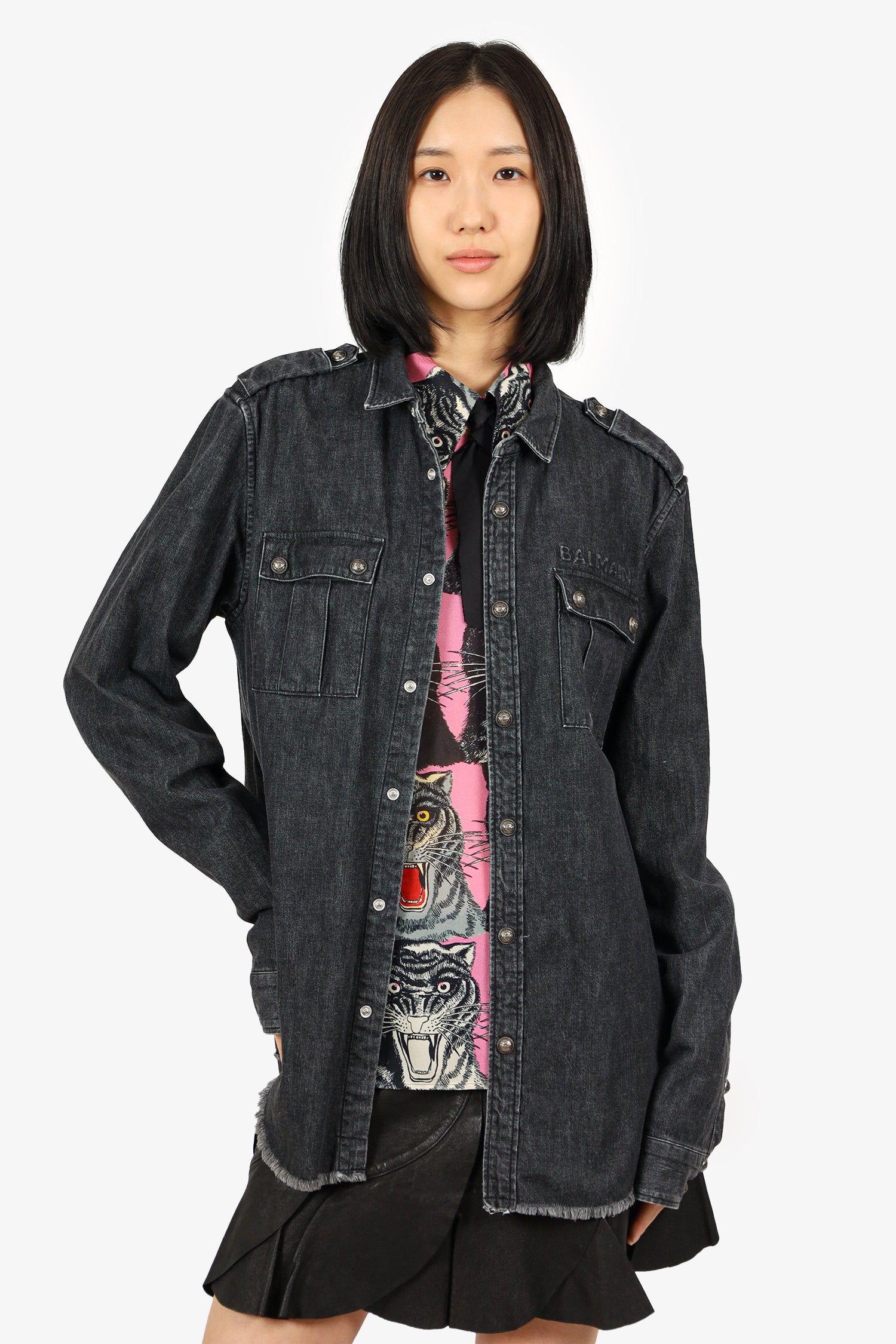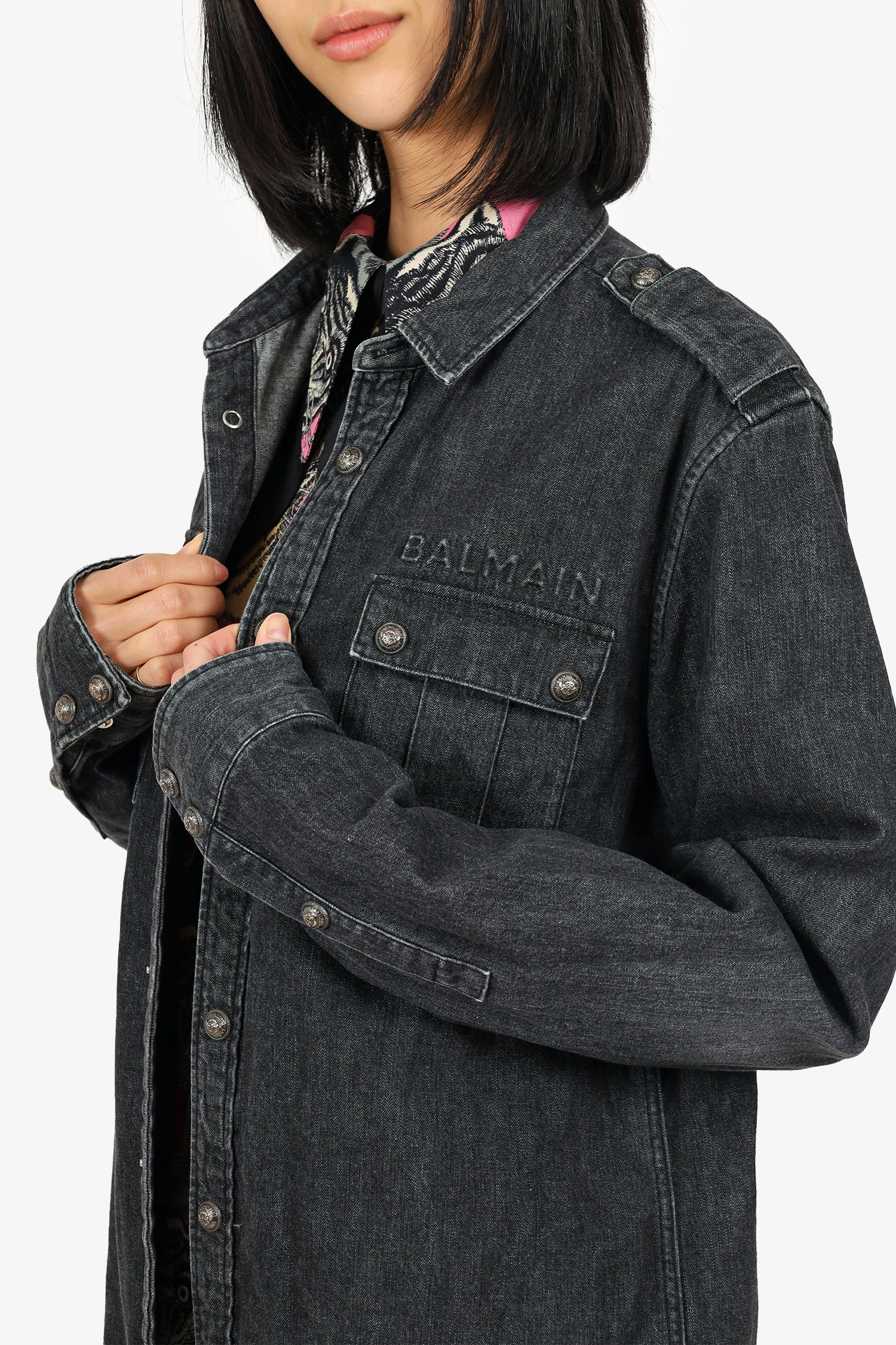 Refresh availabilityBalmain Black Denim Embossed Logo Shirt. Collared-neckline. Front snap-button closure. Strap on shoulders with snap-button closure. Snap-button closure on sleeve cuffs. Front exterior flap pockets with snap-button closure. Raw bottom hem. Silver-tone hardware. Tonal stitching.