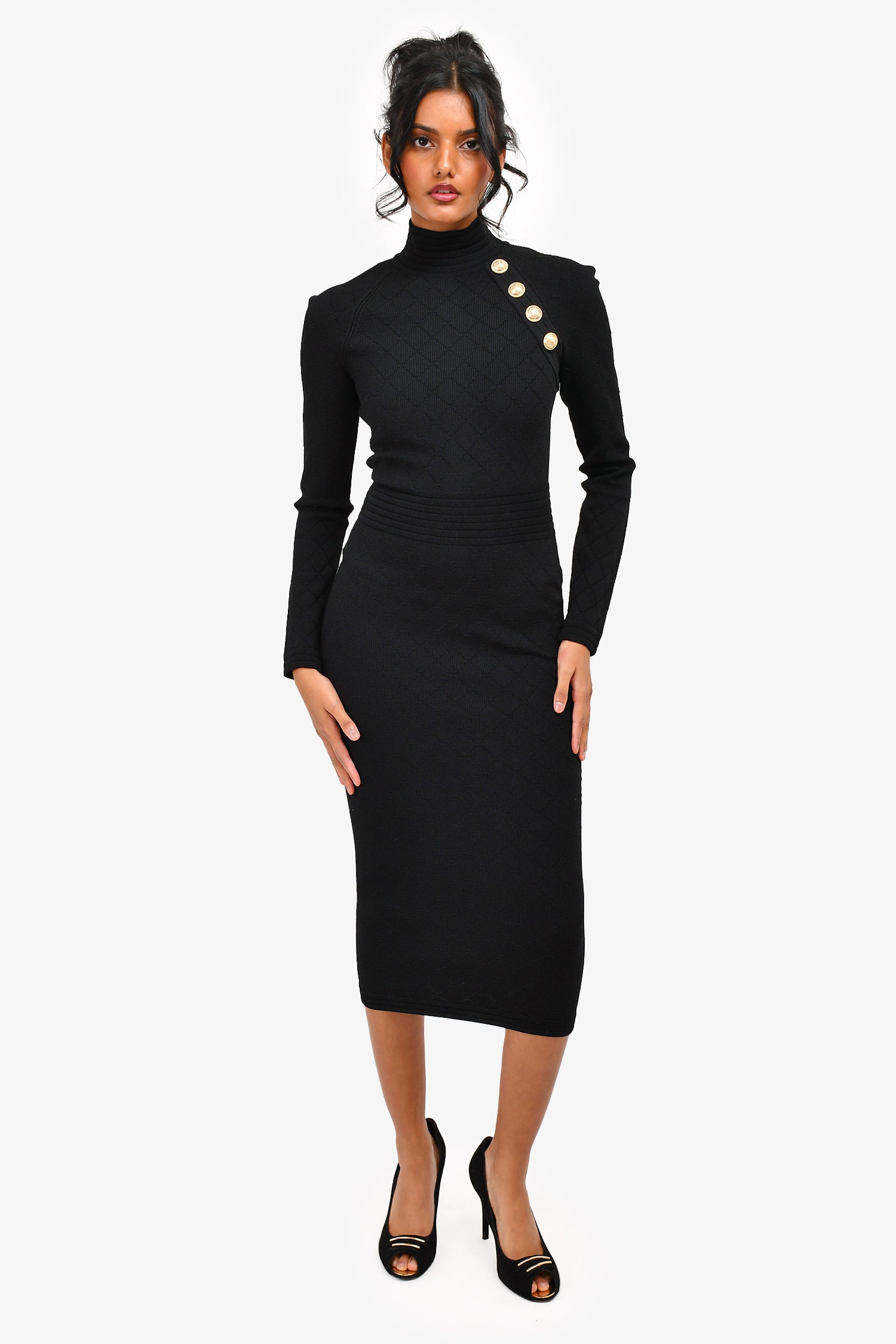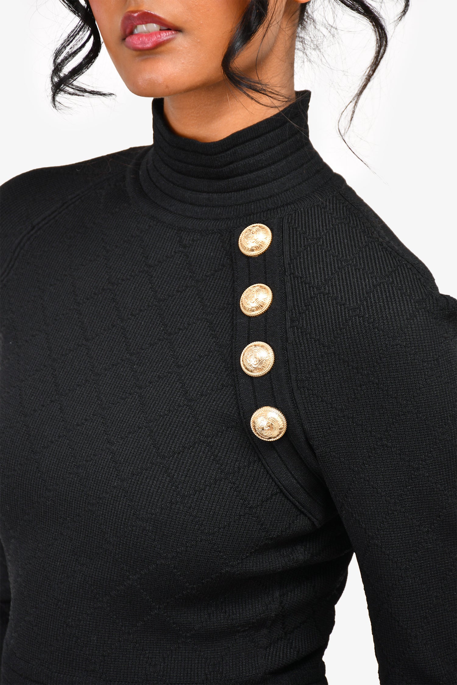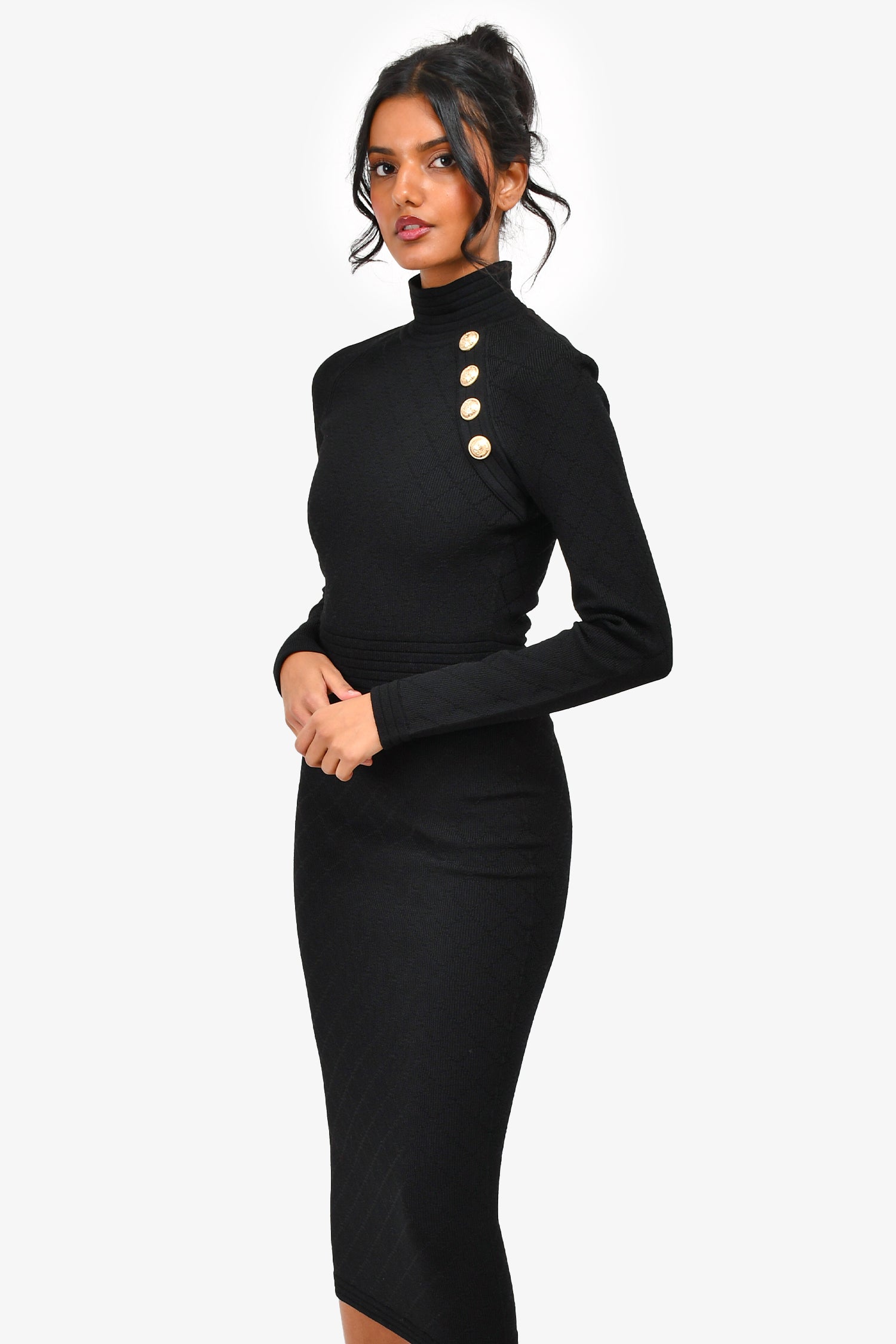 Refresh availabilityBalmain Black Knit Button Detail High Neck Midi Dress.