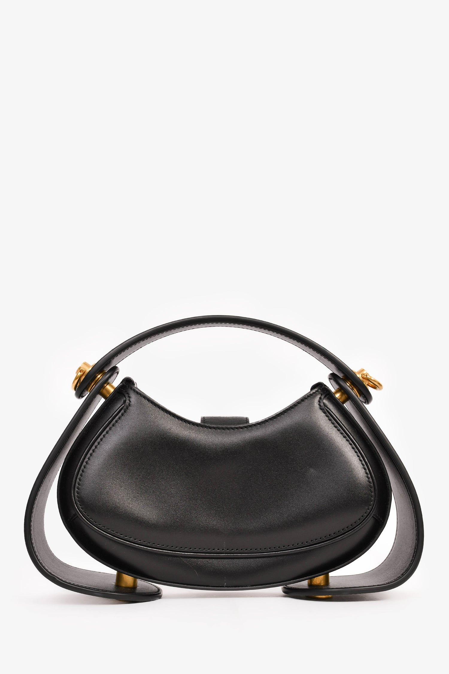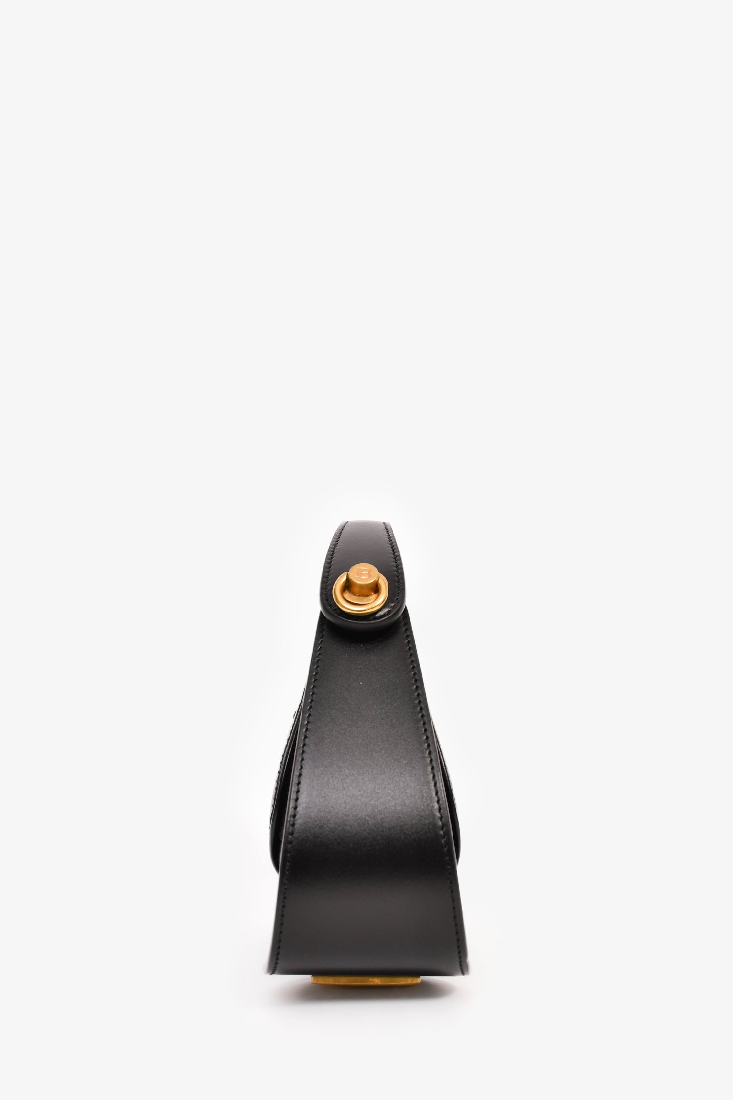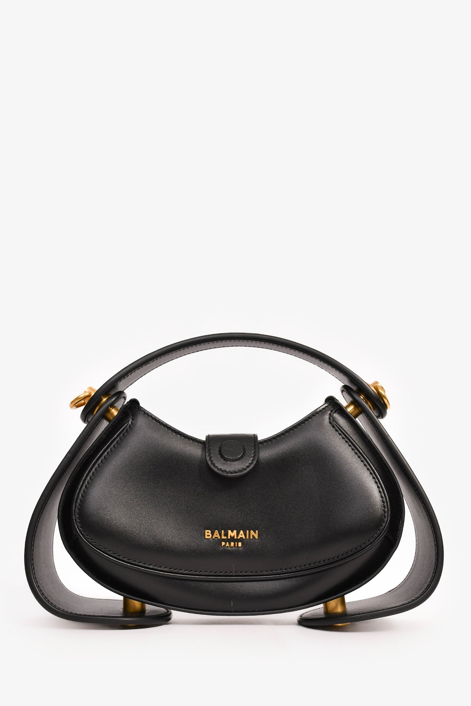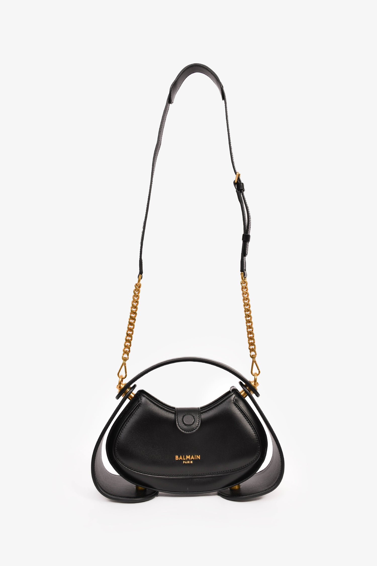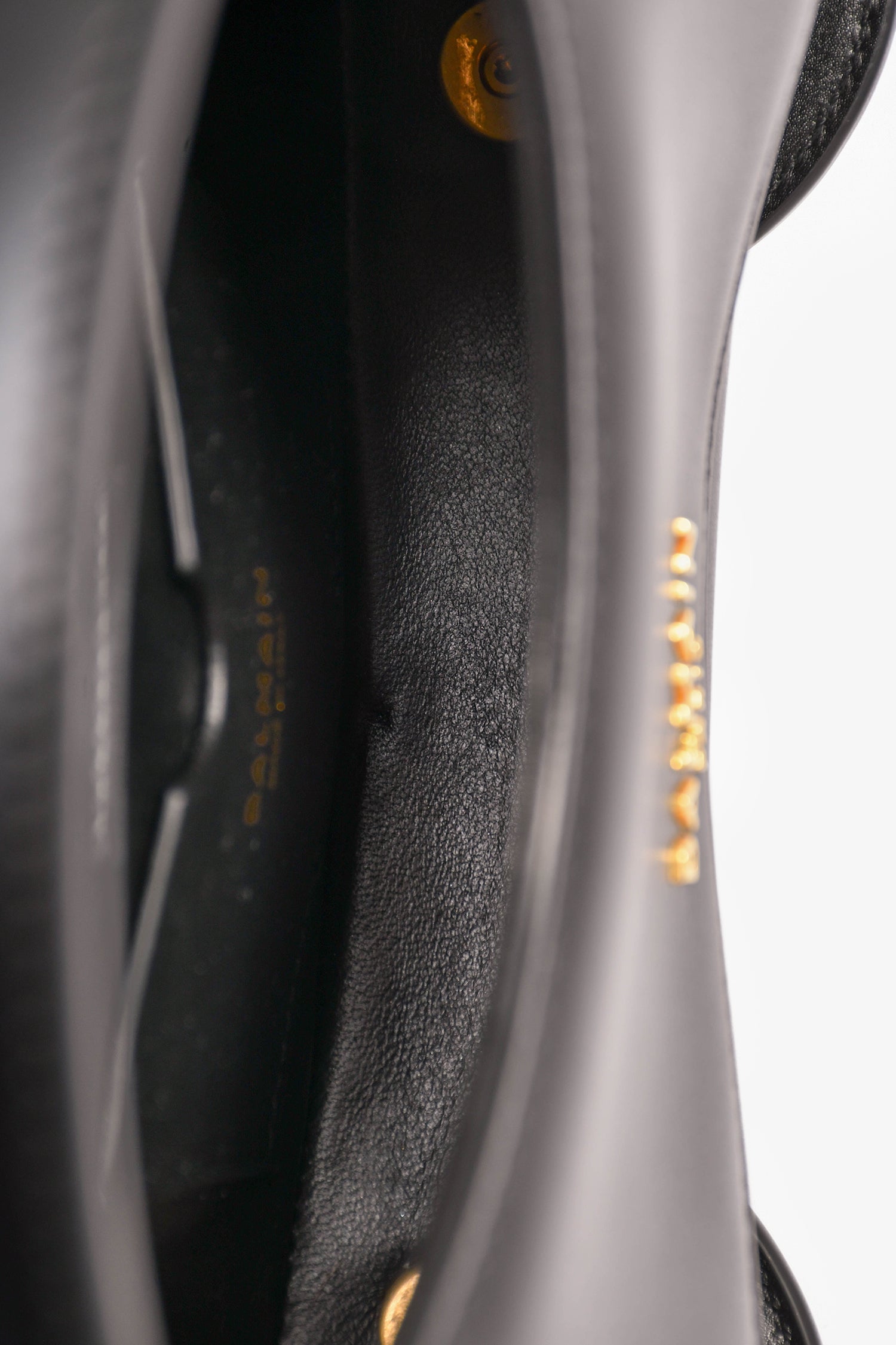 Refresh availabilityBalmain Black Leather Jolie Madame Bag. Flat top handle. Gold-tone hardware. Inner magnetic strap. Chain-link and magnetic shoulder strap. Leather lined interior. Tonal stitching.