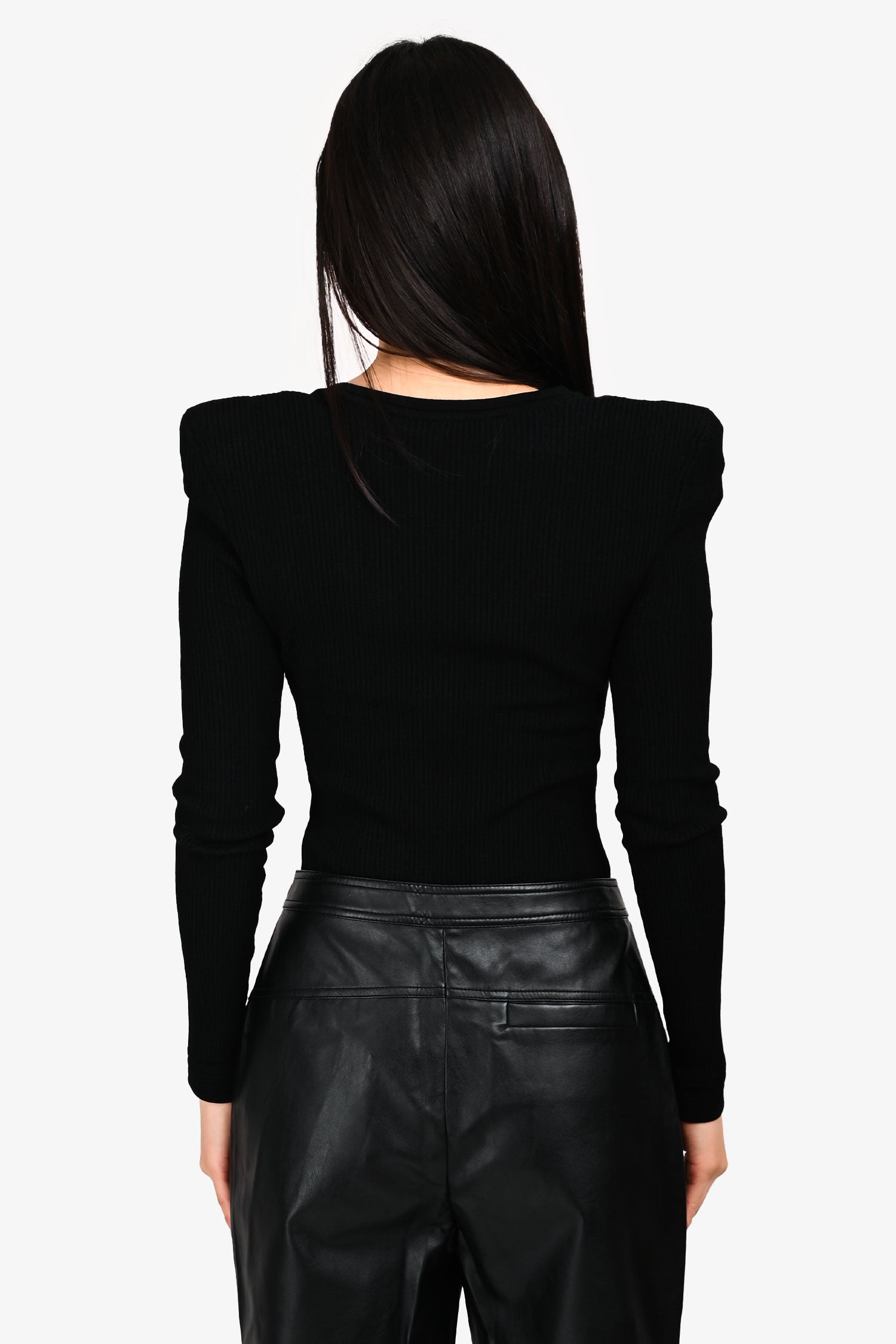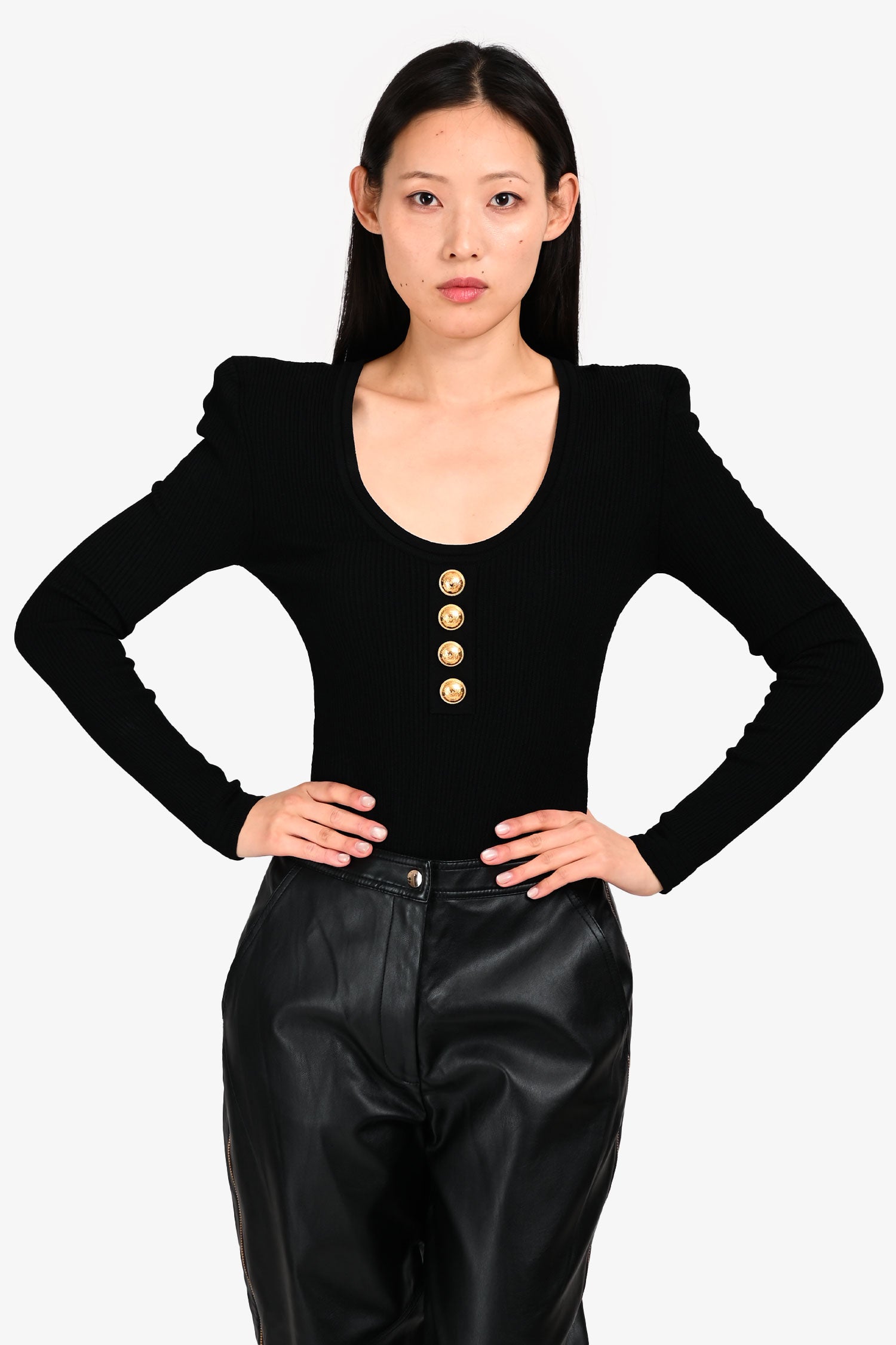 Refresh availabilityBalmain Black Ribbed Padded Shoulder Bodysuit with Gold Buttons. Pull-on. Scoop neckline. Tonal-stitching. Gold-tone hardware.