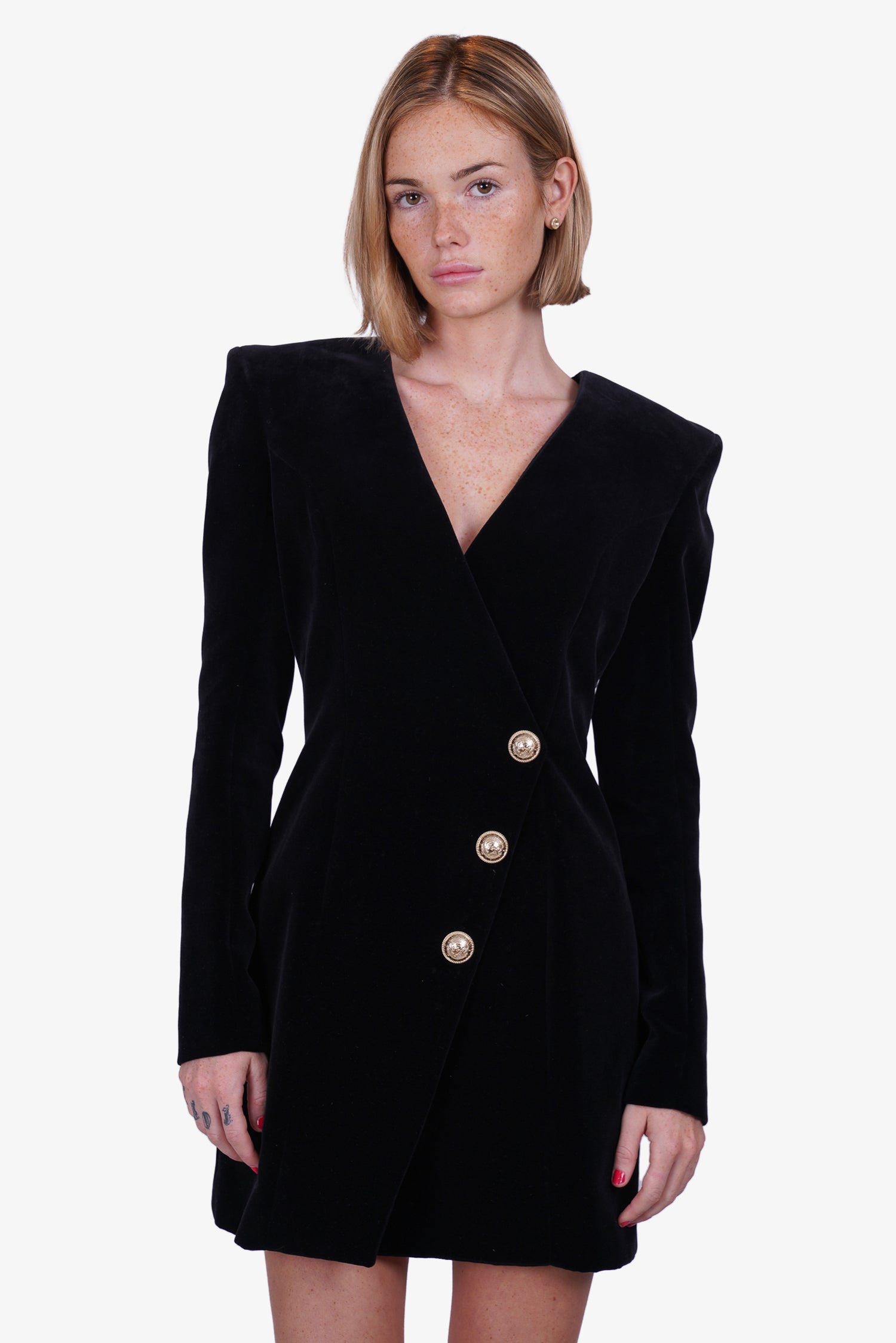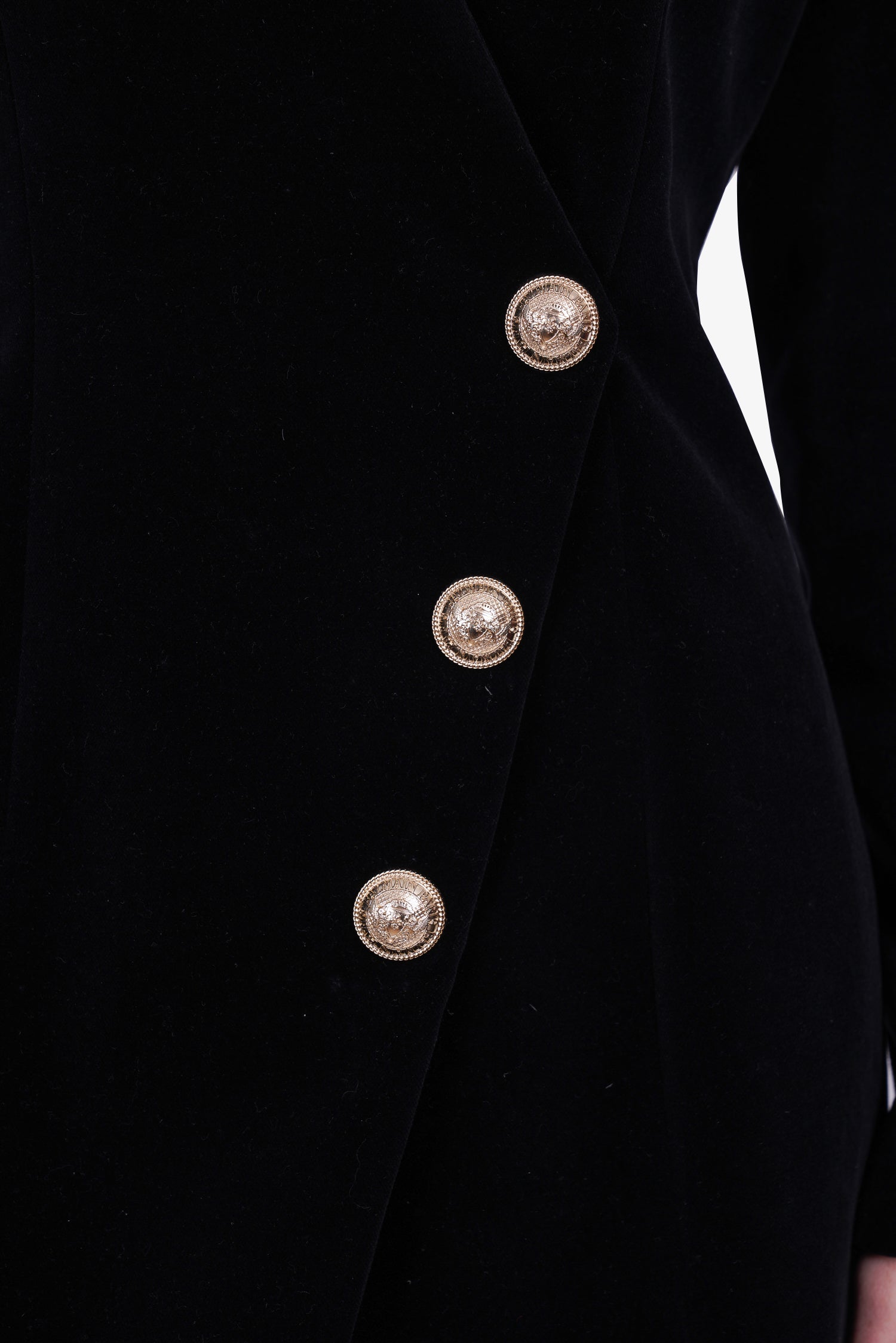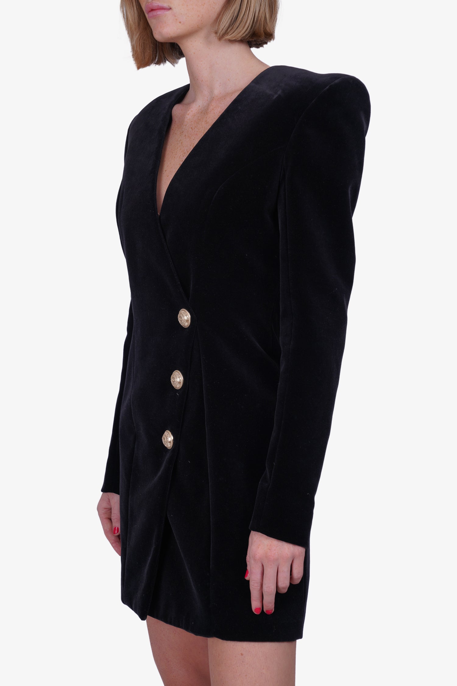 Refresh availabilityBalmain Black Velvet Gold Button Blazer Dress. V-neck. Rear zip closure. Lined. Gold-tone hardware. Tonal stitching.