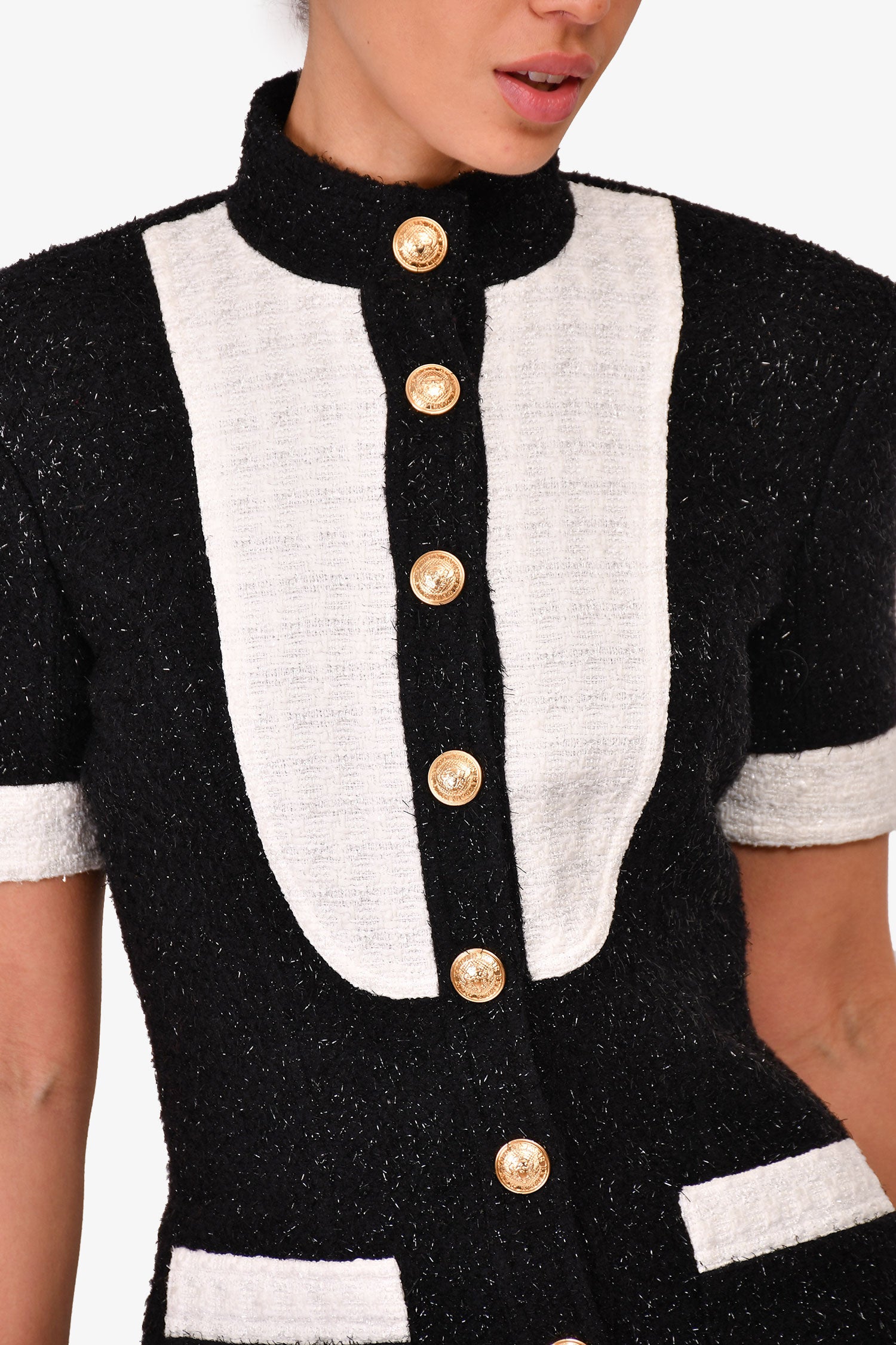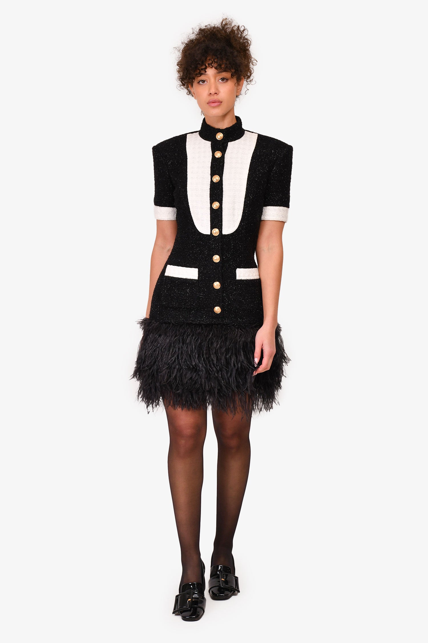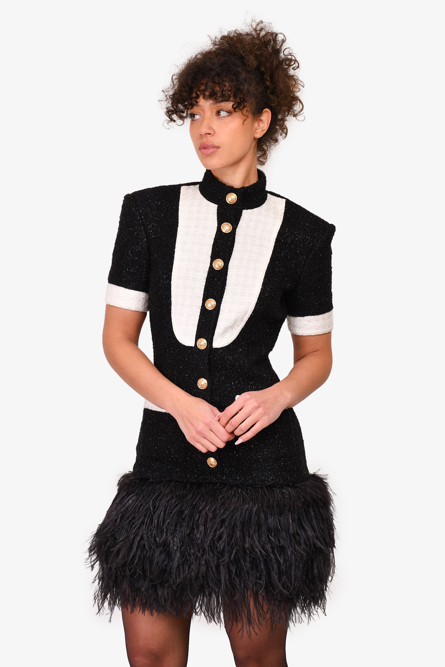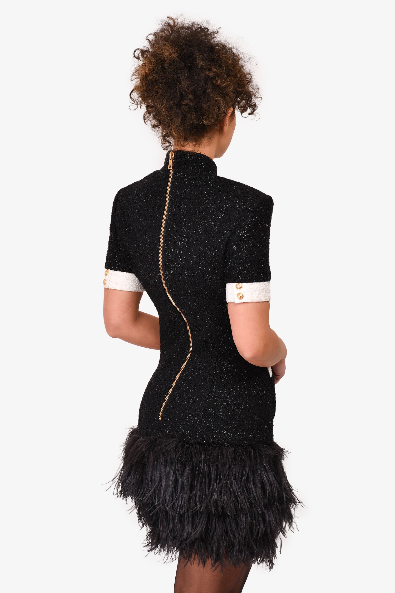 Refresh availabilityBalmain Black/White Tweed Buttoned Feather Trimmed Dress. Front snap closures. White tweed trimming. Back gold-tone zip-up. Feather detailing on the lower waist. Silver-foil stitching. Tonal stitching.