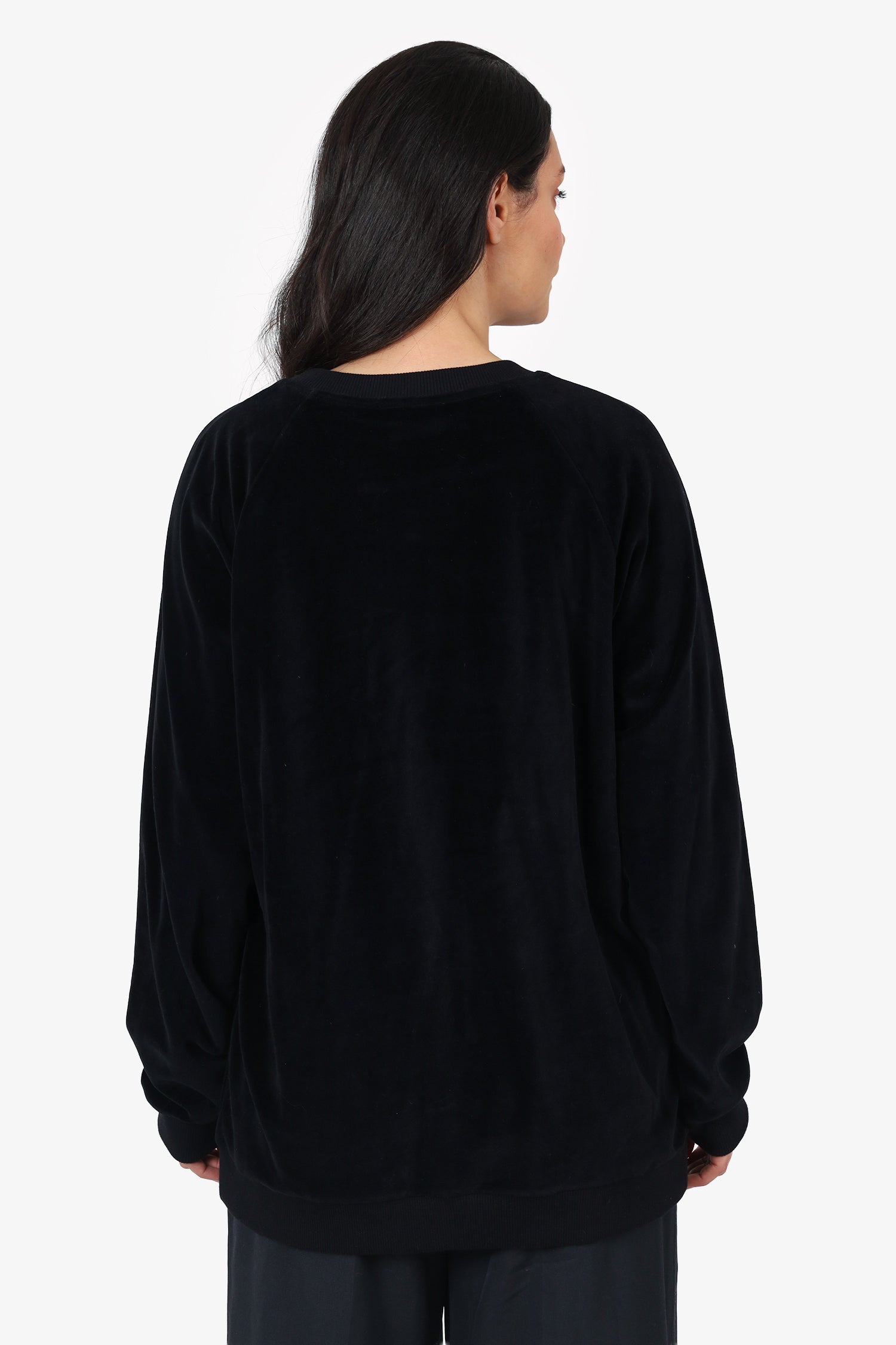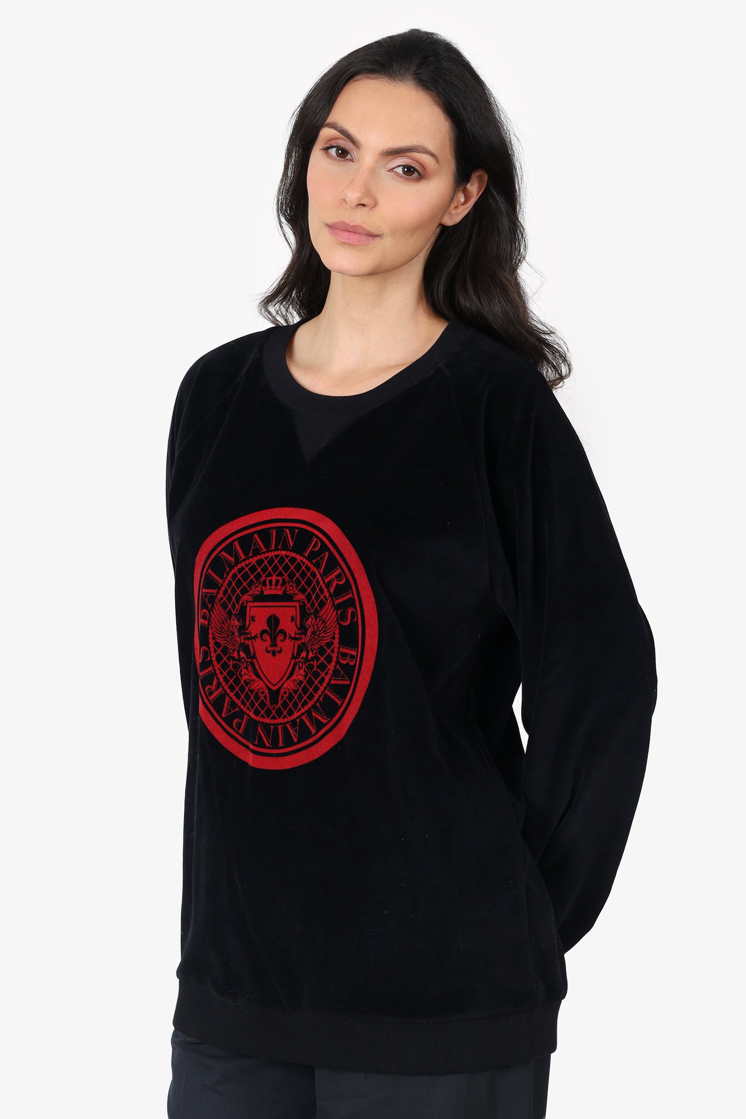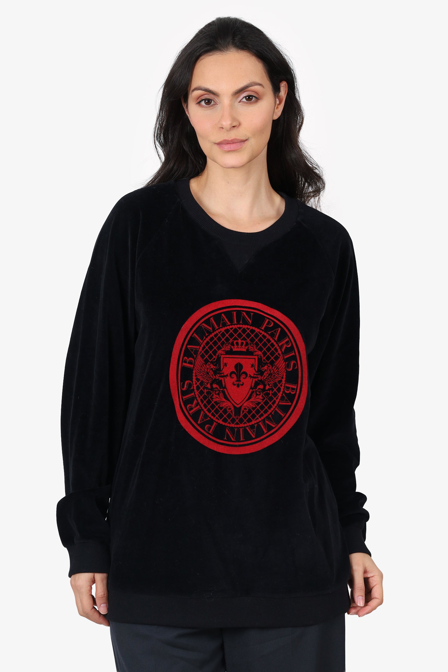 Refresh availabilityBalmain Black/Red Velvet Sweater. Pull-on. Round neckline. Front graphic. Tonal stitching.