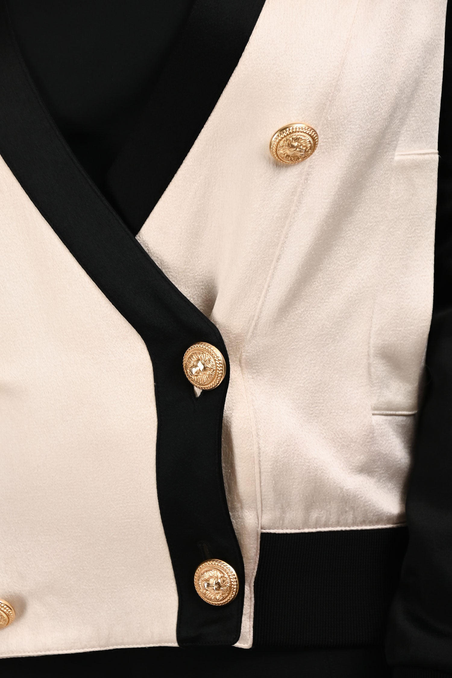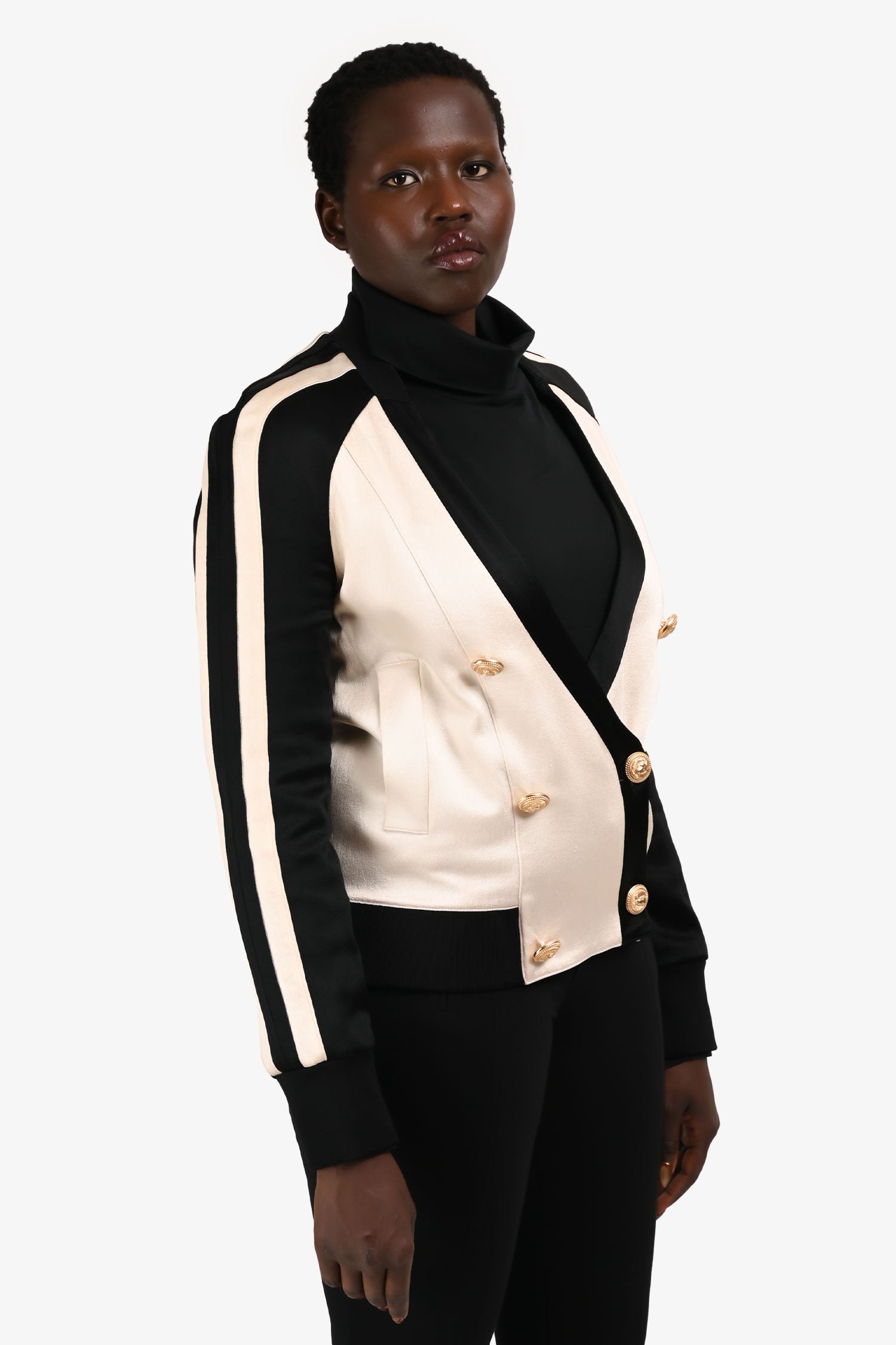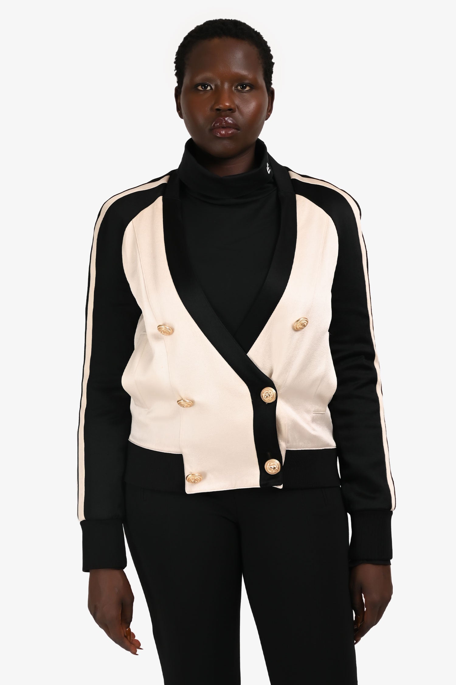 Refresh availabilityBalmain Black/White Striped Double Breasted V-Neck Jacket. Front button-up closure. Front pockets. Lined. Elasticized cuffs.