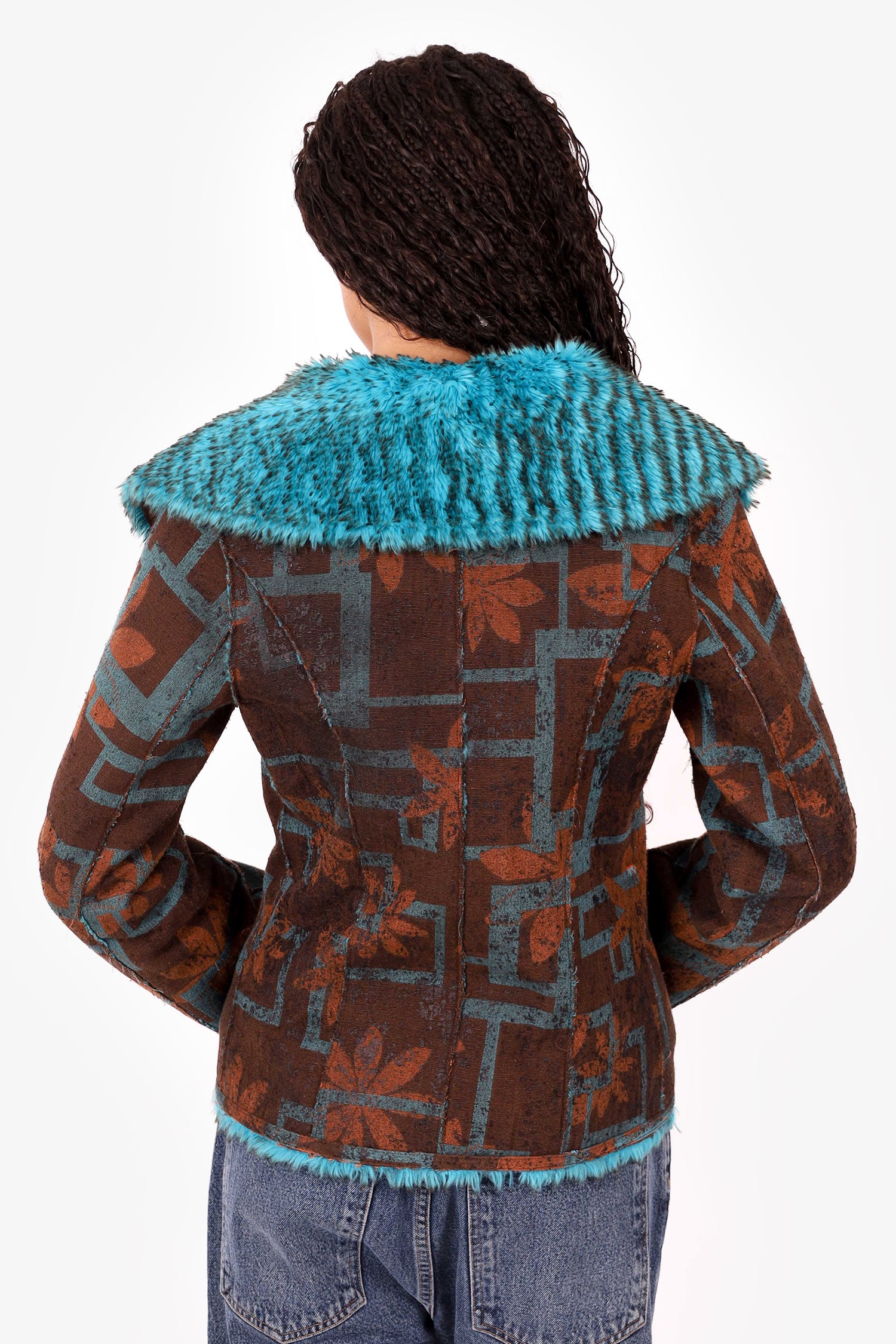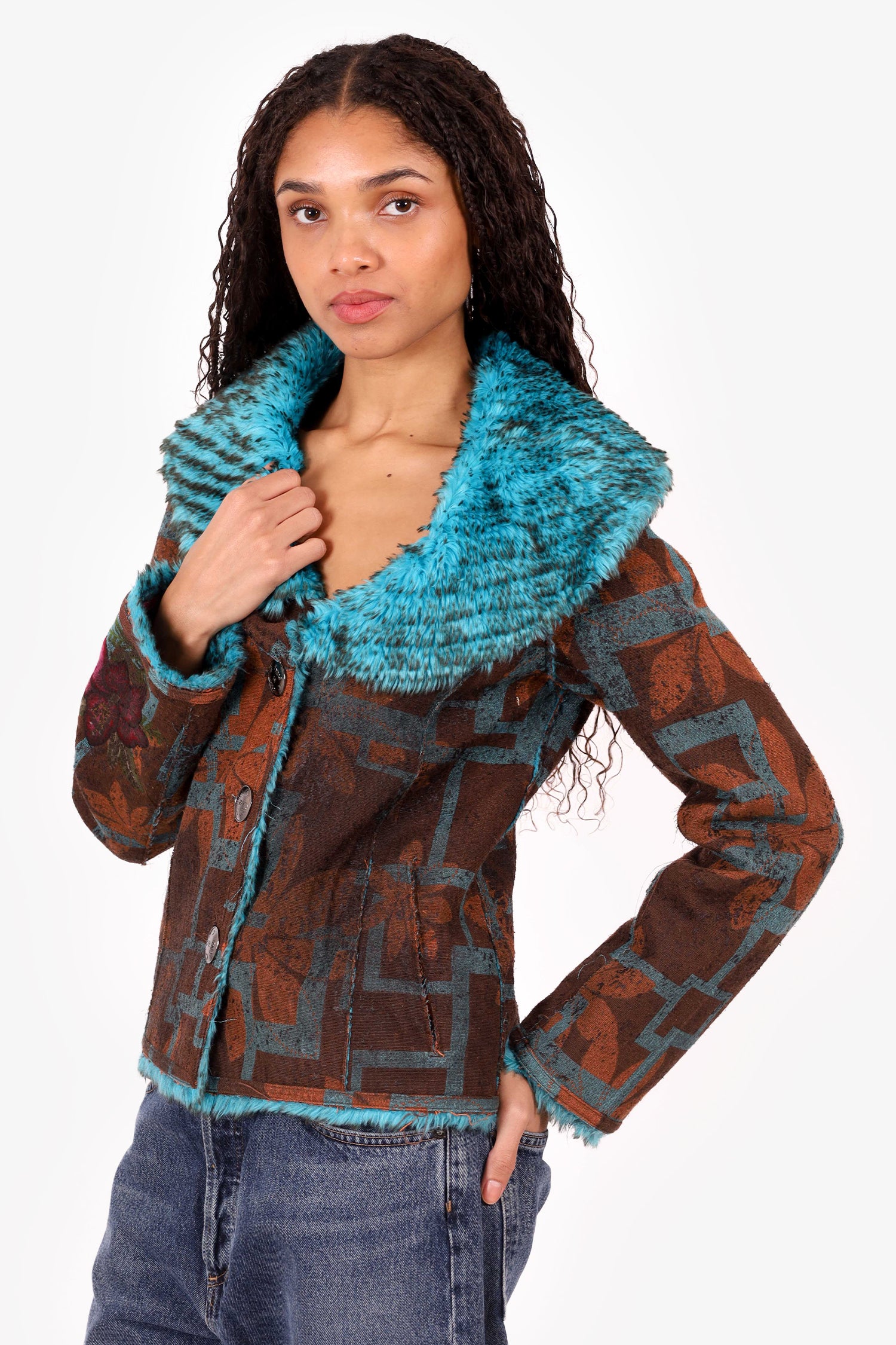 Balmain Brown/Blue Floral Embroidery Faux Fur Jacket Size 36