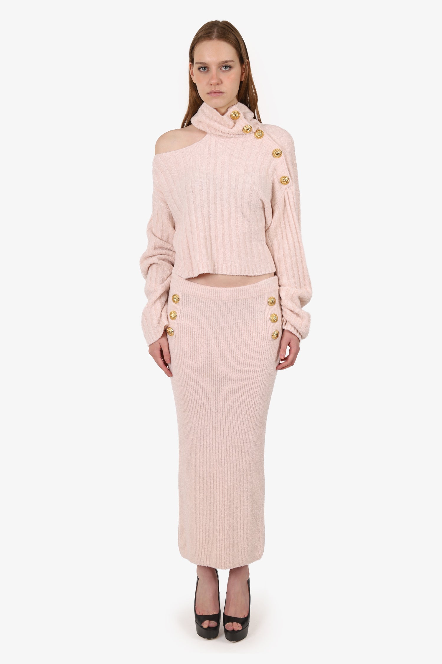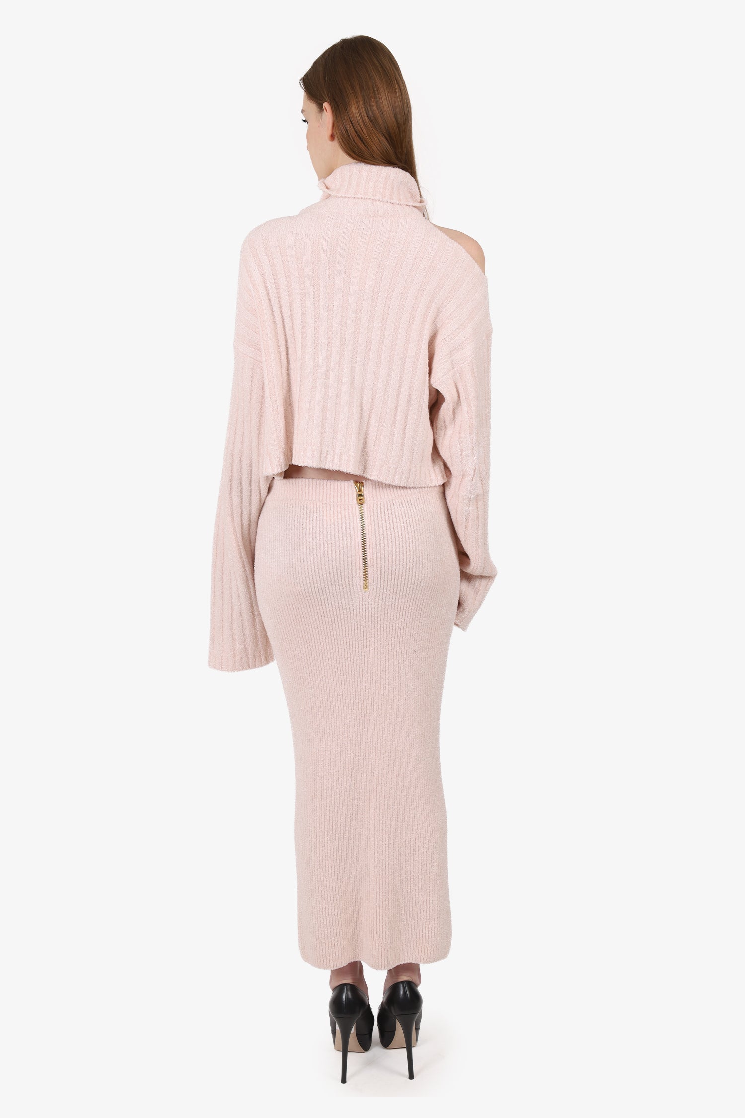 Balmain Pink Knit Long Sleeve Cropped Off Shoulder Turtleneck Sweater + Pencil Skirt Size 38