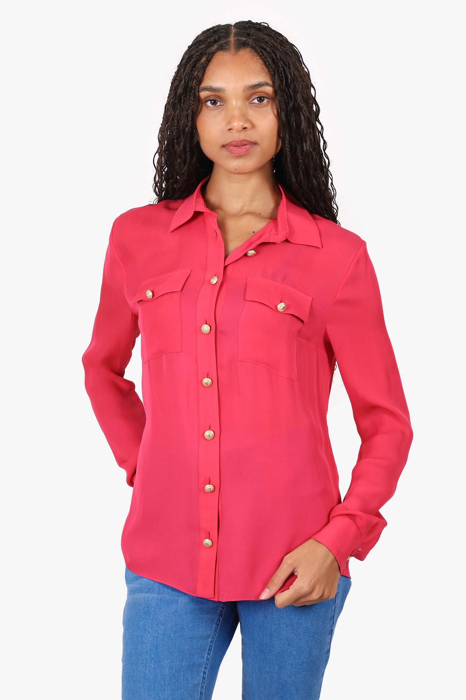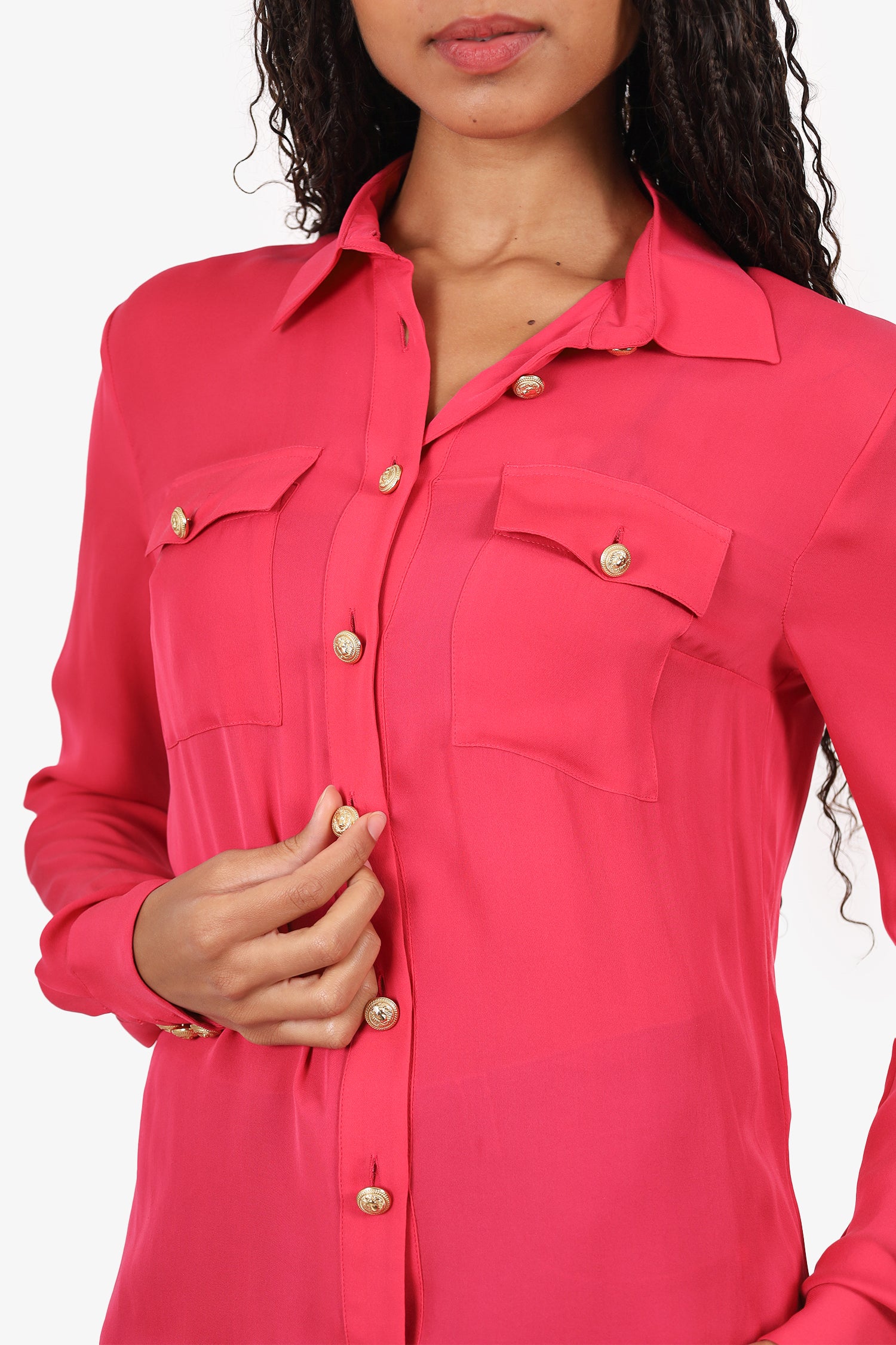 Refresh availabilityBalmain Pink Silk Button Down Shirt. Pull-on. Collared neckline. Front button-up closure. Sleeve cuffs with button-up closure. 2 front exterior flap pockets with button-up closure. Gold-tone hardware. Tonal stitching.