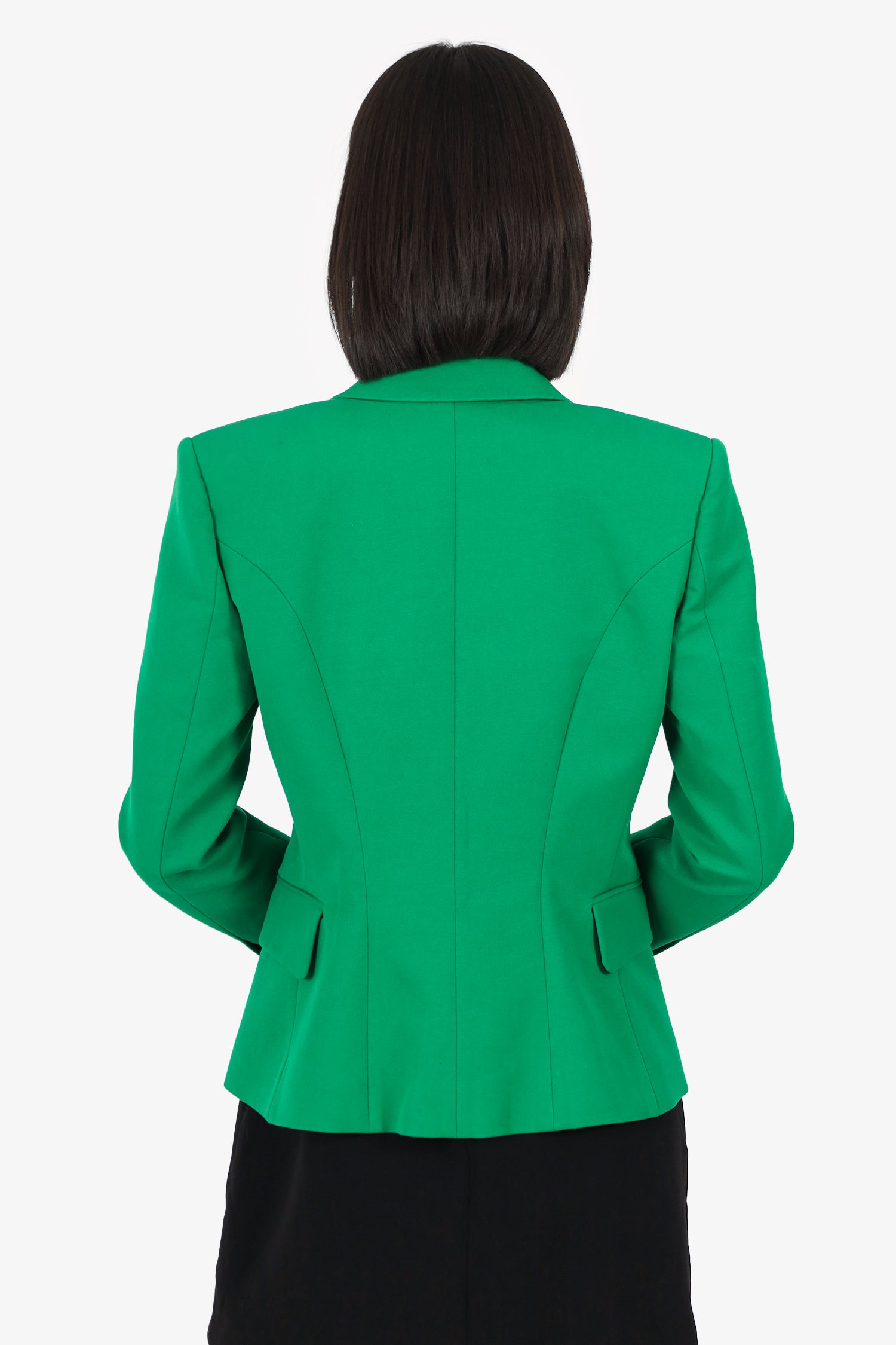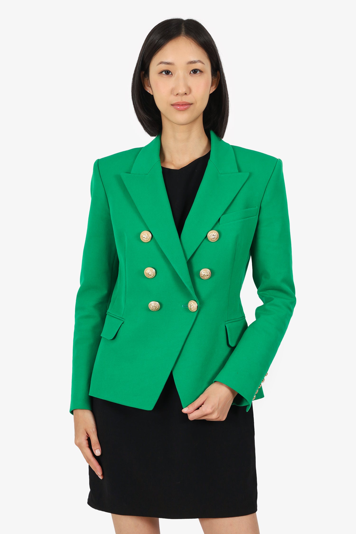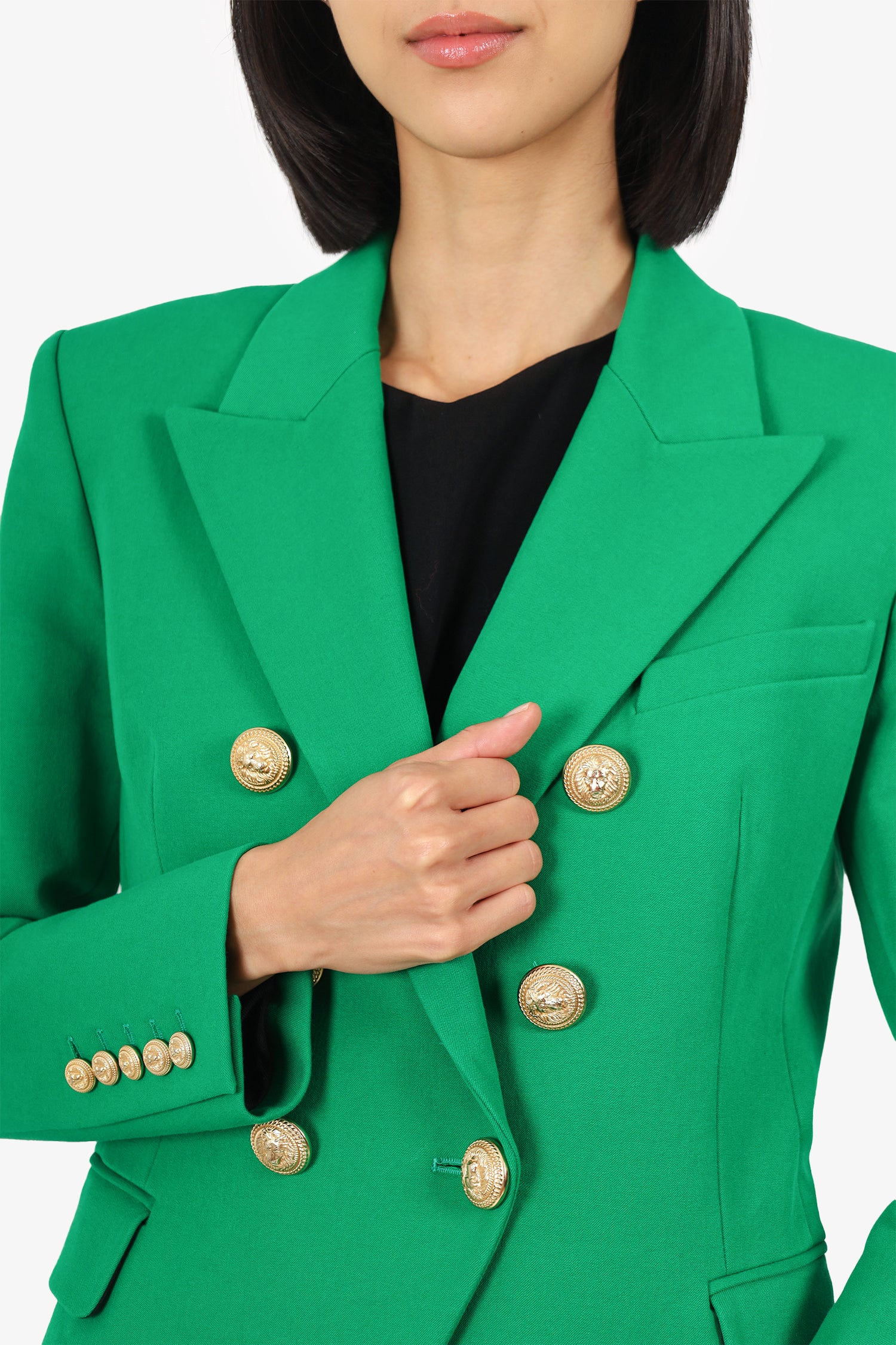 Refresh availabilityBalmain Green Wool Double Breasted Blazer. Pull-on. Peak lapel. Front button-up closure. Sleeve cuffs with button-up closure. 3 exterior pockets; 2 flap and 1 slip. Lined interior. Shoulder pads. Gold-tone hardware. Tonal stitching.
