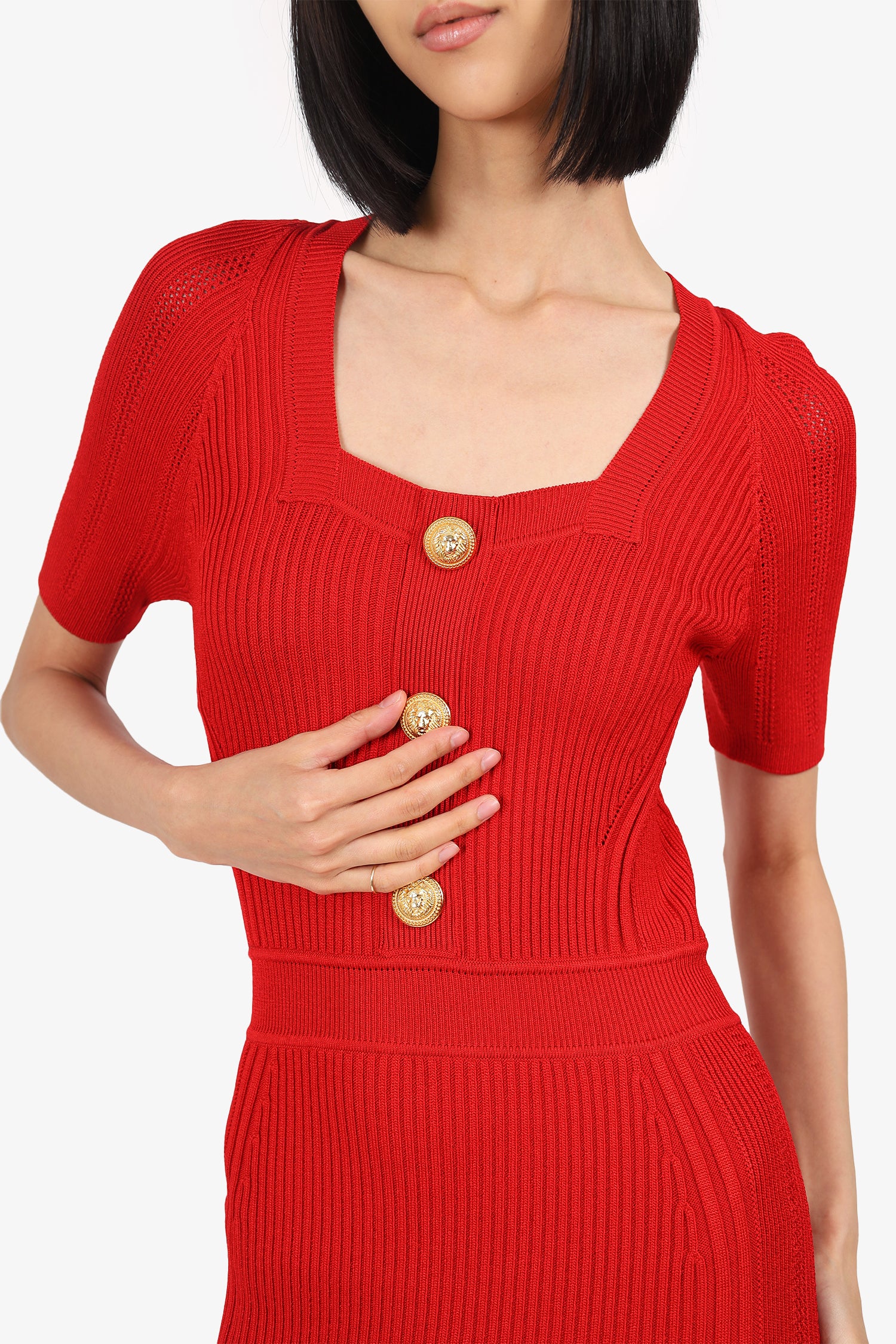 Refresh availabilityBalmain Red Button-embellished Ribbed Knit Midi Dress. Slip-on. Square neckline. Rear zip closure. Button details at front centre exterior. Gold-tone hardware. Tonal stitching.