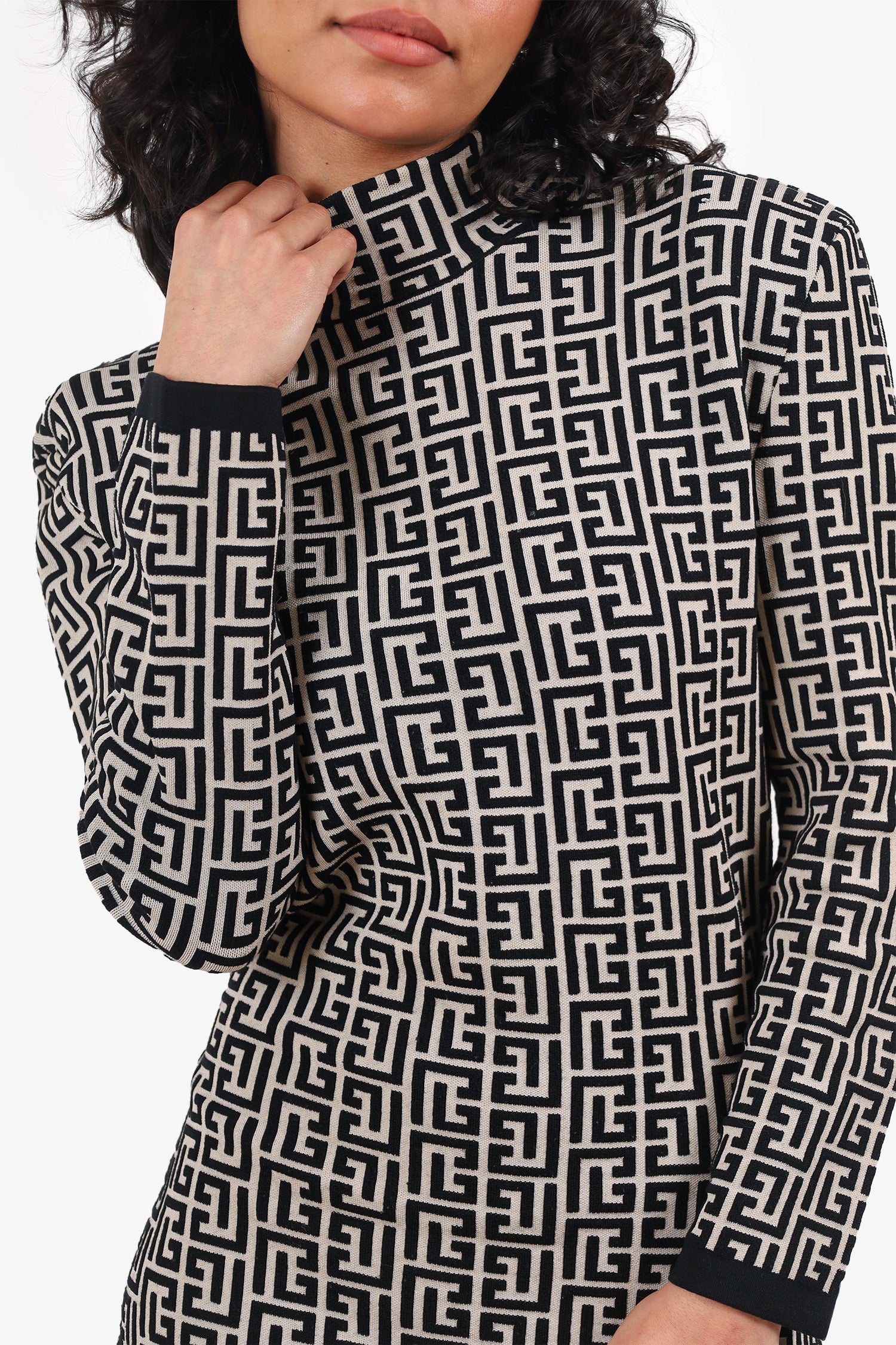 Refresh availabilityBalmain White/Black All-Over Logo Print Bodycon Dress. Slip-on. Mock-neckline. Rear zip closure. Tonal stitching.