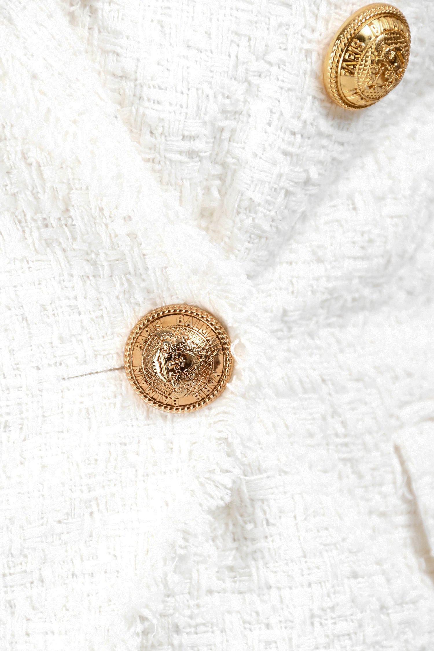 Refresh availabilityBalmain White Cotton Blend Tweed Double Breasted Blazer. Front button-up closure. Front pockets. Lined. Padded shoulders. Button closures on the cuffs.