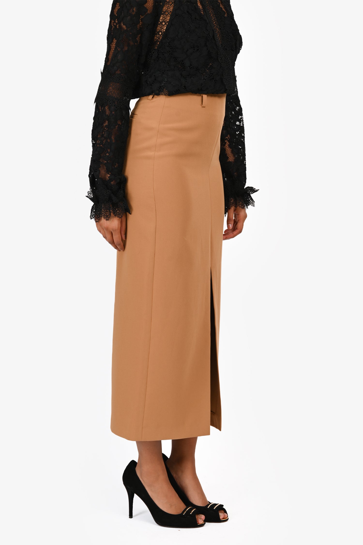 Refresh availabilityba&sh Camel 'Chirli' Midi Skirt. Pull-on. Hidden zipper and hook-and-eye closure on the side. Belt loops at the waist. 2 welt pockets in the back. Slit detailing in the front. Tonal stitching.