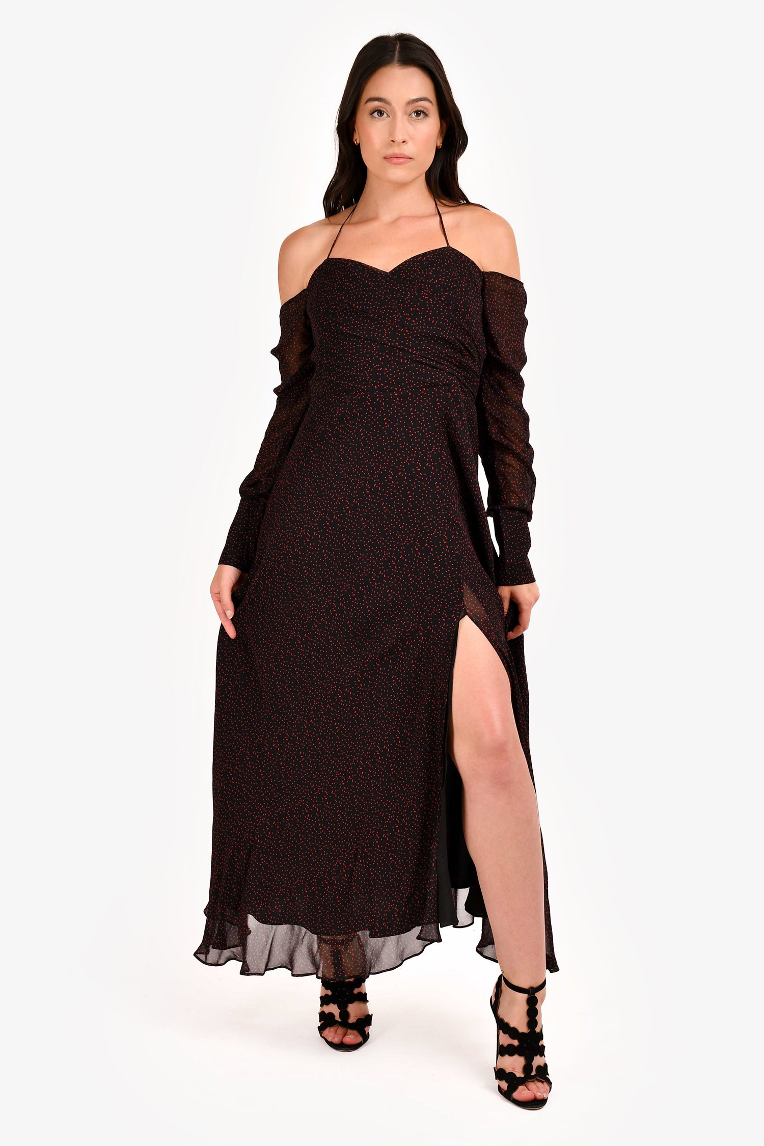Refresh availabilityBec + Bridge Black/Red Polkadot Cold Shoulder Slit Midi Dress. Side slit. Back zip closure. Fully lined. Tonal stitching.