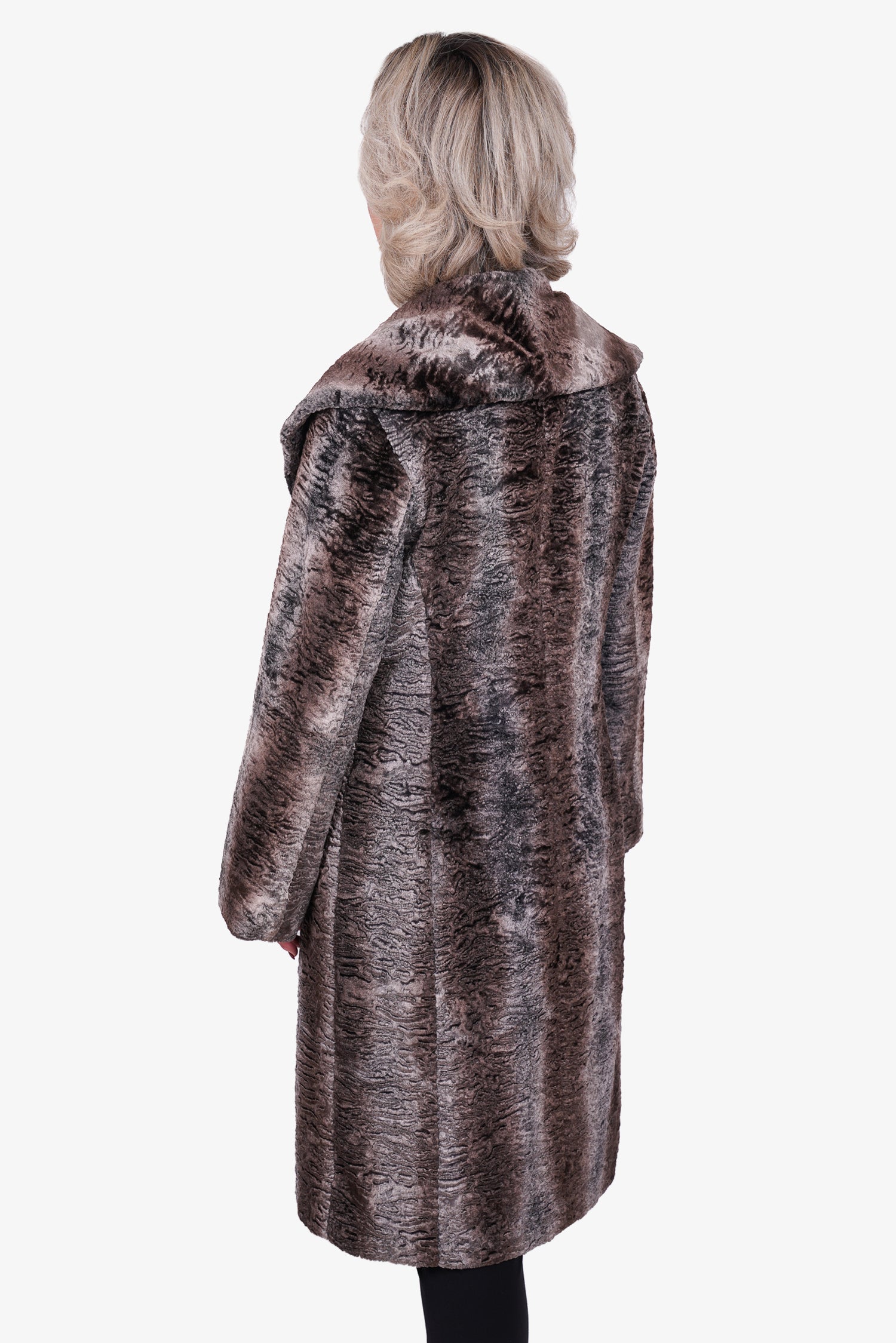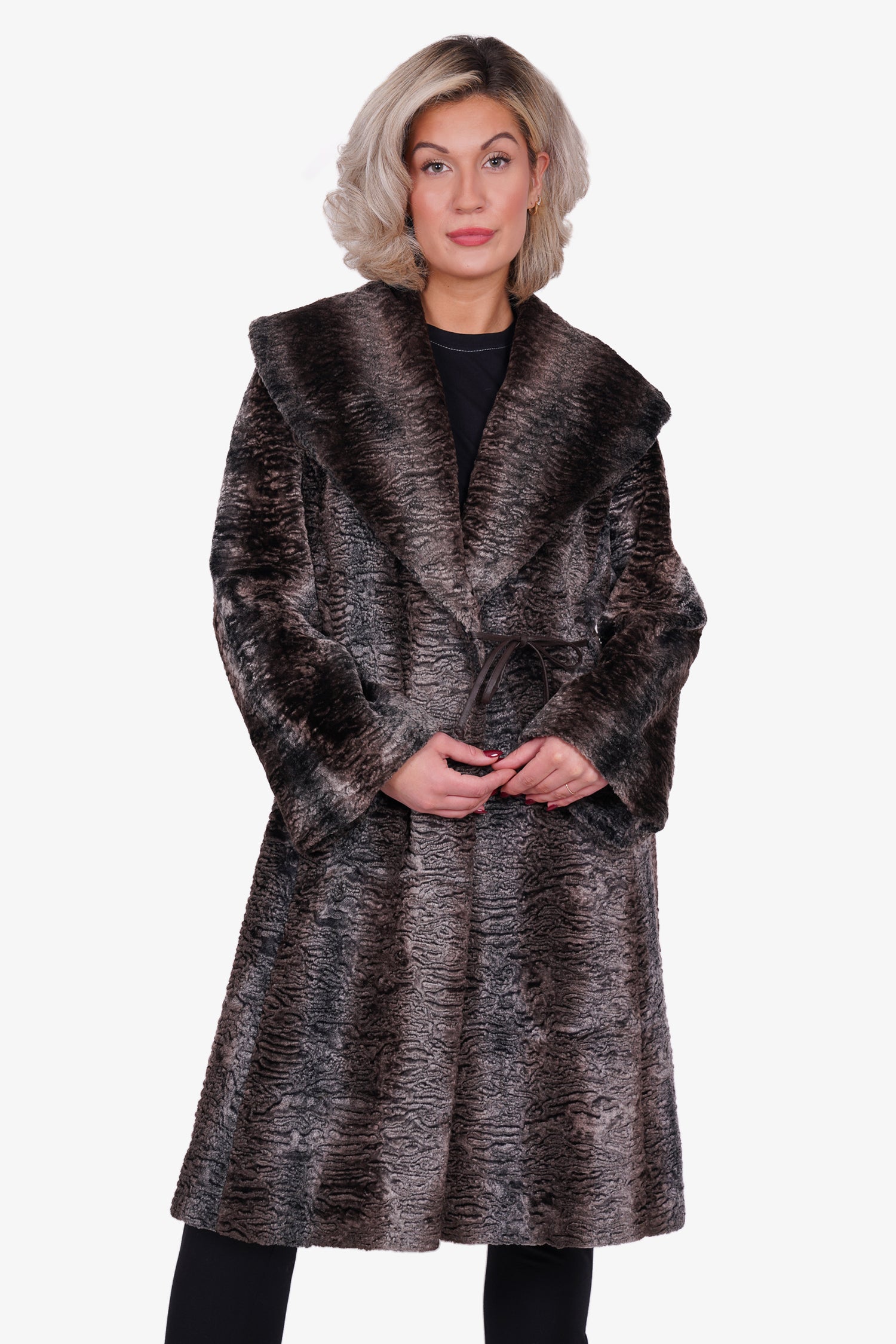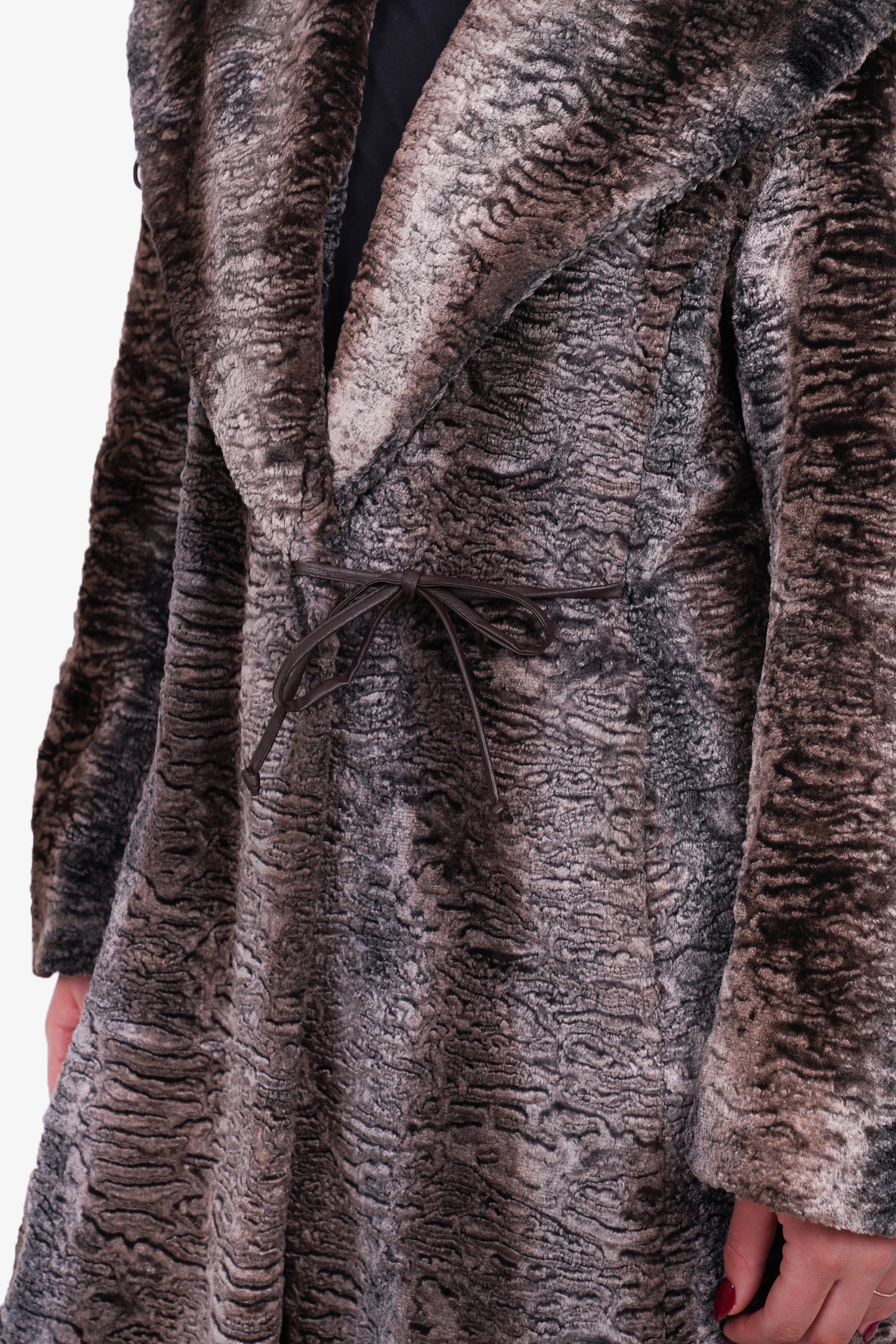 Refresh availabilityBill Blass Grey/Brown Long Faux Fur Coat. One button closure with tie. Front pockets. Lined. Tonal stitching.