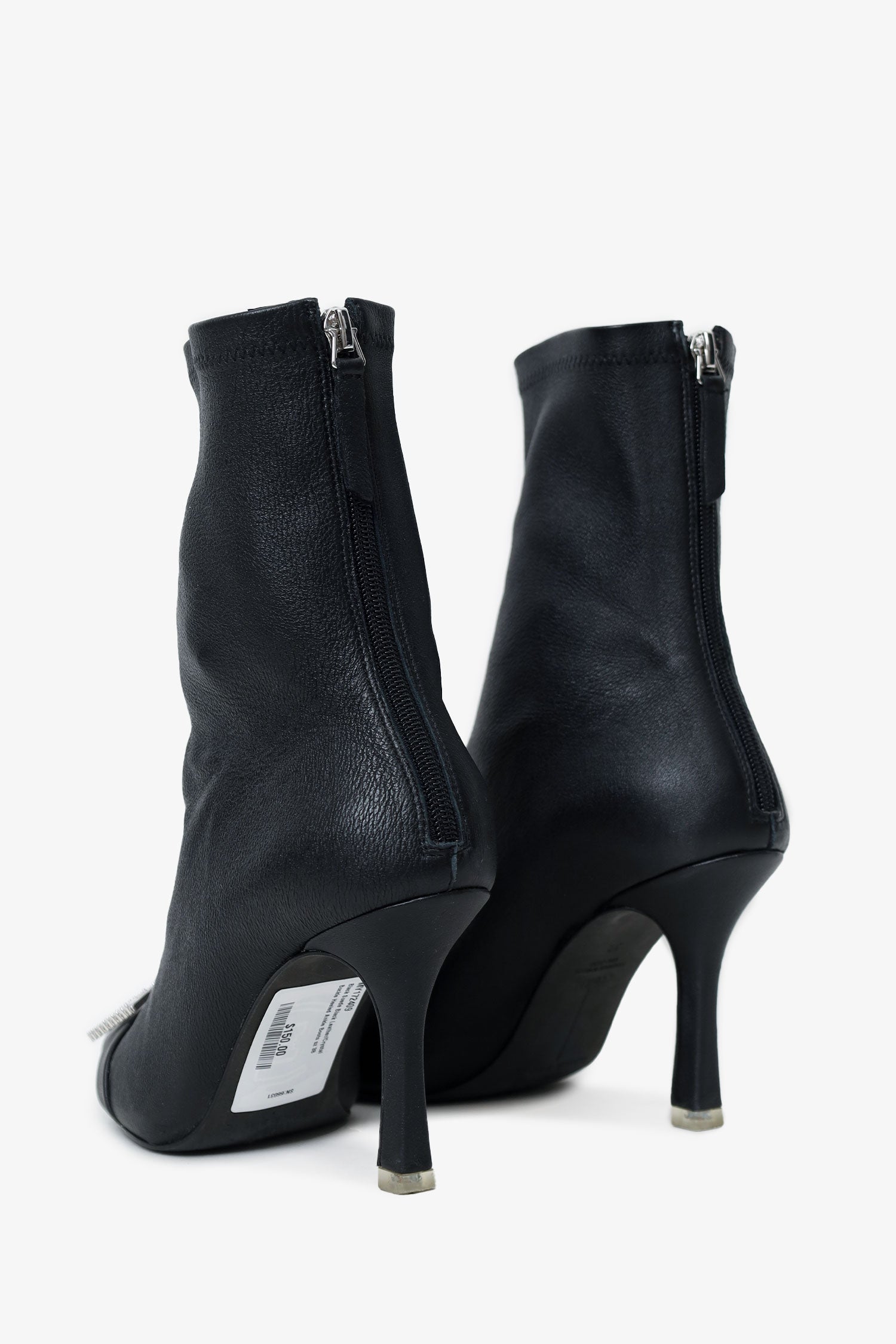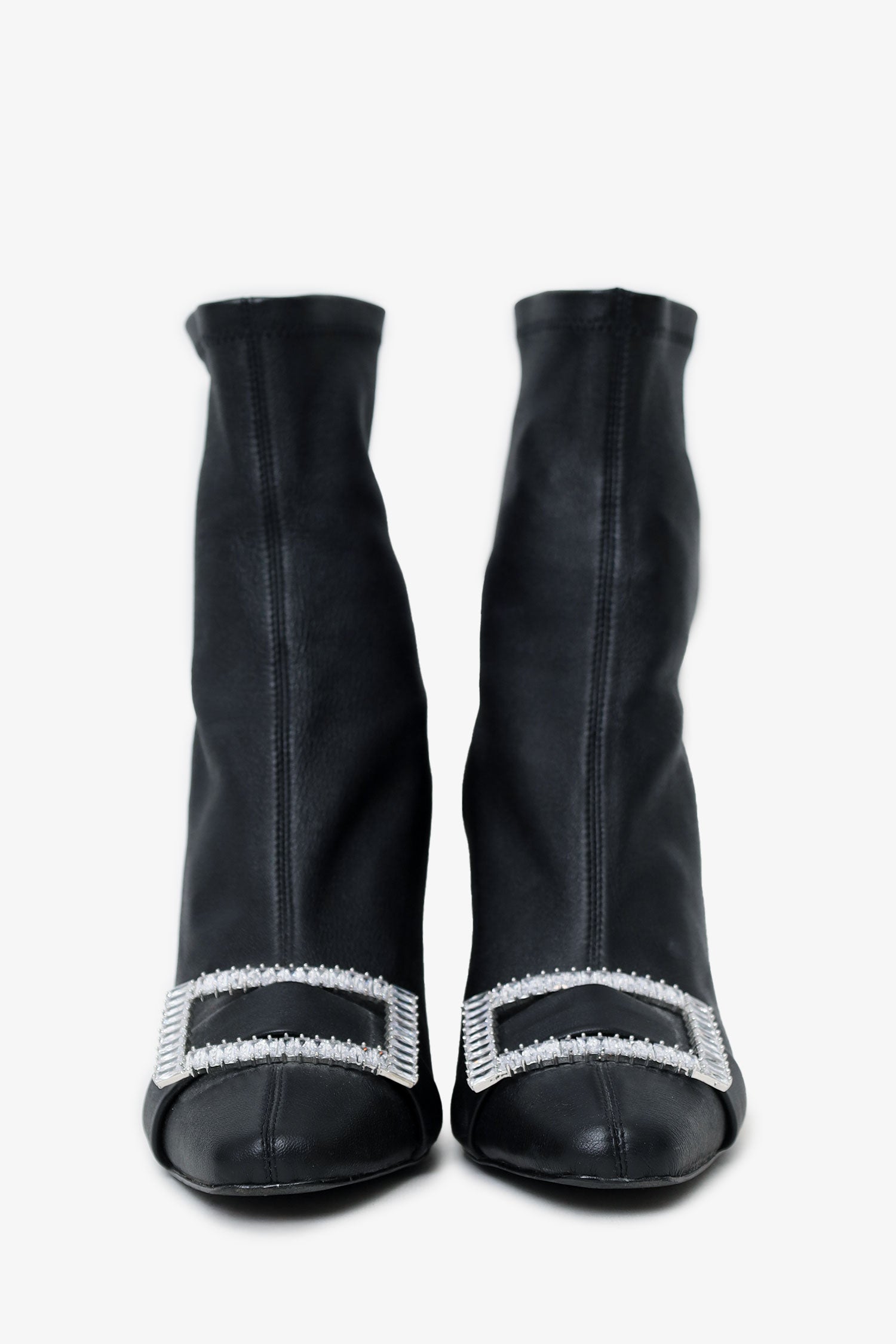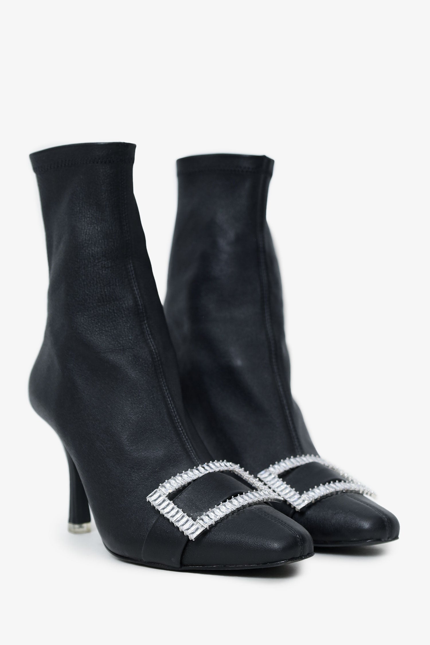 Refresh availabilityBlack Suede Black Leather/Crystal Buckle Heeled Ankle Boots. Pull on. Rear zip closure. Square-pointed toe. Tonal stitching. Silver-tone hardware.
